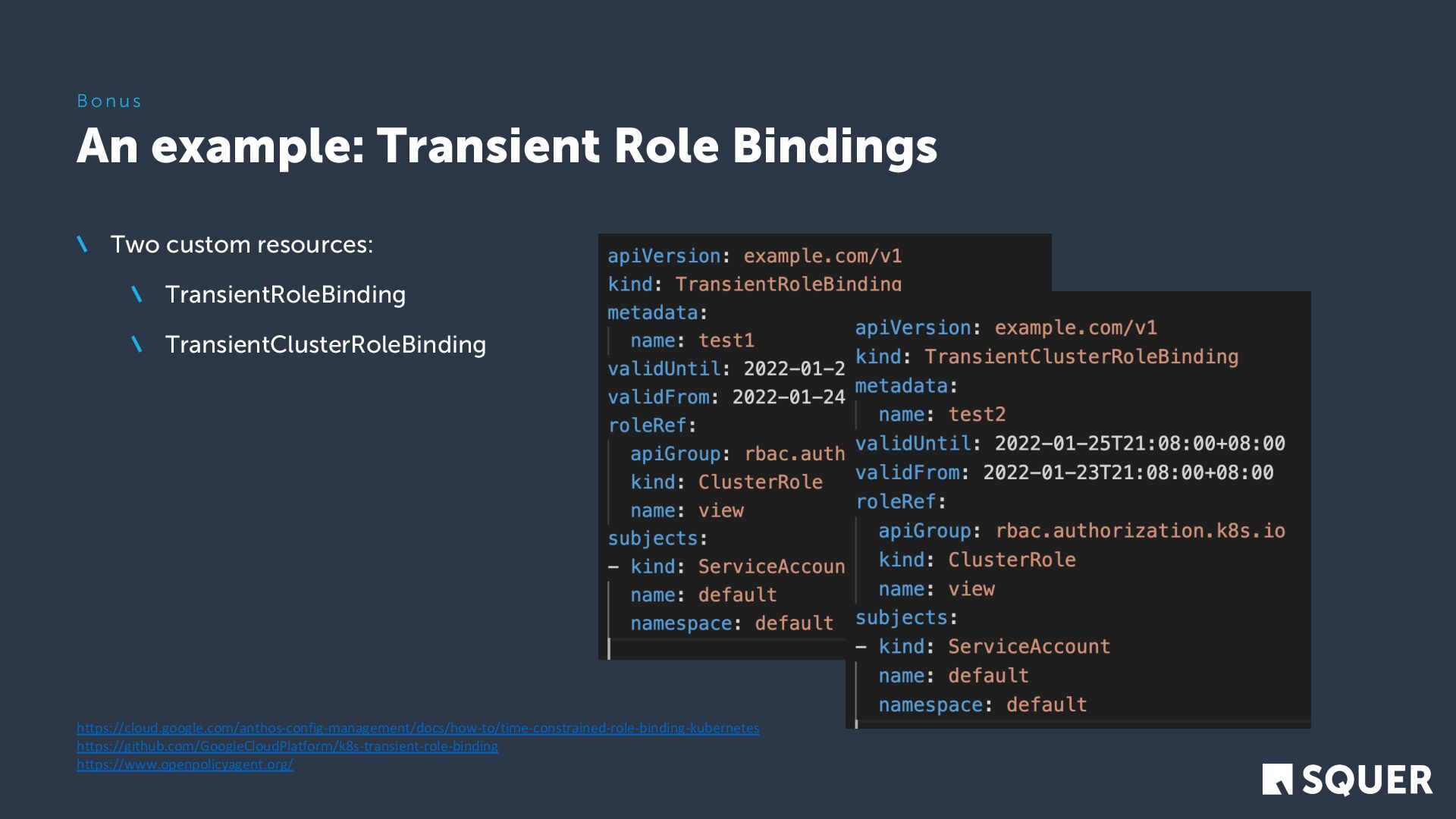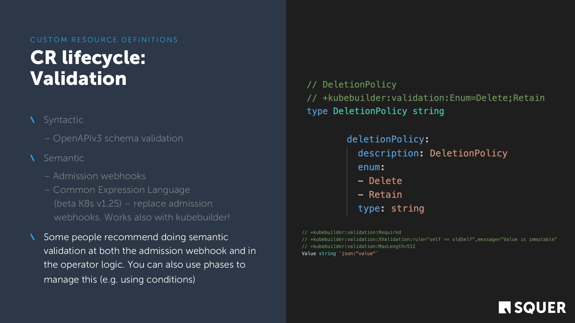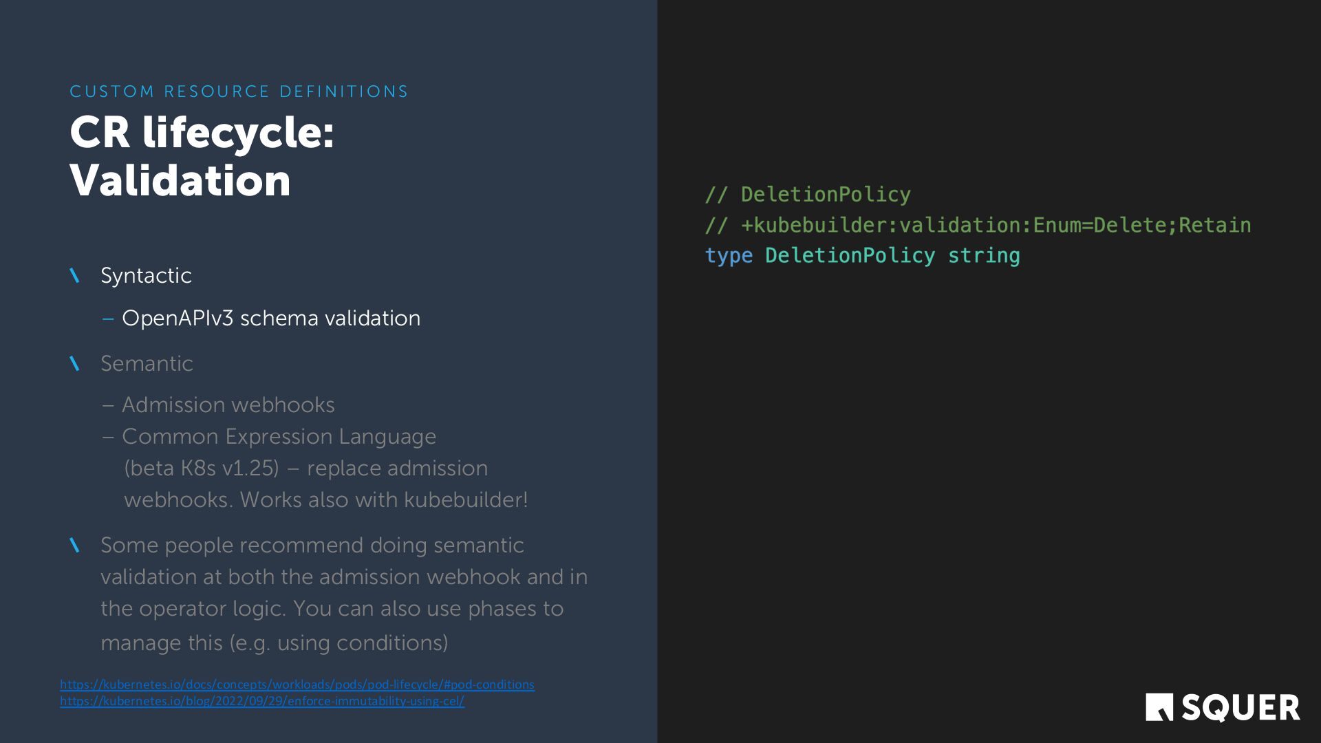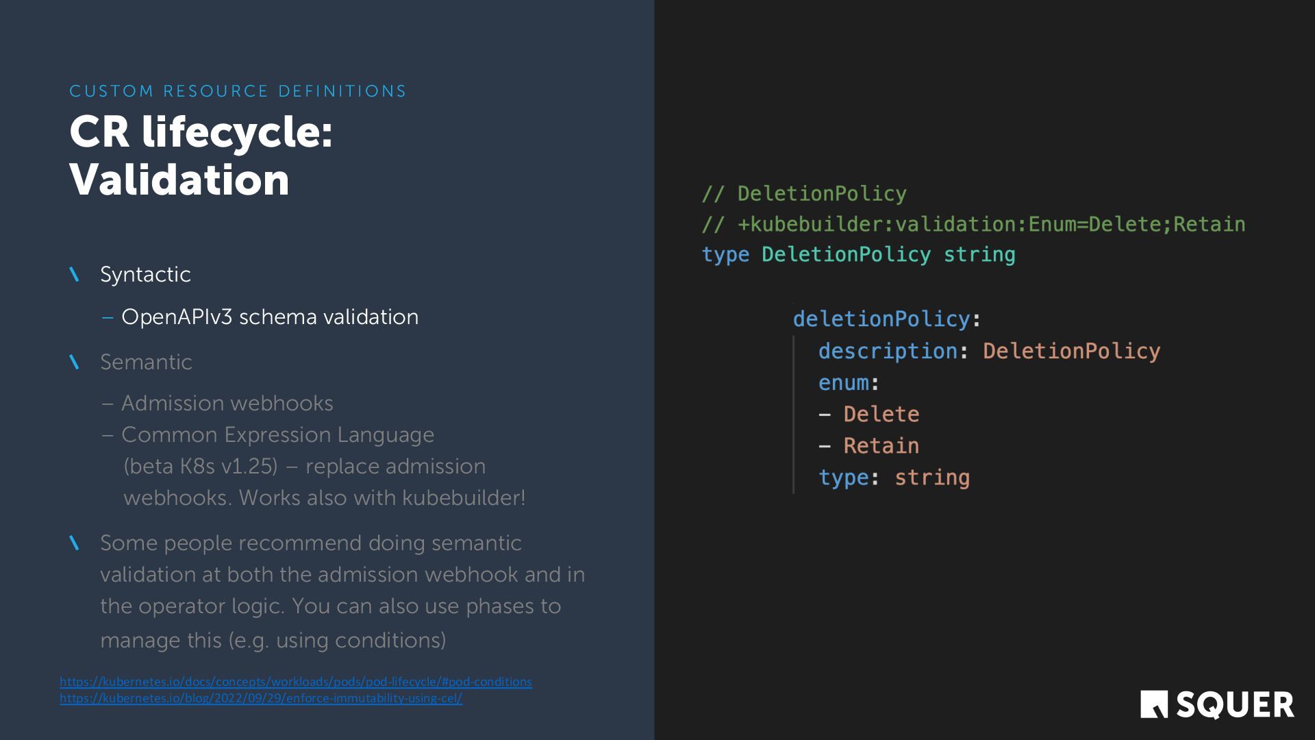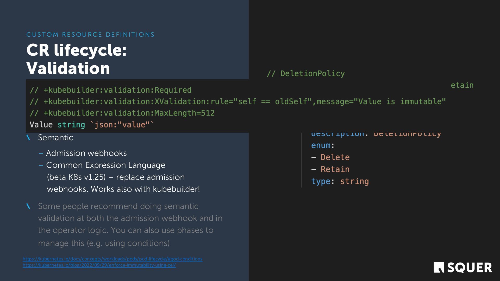 * Admission/mutating webhooks and schema validation (including Common Expression Language)