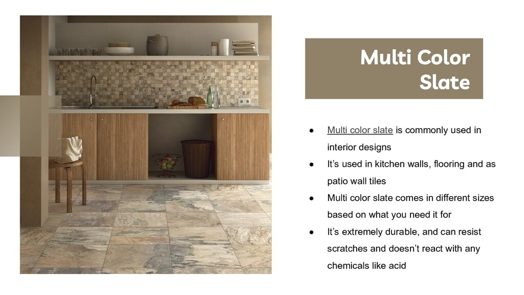 Slate is made up of natural stone tiles used as roofing and wall mount tiles. The unique property of the tiles delivers more beauty to the home, both interior and exterior. There are multiple colours of slate available with various design patterns. The slide describes multi colour slate and its usage. For more details, visit the link https://www.ncslate.com/products/slate-colors/multi-colored-custom-blend/