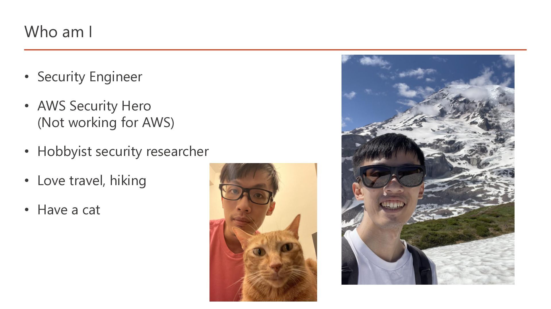 (Not working for AWS) • Hobbyist security researcher • Love travel, hiking • Have a cat