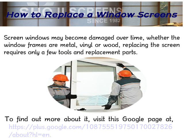 damaged over time, whether the window frames are metal, vinyl or wood, replacing the screen requires only a few tools and replacement parts. To find out more about it, visit this Google page at, https://plus.google.com/108755519750170027826 /about?hl=en.