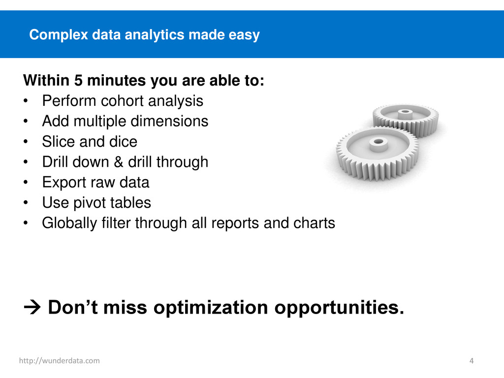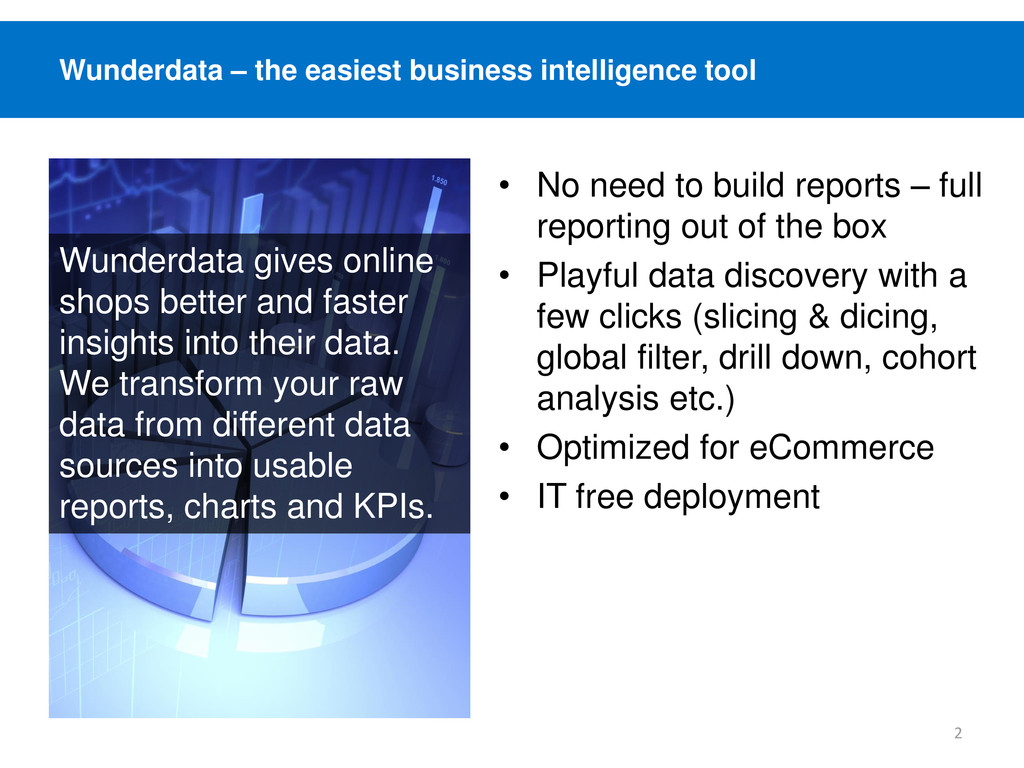 to build reports – full reporting out of the box • Playful data discovery with a few clicks (slicing & dicing, global filter, drill down, cohort analysis etc.) • Optimized for eCommerce • IT free deployment Wunderdata gives online shops better and faster insights into their data. We transform your raw data from different data sources into usable reports, charts and KPIs. 2