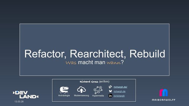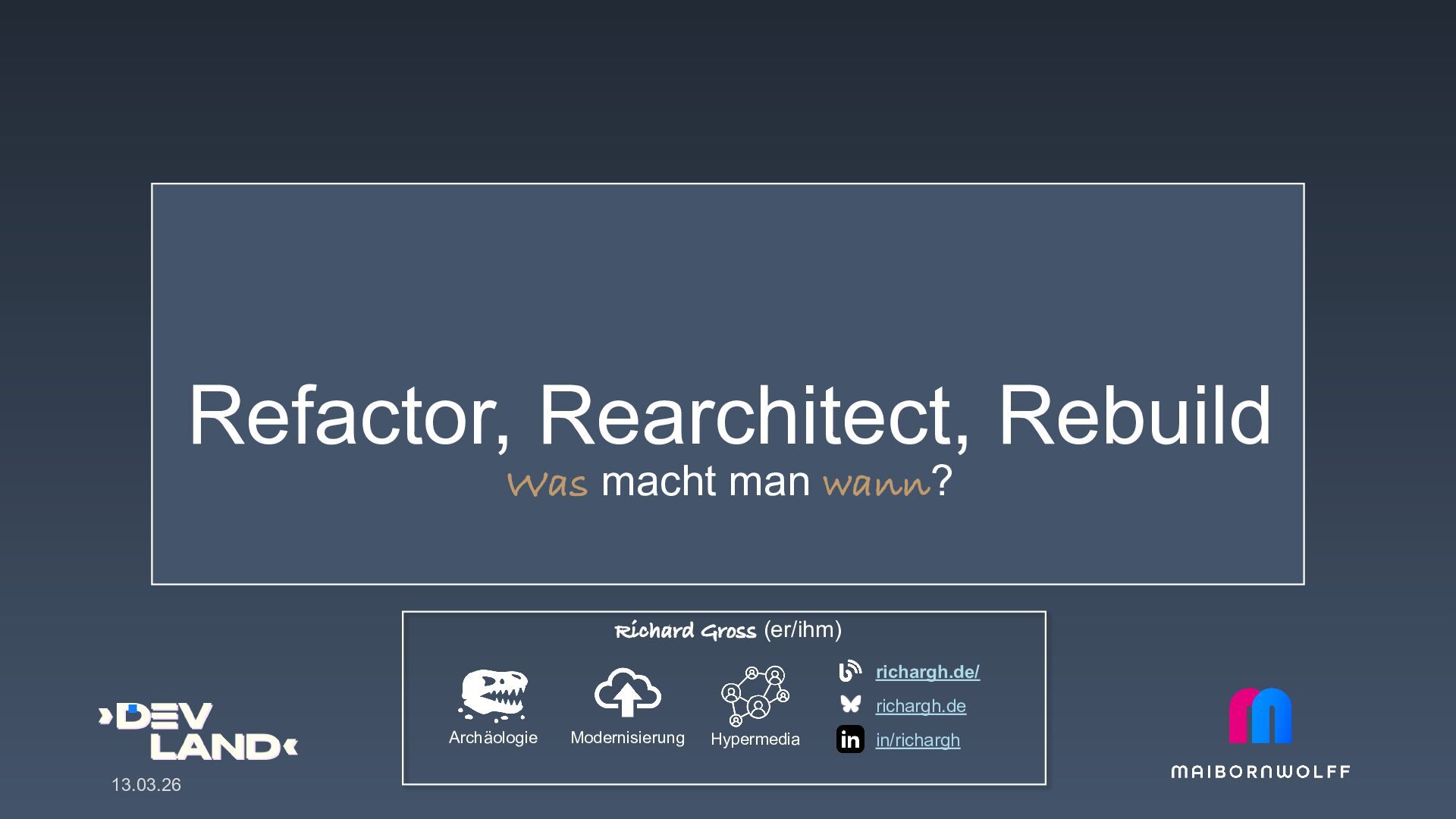 Viele Wege führen zur Modernisierung von Software – doch welche Strategie ist wann sinnvoll? "Refactor, Rearchitect, Rebuild" und ihre Verwandten sind Schlagworte, aber hinter jedem Ansatz stehen unterschiedliche Voraussetzungen und Ziele. In diesem Vortrag beleuchten wir, wie man den richtigen Zeitpunkt für die Erneuerung erkennt und mit welchen Methoden sich der aktuelle Zustand des Systems präzise erfassen lässt. Erst auf dieser Basis kann beurteilt werden, welche Modernisierungsstrategie – von gezielten Refactorings bis zum vollständigen Rebuild – am besten zum individuellen System und den zukünftigen Anforderungen passt.