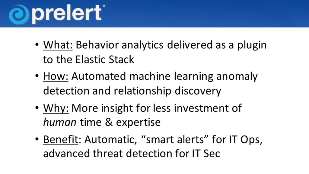 Presented at some MeetUps, this presentation describes the basics around how Prelert's Machine Learning Anomaly Detection adds value to data within the Elastic Stack. This behavior analytics solution allows for easier "automatic" alerts for IT Operations/APM/Log Management as well as advanced threat detection for Security Operations teams.