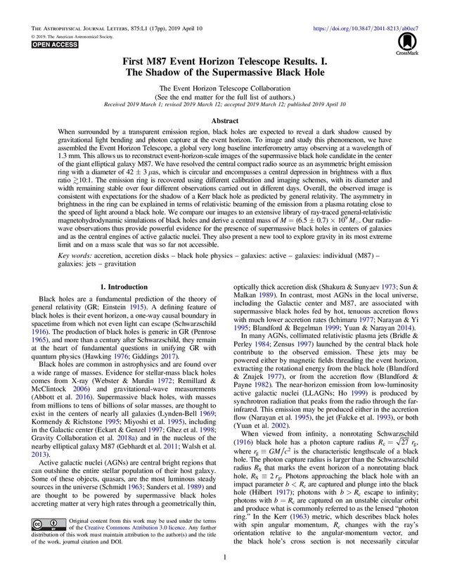 Smith https:/ /orcid.org/0000-0003-0692-8582 Anthony A. Stark https:/ /orcid.org/0000-0002-2718-9996 Sjoerd T. Timmer https:/ /orcid.org/0000-0003-0223-9368 Nathan Whitehorn https:/ /orcid.org/0000-0002-3157-0407 Jan G. A. Wouterloot https:/ /orcid.org/0000-0002- 4694-6905 Melvin Wright https:/ /orcid.org/0000-0002-9154-2440 Paul Yamaguchi https:/ /orcid.org/0000-0002-6017-8199 Shuo Zhang https:/ /orcid.org/0000-0002-2967-790X Lucy Ziurys https:/ /orcid.org/0000-0002-1805-3886 References Abbott, B. P., Abbott, R., Abbott, T. D., et al. 2016, PhRvL, 116, 061102 Abramowski, A., Acero, F., Aharonian, F., et al. 2012, ApJ, 746, 151 Akiyama, K., Kuramochi, K., Ikeda, S., et al. 2017, ApJ, 838, 1 Akiyama, K., Lu, R.-S., Fish, V. L., et al. 2015, ApJ, 807, 150 Asada, K., & Nakamura, M. 2012, ApJL, 745, L28 Baade, W., & Minkowski, R. 1954, ApJ, 119, 215 Baars, J. W. M., Martin, R. N., Mangum, J. G., McMullin, J. P., & Peters, W. L. 1999, PASP, 111, 627 Balbus, S. A., & Hawley, J. F. 1991, ApJ, 376, 214 Balick, B., & Brown, R. L. 1974, ApJ, 194, 265 Bambi, C. 2013, PhRvD, 87, 107501 Bambi, C., & Freese, K. 2009, PhRvD, 79, 043002 Barausse, E., & Sotiriou, T. P. 2008, PhRvL, 101, 099001 Bardeen, J. M. 1973, in Black Holes, ed. C. DeWitt & B. S. DeWitt (New York: Gordon and Breach), 215 Berti, E., Barausse, E., Cardoso, V., et al. 2015, CQGra, 32, 243001 Bird, S., Harris, W. E., Blakeslee, J. P., & Flynn, C. 2010, A&A, 524, A71 Biretta, J. A., Sparks, W. B., & Macchetto, F. 1999, ApJ, 520, 621 Blackburn, L., Chan, C.-K., Crew, G. B., et al. 2019, arXiv:1903.08832 Blakeslee, J. P., Jordán, A., Mei, S., et al. 2009, ApJ, 694, 556 Blandford, R. D., & Begelman, M. C. 1999, MNRAS, 303, L1 Blandford, R. D., & Königl, A. 1979, ApJ, 232, 34 Blandford, R. D., & Payne, D. G. 1982, MNRAS, 199, 883 Blandford, R. D., & Znajek, R. L. 1977, MNRAS, 179, 433 Blecher, T., Deane, R., Bernardi, G., & Smirnov, O. 2017, MNRAS, 464, 143 Boccardi, B., Krichbaum, T. P., Ros, E., & Zensus, J. A. 2017, A&ARv, 25, 4 Bolton, J. G., Stanley, G. J., & Slee, O. B. 1949, Natur, 164, 101 Bouman, K. L., Johnson, M. D., Dalca, A. V., et al. 2018, IEEE Transactions on Computational Imaging, 4, 512 Bouman, K. L., Johnson, M. D., Zoran, D., et al. 2016, in The IEEE Conf. Computer Vision and Pattern Recognition (New York: IEEE), 913 Bower, G. C., Wright, M. C. H., Falcke, H., & Backer, D. C. 2003, ApJ, 588, 331 Bridle, A. H., & Perley, R. A. 1984, ARA&A, 22, 319 Broderick, A. E., Johannsen, T., Loeb, A., & Psaltis, D. 2014, ApJ, 784, 7 Broderick, A. E., & Loeb, A. 2005, MNRAS, 363, 353 Broderick, A. E., & Loeb, A. 2006, ApJL, 636, L109 Broderick, A. E., & Loeb, A. 2009, ApJ, 697, 1164 Broderick, A. E., & Narayan, R. 2006, ApJL, 638, L21 Broderick, A. E., Narayan, R., Kormendy, J., et al. 2015, ApJ, 805, 179 Bromley, B. C., Melia, F., & Liu, S. 2001, ApJL, 555, L83 Bronzwaer, T., Davelaar, J., Younsi, Z., et al. 2018, A&A, 613, A2 Cantiello, M., Blakeslee, J. P., Ferrarese, L., et al. 2018, ApJ, 856, 126 Chael, A., Narayan, R., & Johnson, M. D. 2018a, arXiv:1810.01983 Chael, A. A., Johnson, M. D., Bouman, K. L., et al. 2018b, ApJ, 857, 23 Chan, C.-K., Psaltis, D., Özel, F., Narayan, R., & Saowski, A. 2015, ApJ, 799, 1 Chirenti, C. B. M. H., & Rezzolla, L. 2007, CQGra, 24, 4191 Clark, B. G. 1980, A&A, 89, 377 Cohen, M. H., Moffet, A. T., Shaffer, D., et al. 1969, ApJL, 158, L83 Cunha, P. V. P., Grover, J., Herdeiro, C., et al. 2016, PhRvD, 94, 104023 Curtis, H. D. 1918, PLicO, 13, 9 Davelaar, J., Olivares, H., Porth, O., et al. 2019, A&A, submitted de Gasperin, F., Orrú, E., Murgia, M., et al. 2012, A&A, 547, A56 Deller, A. T., Tingay, S. J., Bailes, M., & West, C. 2007, PASP, 119, 318 Dexter, J., McKinney, J. C., & Agol, E. 2012, MNRAS, 421, 1517 Dibi, S., Drappeau, S., Fragile, P. C., Markoff, S., & Dexter, J. 2012, MNRAS, 426, 1928 Doeleman, S., Agol, E., Dacker, D., et al. 2009a, astro2010: The Astronomy and Astrophysics Decadal Survey, Vol. 2010 Doeleman, S. S., Fish, V. L., Broderick, A. E., Loeb, A., & Rogers, A. E. E. 2009b, ApJ, 695, 59 Doeleman, S. S., Fish, V. L., Schenck, D. E., et al. 2012, Sci, 338, 355 Doeleman, S. S., Shen, Z.-Q., Rogers, A. E. E., et al. 2001, AJ, 121, 2610 Doeleman, S. S., Weintroub, J., Rogers, A. E. E., et al. 2008, Natur, 455, 78 Eckart, A., & Genzel, R. 1997, MNRAS, 284, 576 EHT Collaboration et al. 2019a, ApJL, 875, L2 (Paper II) EHT Collaboration et al. 2019b, ApJL, 875, L3 (Paper III) EHT Collaboration et al. 2019c, ApJL, 875, L4 (Paper IV) EHT Collaboration et al. 2019d, ApJL, 875, L5 (Paper V) EHT Collaboration et al. 2019e, ApJL, 875, L6 (Paper VI) Einstein, A. 1915, Sitzungsberichte der Königlich Preußischen Akademie der Wissenschaften (Berlin: Deutsche Akademie der Wissenschaften zu Berlin) Falcke, H., Körding, E., & Markoff, S. 2004, A&A, 414, 895 Falcke, H., Mannheim, K., & Biermann, P. L. 1993, A&A, 278, L1 Falcke, H., Melia, F., & Agol, E. 2000a, ApJL, 528, L13 Falcke, H., Melia, F., & Agol, E. 2000b, in AIP Conf. Ser. 522, Cosmic Explosions, ed. S. Holt & W. Zhang (Melville, NY: AIP), 317 Fish, V., Shea, M., & Akiyama, K. 2019, AdSpR, in press (arXiv:1903.09539) Fish, V. L., Johnson, M. D., Doeleman, S. S., et al. 2016, ApJ, 820, 90 Ford, H. C., Harms, R. J., Tsvetanov, Z. I., et al. 1994, ApJL, 435, L27 Gammie, C. F., McKinney, J. C., & Tóth, G. 2003, ApJ, 589, 444 Gebhardt, K., Adams, J., Richstone, D., et al. 2011, ApJ, 729, 119 Gebhardt, K., & Thomas, J. 2009, ApJ, 700, 1690 Ghez, A. M., Klein, B. L., Morris, M., & Becklin, E. E. 1998, ApJ, 509, 678 Giddings, S. B. 2017, NatAs, 1, 0067 Goddi, C., Marti-Vidal, I., Messias, H., et al. 2019, PASP, in press Gold, R., Broderick, A., Younsi, Z., et al. 2019, ApJS Gravity Collaboration, Abuter, R., Amorim, A., et al. 2018a, A&A, 615, L15 Gravity Collaboration, Abuter, R., Amorim, A., et al. 2018b, A&A, 618, L10 Greisen, E. W. 2003, in Information Handling in Astronomy—Historical Vistas, Astrophysics and Space Science Library, Vol. 