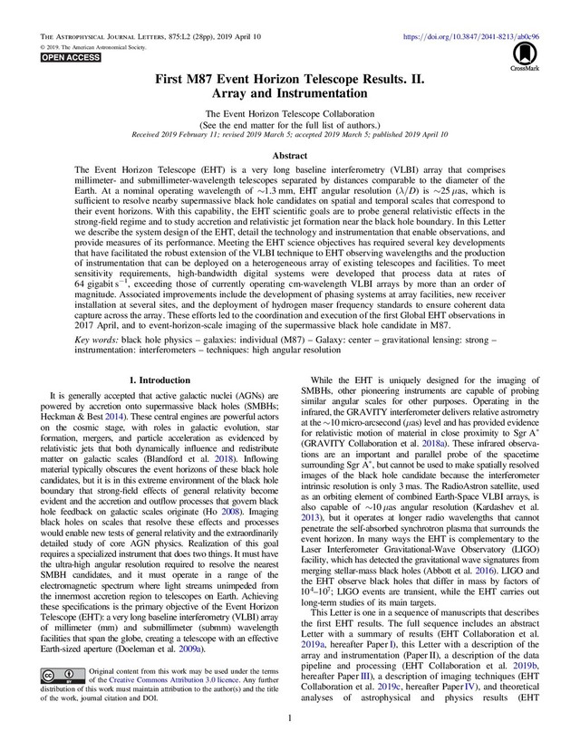 ARA&A, 46, 475 Ho, P. T. P., Moran, J. M., & Lo, K. Y. 2004, ApJL, 616, L1 Honma, M., Akiyama, K., Uemura, M., & Ikeda, S. 2014, PASJ, 66, 95 Inoue, M., Algaba-Marcos, J. C., Asada, K., et al. 2014, RaSc, 49, 564 Issaoun, S., Johnson, M. D., Blackburn, L., et al. 2019, ApJ, 871, 30 Janssen, M., Goddi, C., van Bemmel, I. M., et al. 2019, A&A, submitted (arXiv:1902.01749) Jiang, H., Liu, H., Guzzino, K., et al. 2014, PASP, 126, 761 Johannsen, T., & Psaltis, D. 2010, ApJ, 718, 446 Johannsen, T., Psaltis, D., Gillessen, S., et al. 2012, ApJ, 758, 30 Johnson, M. D., Fish, V. L., Doeleman, S. S., et al. 2015, Sci, 350, 1242 Johnson, M. D., Narayan, R., Psaltis, D., et al. 2018, ApJ, 865, 104 Kardashev, N. S., Khartov, V. V., Abramov, V. V., et al. 2013, ARep, 57, 153 Kerr, A. R., Pan, S.-K., Claude, S. M. X., et al. 2014, ITTST, 4, 201 Kim, J., Marrone, D. P., Beaudoin, C., et al. 2018a, Proc. SPIE, 10708, 107082S Kim, J., Marrone, D. P., Roy, A. L., et al. 2018b, ApJ, 861, 129 Krichbaum, T. P., Graham, D. A., Alef, W., et al. 2002, in Proc. 6th EVN Symp., ed. E. Ros et al. (Bonn: Max-Planck-Institut für Radioastronomie),125 Krichbaum, T. P., Graham, D. A., Witzel, A., et al. 1998, A&A, 335, L106 Kubo, D., Han, C.-C., Nishioka, H., et al. 2018, Proc. SPIE, 10708, 1070816 Kuo, C. Y., Asada, K., Rao, R., et al. 2014, ApJL, 783, L33 Kuramochi, K., Akiyama, K., Ikeda, S., et al. 2018, ApJ, 858, 56 Lambert, S. B., & Gontier, A.-M. 2009, A&A, 493, 317 Lo, K. Y., Shen, Z.-Q., Zhao, J.-H., & Ho, P. T. P. 1998, ApJL, 508, L61 Lu, R.-S., Broderick, A. E., Baron, F., et al. 2014, ApJ, 788, 120 Lu, R.-S., Krichbaum, T. P., Eckart, A., et al. 2011, A&A, 525, A76 Lu, R.-S., Krichbaum, T. P., Roy, A. L., et al. 2018, ApJ, 859, 60 Luminet, J.-P. 1979, A&A, 75, 228 Maier, D. 2009, EAS, 37, 49 Mangum, J. G., Baars, J. W. M., Greve, A., et al. 2006, PASP, 118, 1257 Marrone, D. P., Moran, J. M., Zhao, J.-H., & Rao, R. 2007, ApJL, 654, L57 Marrone, D. P., Tilanus, R. P. J., & Doeleman, S. S. 2014, EHT Memo Series, 2014-ETWG-01 Martí-Vidal, I., Roy, A., Conway, J., & Zensus, A. J. 2016, A&A, 587, A143 Matsushita, S., Asada, K., Martin-Cocher, P. L., et al. 2017, PASP, 129, 025001 Matthews, L. D., Crew, G. B., Doeleman, S. S., et al. 2018, PASP, 130, 015002 Medeiros, L., Chan, C.-K., Özel, F., et al. 2017, ApJ, 844, 35 Moritz, H. 2000, JGeod, 74, 128 Mościbrodzka, M., Gammie, C. F., Dolence, J. C., Shiokawa, H., & Leung, P. K. 2009, ApJ, 706, 497 Napier, P. J., Bagri, D. S., Clark, B. G., et al. 1994, IEEEP, 82, 658 Narayan, R., & McClintock, J. E. 2008, NewAR, 51, 733 Narayan, R., & Nityananda, R. 1986, ARA&A, 24, 127 Ortiz-León, G. N., Johnson, M. D., Doeleman, S. S., et al. 2016, ApJ, 824, 40 Padin, S., Woody, D. P., Hodges, M. W., et al. 1990, ApJL, 360, L11 Patel, N. A., Wilson, R. W., Primiani, R., et al. 2014, JAI, 3, 1450001 Phillips, T., Woody, D., Dolan, G. R. M., & Linke, R. 1981, ITM, 17, 684 Primiani, R. A., Young, K. H., Young, A., et al. 2016, JAI, 5, 1641006 Psaltis, D., Johnson, M., Narayan, R., et al. 2018, arXiv:1805.01242 Reid, M. J., & Brunthaler, A. 2004, ApJ, 616, 872 Reid, M. J., Menten, K. M., Brunthaler, A., et al. 2014, ApJ, 783, 130 Ricarte, A., & Dexter, J. 2015, MNRAS, 446, 1973 Roelofs, F., Johnson, M. D., Shiokawa, H., Doeleman, S. S., & Falcke, H. 2017, ApJ, 847, 55 Rogers, A. E. E., Moffet, A. T., Backer, D. C., & Moran, J. M. 1984, RaSc, 19, 1552 Rogers, A. E. E., & Moran, J. M., Jr. 1981, ITIM, 30, 283 Shen, Z.-Q., Lo, K. Y., Liang, M.-C., Ho, P. T. P., & Zhao, J.-H. 2005, Natur, 438, 62 Takahashi, R. 2004, ApJ, 611, 996 Thompson, A. R., Moran, J. M., & Swenson, G. W., Jr. 2017, Interferometry and Synthesis in Radio Astronomy (3rd ed.; Berlin: Springer) Tilanus, R. P. J., Marrone, D. P., Fish, V. L., et al. 2013, EHT Memo Series, 2013-ETWG-01 Tong, C. E., Grimes, P., Blundell, R., Wang, M., & Noguchi, T. 2013, ITTST, 3, 428 Tuccari, G., Alef, W., Buttaccio, S., et al. 2014, in Int. VLBI Service for Geodesy and Astrometry 2014 General Meeting Proc.: “VGOS: The New VLBI Network”, ed. D. Behrend, K. D. Baver, & K. L. Armstrong (Beijing: Science Press), 86 Vertatschitsch, L., Primiani, R., Young, A., et al. 2015, PASP, 127, 1226 von Laue, M. 1921, Die Relativitätstheorie. Zweiter Band: Die Allgemeine Relativitätstheorie Und Einsteins Lehre Von Der Schwerkraft (Braunsweig: F. Vieweg & Sohn) Wagner, J., Roy, A. L., Krichbaum, T. P., et al. 2015, A&A, 581, A32 Walsh, J. L., Barth, A. J., Ho, L. C., & Sarzi, M. 2013, ApJ, 770, 86 Whitney, A., Kettenis, M., Phillips, C., & Sekido, M. 2009, in 8th Int. e-VLBI Workshop (Trieste: SISSA), 42 Whitney, A. R., Beaudoin, C. J., Cappallo, R. J., et al. 2013, PASP, 125, 196 Wootten, A., & Thompson, A. R. 2009, IEEEP, 97, 1463 Young, A., Primiani, R., Weintroub, J., et al. 2016, in 2016 IEEE Int. Symp. Phased Array Systems and Technology (PAST) (New York: IEEE), 1 The Event Horizon Telescope Collaboration, Kazunori Akiyama1,2,3,4 , Antxon Alberdi5 , Walter Alef6, Keiichi Asada7, Rebecca Azulay8,9,6 , Anne-Kathrin Baczko6 , David Ball10, Mislav Baloković4,11 , John Barrett2 , Dan Bintley12, Lindy Blackburn4,11 , Wilfred Boland13, Katherine L. Bouman4,11,14 , Geoffrey C. Bower15 , Michael Bremer16, Christiaan D. Brinkerink17 , Roger Brissenden4,11 , Silke Britzen6 , Avery E. Broderick18,19,20 , Dominique Broguiere16, Thomas Bronzwaer17, Do-Young Byun21,22 , John E. Carlstrom23,24,25,26, Andrew Chael4,11 , Chi-kwan Chan10,27 , Shami Chatterjee28 , Koushik Chatterjee29, Ming-Tang Chen15, Yongjun Chen (陈永军)30,31, Ilje Cho21,22 , Pierre Christian10,11 , John E. Conway32 , James M. Cordes28, Geoffrey B. Crew2 , Yuzhu Cui33,34 , Jordy Davelaar17 , Mariafelicia De Laurentis35,36,37 , Roger Deane38,39 , Jessica Dempsey12 , Gregory Desvignes6 , Jason Dexter40 , Sheperd S. Doeleman4,11 , Ralph P. Eatough6 , Heino Falcke17 , Vincent L. Fish2 , Ed Fomalont1, Raquel Fraga-Encinas17 , Per Friberg12, Christian M. Fromm36, José L. Gómez5 , Peter Ga