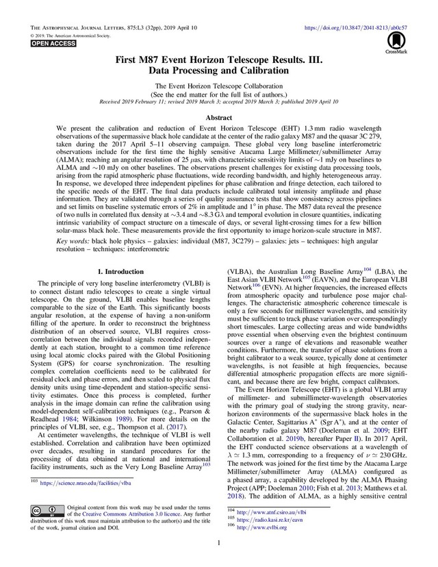 al. 2018, PASP, 130, 015002 McKinney, W. 2010, in Proc. 9th Python in Science Conf., ed. S. vander Walt & J. Millman (Washington, D.C.: IEEE), 51 McMullin, J. P., Waters, B., Schiebel, D., Young, W., & Golap, K. 2007, in ASP Conf. Ser. 376, Astronomical Data Analysis Software and Systems XVI, ed. R. A. Shaw, F. Hill, & D. J. Bell (San Francisco, CA: ASP), 127 Pearson, T. J., & Readhead, A. C. S. 1984, ARA&A, 22, 97 Penzias, A. A., & Burrus, C. A. 1973, ARA&A, 11, 51 Primiani, R. A., Young, K. H., Young, A., et al. 2016, JAI, 5, 1641006 Rogers, A. E. E., Doeleman, S. S., & Moran, J. M. 1995, AJ, 109, 1391 Romney, J. D. 1995, in ASP Conf. Ser. 82, Very Long Baseline Interferometry and the VLBA, ed. J. A. Zensus, P. J. Diamond, & P. J. Napier (San Francisco, CA: ASP), 17 Schwab, F. R., & Cotton, W. D. 1983, AJ, 88, 688 Tange, O. 2011, login: The USENIX Magazine, 36, 42 The Astropy Collaboration, Robitaille, T. P., Tollerud, E. J., et al. 2013, A&A, 558, A33 The Astropy Collaboration, Price-Whelan, A. M., Sipőcz, B. M., et al. 2018, AJ, 156, 123 Thompson, A. R., Moran, J. M., Jr., & , G. W. S. 2017, Interferometry and Synthesis in Radio Astronomy (3rd ed.; Berlin: Springer) Ulich, B. L., & Haas, R. W. 1976, ApJS, 30, 247 van Cittert, P. H. 1934, Phy, 1, 201 van der Walt, S., Colbert, S. C., & Varoquaux, G. 2011, CSE, 13, 22 Vertatschitsch, L., Primiani, R., Young, A., et al. 2015, PASP, 127, 1226 Walker, R. C., Hardee, P. E., Davies, F. B., Ly, C., & Junor, W. 2018, ApJ, 855, 128 Whitney, A. R., Beaudoin, C. J., Cappallo, R. J., et al. 2013, PASP, 125, 196 Whitney, A. R., Cappallo, R., Aldrich, W., et al. 2004, RaSc, 39, RS1007 Wielgus, M., Blackburn, L., Issaoun, S., et al. 2019, EHT Memo Series, 2019- CE-02 Wilkinson, P. N. 1989, in NATO Advanced Science Institutes (ASI) Series C, Vol. 283, ed. M. Felli & R. E. Spencer (Berlin: Springer), 69 Young, A., Primiani, R., Weintroub, J., et al. 2016, in 2016 IEEE Int. Symp., Phased Array Systems and Technology (ARRAY) (New York: IEEE), 1 Zernike, F. 1938, Phy, 5, 785 The Event Horizon Telescope Collaboration, Kazunori Akiyama1,2,3,4 , Antxon Alberdi5 , Walter Alef6, Keiichi Asada7, Rebecca Azulay8,9,6 , Anne-Kathrin Baczko6 , David Ball10, Mislav Baloković4,11 , John Barrett2 , Dan Bintley12, Lindy Blackburn4,11 , Wilfred Boland13, Katherine L. Bouman4,11,14 , Geoffrey C. Bower15 , Michael Bremer16, Christiaan D. Brinkerink17 , Roger Brissenden4,11 , Silke Britzen6 , Avery E. Broderick18,19,20 , Dominique Broguiere16, Thomas Bronzwaer17, Do-Young Byun21,22 , John E. Carlstrom23,24,25,26, Andrew Chael4,11 , Chi-kwan Chan10,27 , Shami Chatterjee28 , Koushik Chatterjee29, Ming-Tang Chen15, Yongjun Chen (陈永军)30,31, Ilje Cho21,22 , Pierre Christian10,11 , John E. Conway32 , James M. Cordes28, Geoffrey B. Crew2 , Yuzhu Cui33,34 , Jordy Davelaar17 , Mariafelicia De Laurentis35,36,37 , Roger Deane38,39 , Jessica Dempsey12 , Gregory Desvignes6 , Jason Dexter40 , Sheperd S. Doeleman4,11 , Ralph P. Eatough6 , Heino Falcke17 , Vincent L. Fish2 , Ed Fomalont1, Raquel Fraga-Encinas17 , Per Friberg12, Christian M. Fromm36, José L. Gómez5 , Peter Galison4,41,42 , Charles F. Gammie43,44 , Roberto García16, Olivier Gentaz16, Boris Georgiev19 , Ciriaco Goddi17,45, Roman Gold36 , Minfeng Gu (顾敏峰)30,46 , Mark Gurwell11 , Kazuhiro Hada33,34 , Michael H. Hecht2, Ronald Hesper47 , Luis C. Ho (何子山)48,49 , Paul Ho7, Mareki Honma33,34 , Chih-Wei L. Huang7 , Lei Huang (黄磊)30,46, David H. Hughes50, Shiro Ikeda3,51,52,53 , Makoto Inoue7, Sara Issaoun17 , David J. James4,11 , Buell T. Jannuzi10, Michael Janssen17 , Britton Jeter19,20 , Wu Jiang (江悟)30 , Michael D. Johnson4,11 , Svetlana Jorstad54,55 , Taehyun Jung21,22 , Mansour Karami18,19 , Ramesh Karuppusamy6 , Tomohisa Kawashima3 , Garrett K. Keating11 , Mark Kettenis56 , Jae-Young Kim6 , Junhan Kim10 , Jongsoo Kim21, Motoki Kino3,57 , Jun Yi Koay7 , Patrick M. Koch7 , Shoko Koyama7 , Michael Kramer6 , Carsten Kramer16 , Thomas P. Krichbaum6 , Cheng-Yu Kuo58, Tod R. Lauer59 , Sang-Sung Lee21 , Yan-Rong Li (李彦荣)60 , Zhiyuan Li (李志远)61,62 , Michael Lindqvist32 , Kuo Liu6 , Elisabetta Liuzzo63 , Wen-Ping Lo7,64, Andrei P. Lobanov6, Laurent Loinard65,66 , Colin Lonsdale2, Ru-Sen Lu (路如森)30,6 , Nicholas R. MacDonald6 , Jirong Mao (毛基荣)67,68,69 , Sera Markoff29,70 , Daniel P. Marrone10 , Alan P. Marscher54 , Iván Martí-Vidal32,71 , Satoki Matsushita7, Lynn D. Matthews2 , Lia Medeiros10,72 , Karl M. Menten6 , Yosuke Mizuno36 , Izumi Mizuno12 , James M. Moran4,11 , Kotaro Moriyama33,2 , Monika Moscibrodzka17 , Cornelia Müller6,17 , Hiroshi Nagai3,34 , Neil M. Nagar73 , Masanori Nakamura7 , Ramesh Narayan4,11 , Gopal Narayanan74, Iniyan Natarajan39 , Roberto Neri16, Chunchong Ni19,20 , Aristeidis Noutsos6 , Hiroki Okino33,75, Héctor Olivares36 , Gisela N. Ortiz-León6 , Tomoaki Oyama33, Feryal Özel10, Daniel C. M. Palumbo4,11 , Nimesh Patel11, Ue-Li Pen18,76,77,78 , Dominic W. Pesce4,11 , Vincent Piétu16, Richard Plambeck79, Aleksandar PopStefanija74, Oliver Porth36,29 , Ben Prather43 , Jorge A. Preciado-López18 , Dimitrios Psaltis10, Hung-Yi Pu18 , Venkatessh Ramakrishnan73 , Ramprasad Rao15 , Mark G. Rawlings12, Alexander W. Raymond4,11 , Luciano Rezzolla36 , Bart Ripperda36 , Freek Roelofs17 , Alan Rogers2, Eduardo Ros6 , Mel Rose10 , Arash Roshanineshat10, Helge Rottmann6, Alan L. Roy6 , Chet Ruszczyk2 , Benjamin R. Ryan80,81 , Kazi L. J. Rygl63 , Salvador Sánchez82, David Sánchez-Arguelles50,83 , Mahito Sasada33,84 , Tuomas Savolainen6,85,86 , F. Peter Schloerb74, Karl-Friedrich Schuster16, Lijing Shao6,49 , Zhiqiang Shen (沈志强)30,31 , Des Small56 , Bong Won Sohn21,22,87 , Jason SooHoo2 , Fumie Tazaki33 , Paul Tiede18,19 , Remo P. J. Tilanus17,45,88 , Michael Titus2 , Kenji Toma89,90 , Pablo Torne6,82 , Tyler Trent10, Sascha Trippe91 , Shuichiro Tsuda33, Ilse van Bemmel56 , Huib Jan van Langevelde56,92 , Daniel R. van Rossum17 , 30 The Astrophysical Journal L