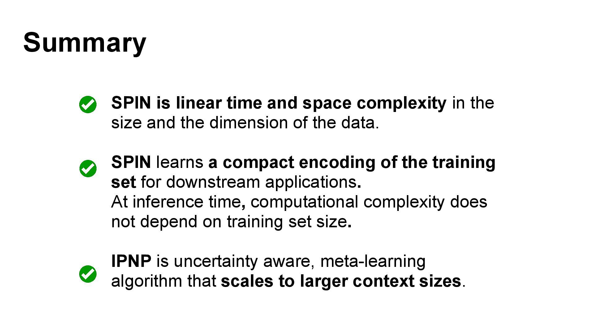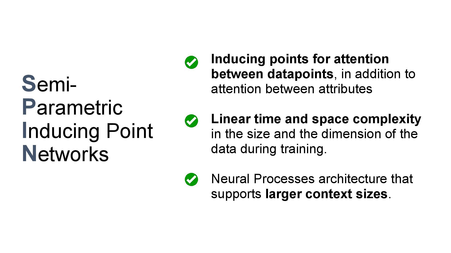 We introduce semi-parametric inducing point networks (SPIN), a general-purpose architecture that can query the training set at inference time in a compute-efficient manner. Semi-parametric architectures are typically more compact than parametric models, but their computational complexity is often quadratic. In contrast, SPIN attains linear complexity via a cross-attention mechanism between datapoints inspired by inducing point methods. Querying large training sets can be particularly useful in meta-learning, as it unlocks additional training signal, but often exceeds the scaling limits of existing models. We use SPIN as the basis of the Inducing Point Neural Process, a probabilistic model which supports large contexts in meta-learning and achieves high accuracy where existing models fail. In our experiments, SPIN reduces memory requirements, improves accuracy across a range of meta-learning tasks, and improves state-of-the-art performance on an important practical problem, genotype imputation.