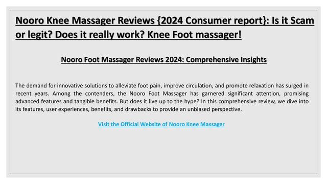 or legit? Does it really work? Knee Foot massager! Nooro Foot Massager Reviews 2024: Comprehensive Insights The demand for innovative solutions to alleviate foot pain, improve circulation, and promote relaxation has surged in recent years. Among the contenders, the Nooro Foot Massager has garnered significant attention, promising advanced features and tangible benefits. But does it live up to the hype? In this comprehensive review, we dive into its features, user experiences, benefits, and drawbacks to provide an unbiased perspective. Visit the Official Website of Nooro Knee Massager