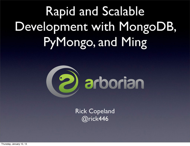 This intermediate-level talk will teach you techniques using the popular NoSQL database MongoDB and the Python library Ming to write maintainable, high-performance, and scalable applications. We will cover everything you need to become an effective Ming/MongoDB developer from basic PyMongo queries to high-level object-document mapping setups in Ming.