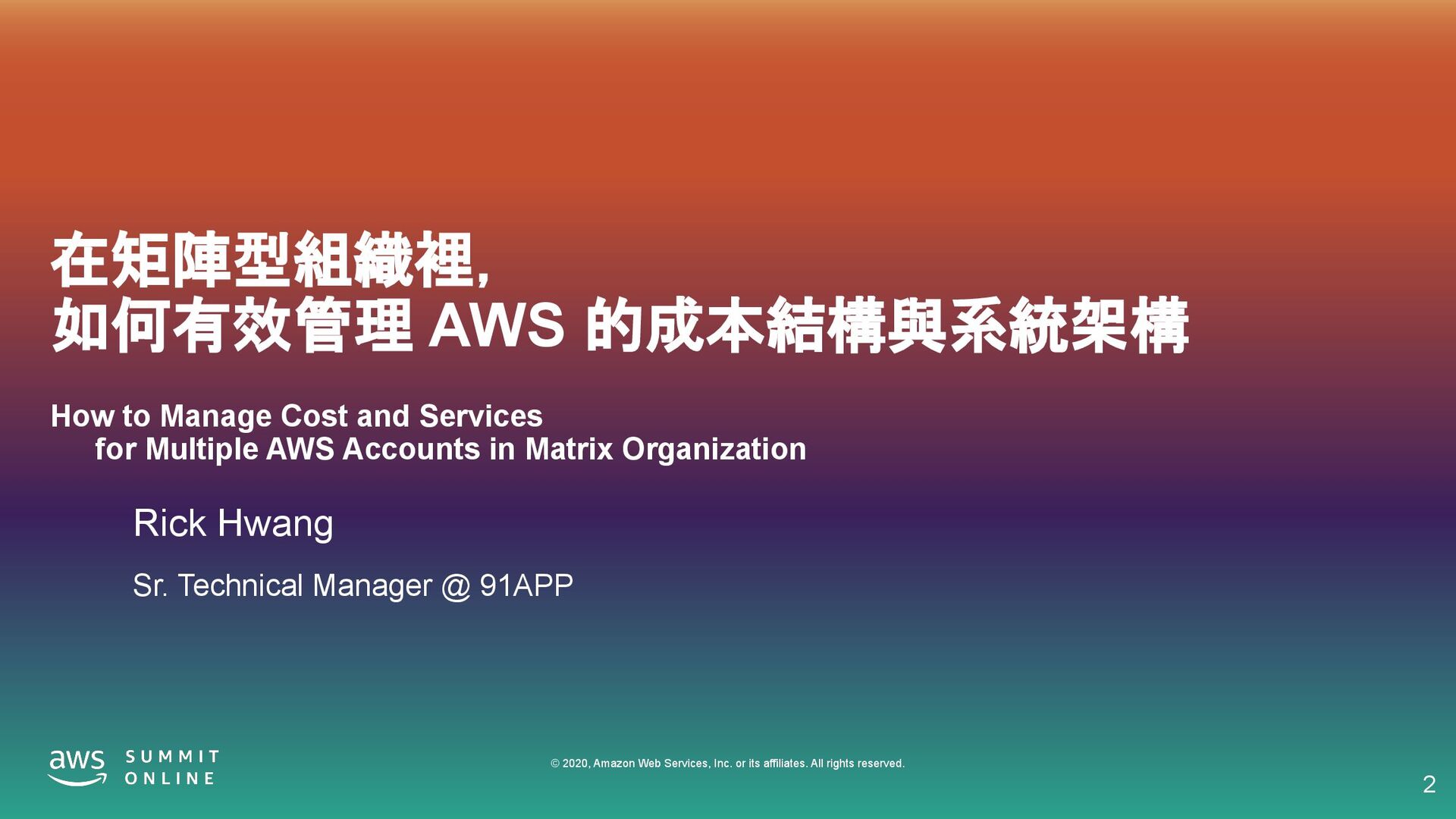 rights reserved. Rick Hwang Sr. Technical Manager @ 91APP 在矩陣型組織裡, 如何有效管理 AWS 的成本結構與系統架構 How to Manage Cost and Services for Multiple AWS Accounts in Matrix Organization 2