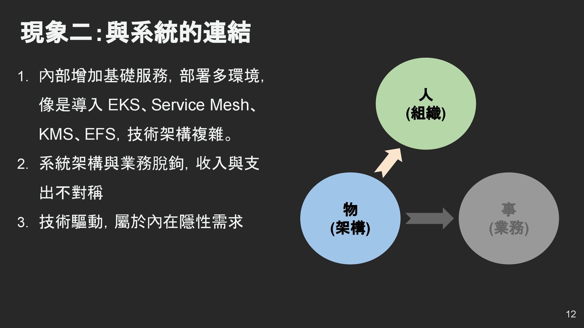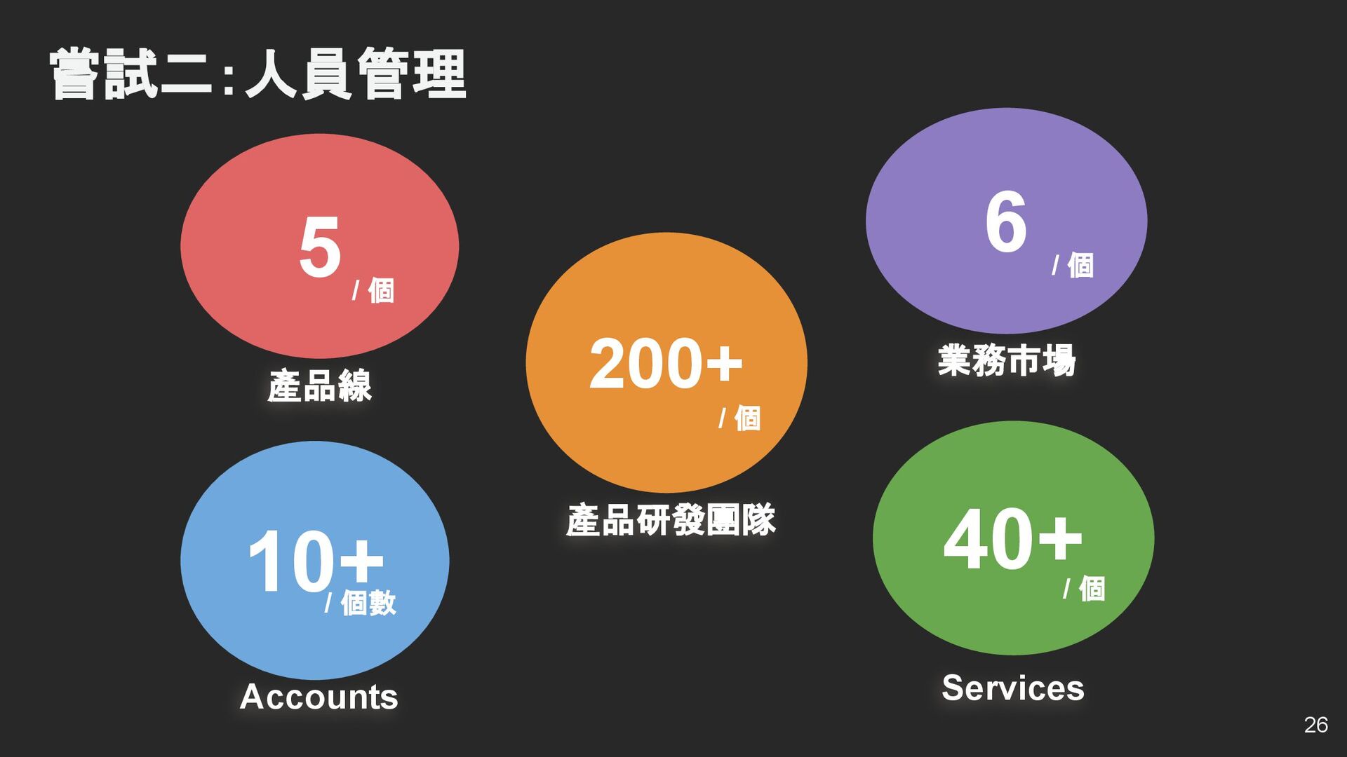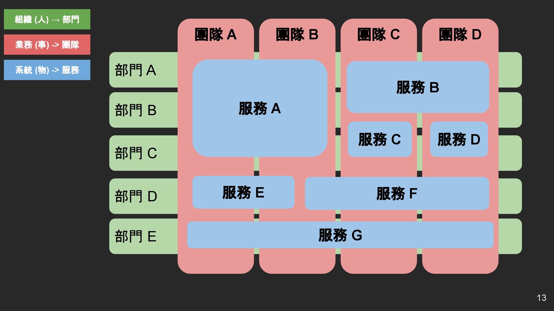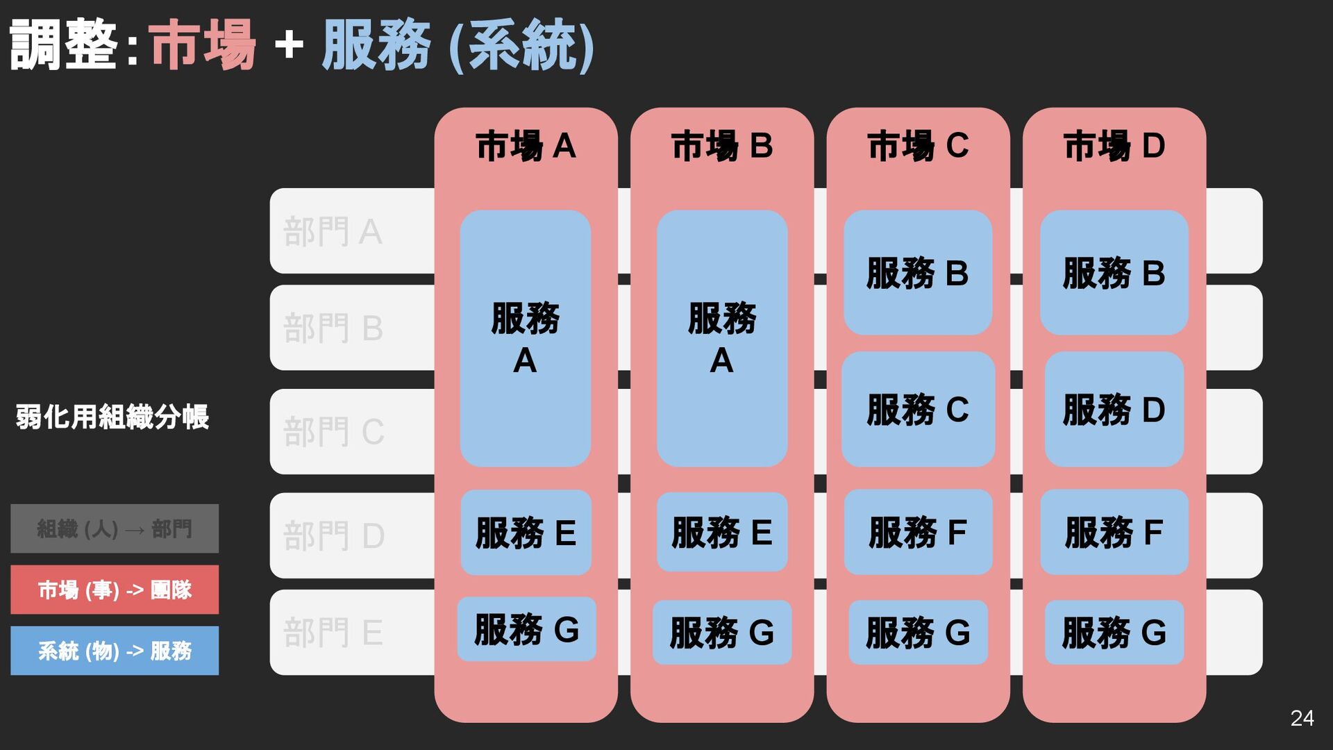 E 市場 A 市場 B 市場 C 市場 D 組織 (人) → 部門 市場 (事) -> 團隊 系統 (物) -> 服務 服務 A 服務 B 服務 C 服務 E 服務 F 服務 D 服務 G 服務 A 服務 B 服務 F 服務 E 服務 G 服務 G 服務 G 調整:市場 + 服務 (系統) 弱化用組織分帳