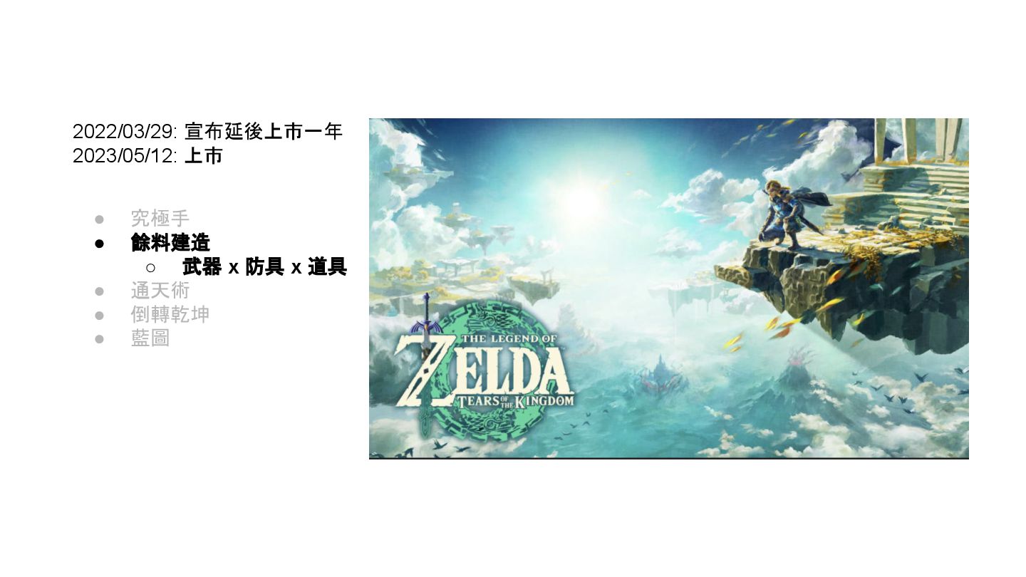 2022/03/29: 宣布延後上市一年 2023/05/12: 上市 • 究極手 • 餘料建造 ◦ 武器
