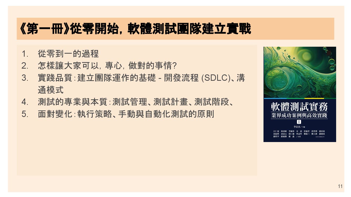 11 《第一冊》從零開始,軟體測試團隊建立實戰 1. 從零到一的過程 2. 怎樣讓大家可以,專心,做對的事情? 3. 實踐品質:建立團隊運作的基礎 - 開發流程