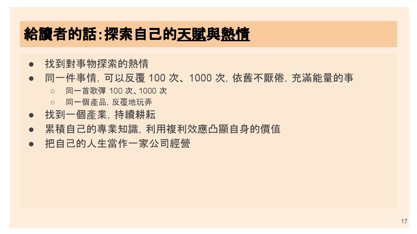 ◦ 同一首歌彈 100 次、1000 次 ◦ 同一個產品,反覆地玩弄 • 找到一個產業,持續耕耘 • 累積自己的專業知識,利用複利效應凸顯自身的價值 • 把自己的人生當作一家公司經營