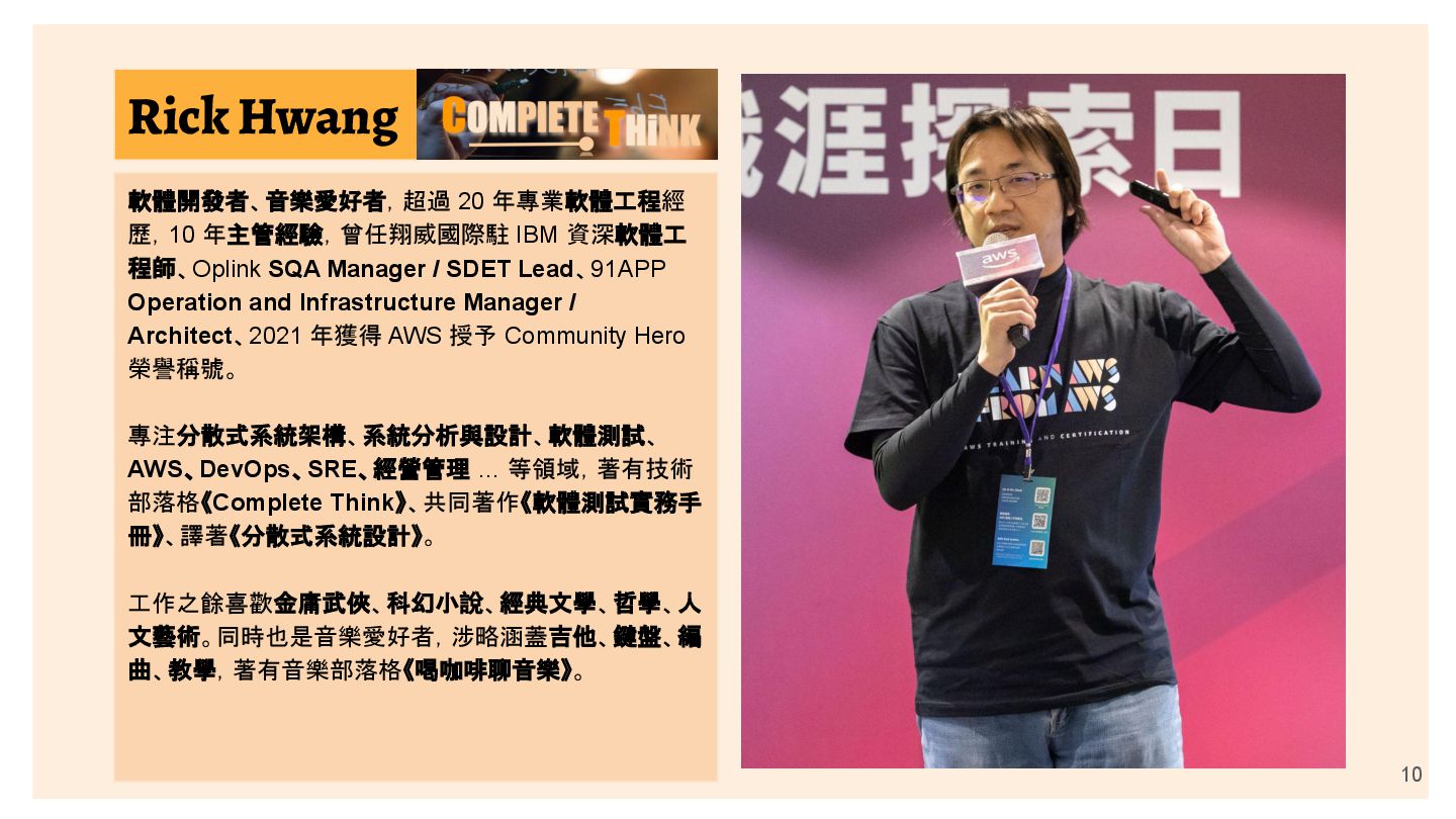 程師、Oplink SQA Manager / SDET Lead、91APP Operation and Infrastructure Manager / Architect、2021 年獲得 AWS 授予 Community Hero 榮譽稱號。 專注分散式系統架構、系統分析與設計、軟體測試、 AWS、DevOps、SRE、經營管理 … 等領域,著有技術 部落格《Complete Think》、共同著作《軟體測試實務手 冊》、譯著《分散式系統設計》。 工作之餘喜歡金庸武俠、科幻小說、經典文學、哲學、人 文藝術。同時也是音樂愛好者,涉略涵蓋吉他、鍵盤、編 曲、教學,著有音樂部落格《喝咖啡聊音樂》。