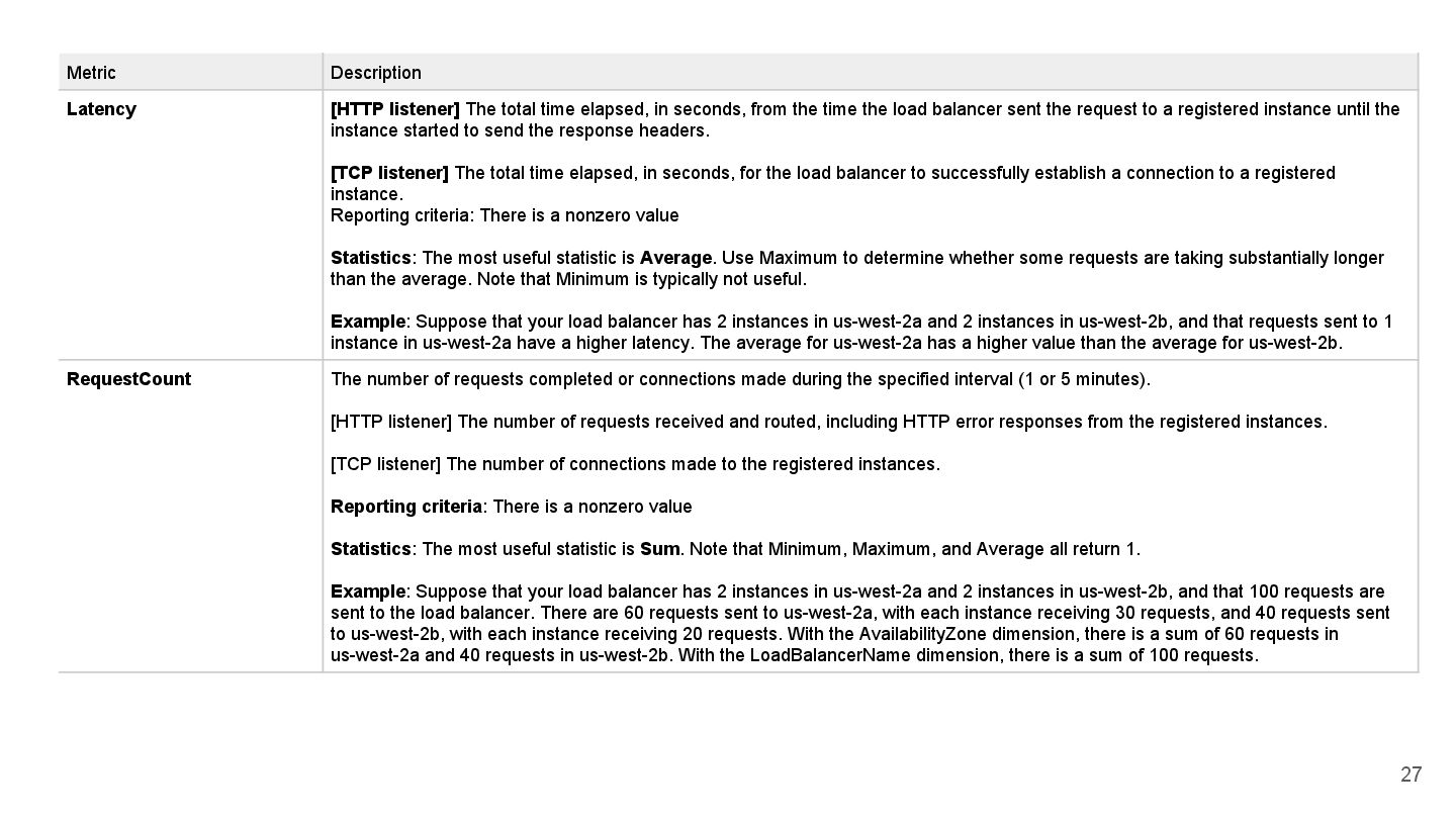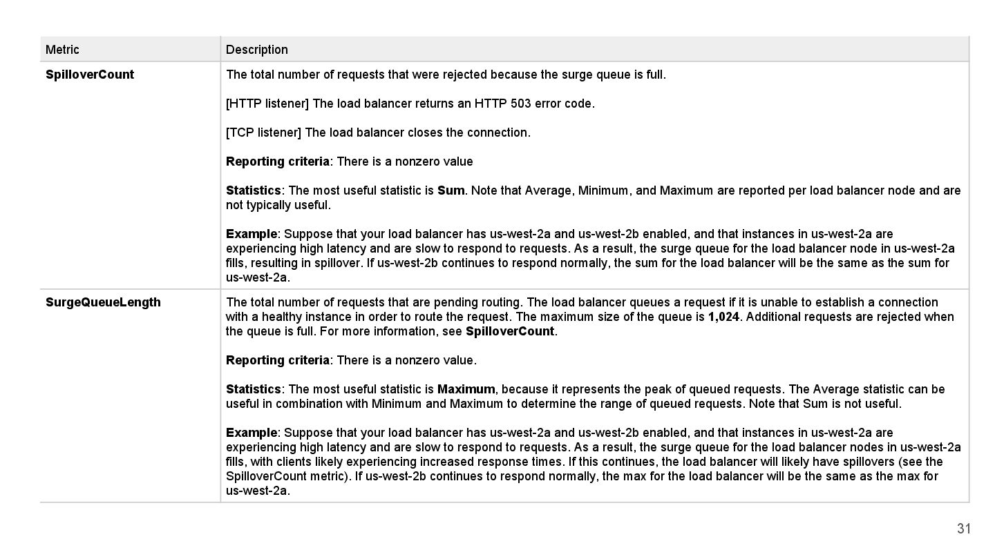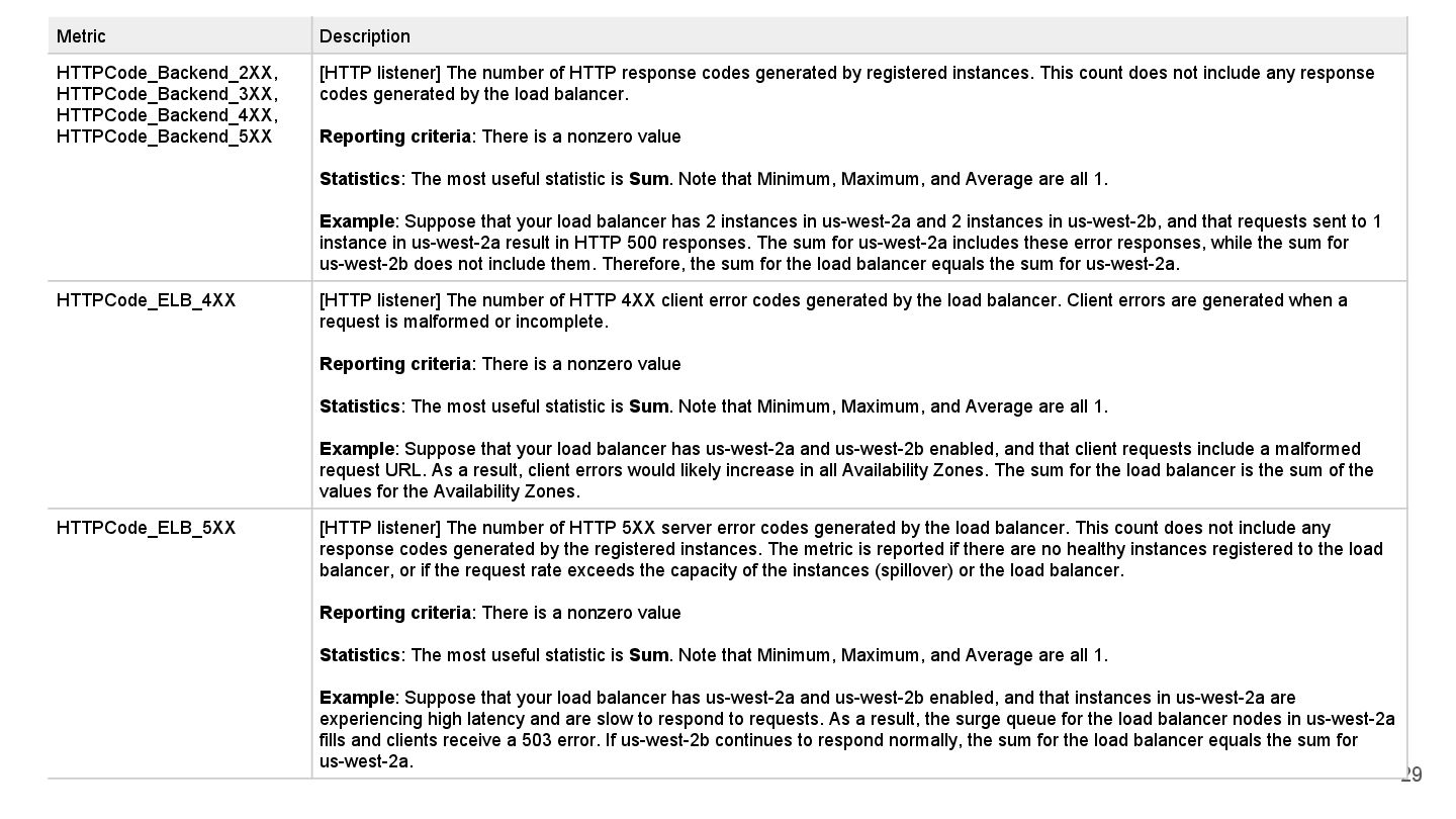 number of HTTP response codes generated by registered instances. This count does not include any response codes generated by the load balancer. Reporting criteria: There is a nonzero value Statistics: The most useful statistic is Sum. Note that Minimum, Maximum, and Average are all 1. Example: Suppose that your load balancer has 2 instances in us-west-2a and 2 instances in us-west-2b, and that requests sent to 1 instance in us-west-2a result in HTTP 500 responses. The sum for us-west-2a includes these error responses, while the sum for us-west-2b does not include them. Therefore, the sum for the load balancer equals the sum for us-west-2a. HTTPCode_ELB_4XX [HTTP listener] The number of HTTP 4XX client error codes generated by the load balancer. Client errors are generated when a request is malformed or incomplete. Reporting criteria: There is a nonzero value Statistics: The most useful statistic is Sum. Note that Minimum, Maximum, and Average are all 1. Example: Suppose that your load balancer has us-west-2a and us-west-2b enabled, and that client requests include a malformed request URL. As a result, client errors would likely increase in all Availability Zones. The sum for the load balancer is the sum of the values for the Availability Zones. HTTPCode_ELB_5XX [HTTP listener] The number of HTTP 5XX server error codes generated by the load balancer. This count does not include any response codes generated by the registered instances. The metric is reported if there are no healthy instances registered to the load balancer, or if the request rate exceeds the capacity of the instances (spillover) or the load balancer. Reporting criteria: There is a nonzero value Statistics: The most useful statistic is Sum. Note that Minimum, Maximum, and Average are all 1. Example: Suppose that your load balancer has us-west-2a and us-west-2b enabled, and that instances in us-west-2a are experiencing high latency and are slow to respond to requests. As a result, the surge queue for the load balancer nodes in us-west-2a fills and clients receive a 503 error. If us-west-2b continues to respond normally, the sum for the load balancer equals the sum for us-west-2a.