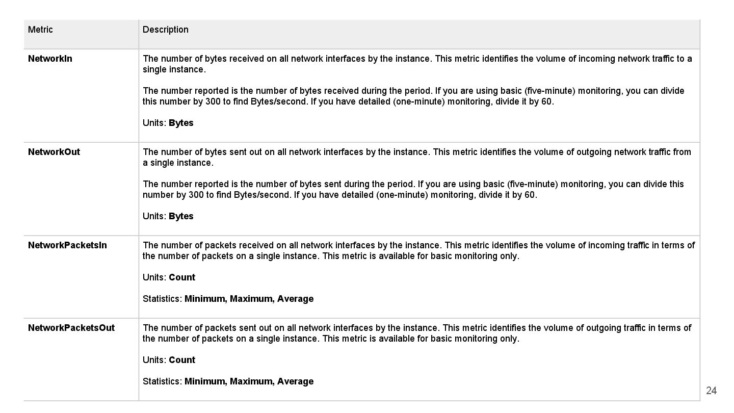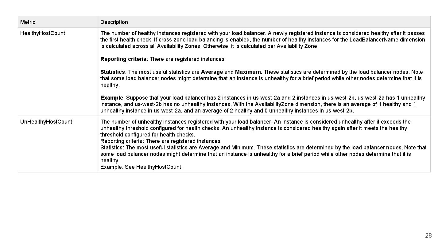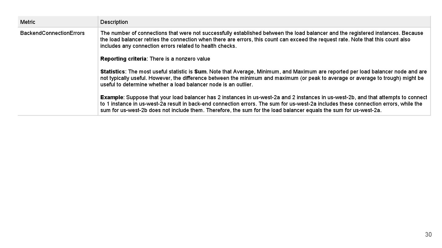 number of HTTP response codes generated by registered instances. This count does not include any response codes generated by the load balancer. Reporting criteria: There is a nonzero value Statistics: The most useful statistic is Sum. Note that Minimum, Maximum, and Average are all 1. Example: Suppose that your load balancer has 2 instances in us-west-2a and 2 instances in us-west-2b, and that requests sent to 1 instance in us-west-2a result in HTTP 500 responses. The sum for us-west-2a includes these error responses, while the sum for us-west-2b does not include them. Therefore, the sum for the load balancer equals the sum for us-west-2a. HTTPCode_ELB_4XX [HTTP listener] The number of HTTP 4XX client error codes generated by the load balancer. Client errors are generated when a request is malformed or incomplete. Reporting criteria: There is a nonzero value Statistics: The most useful statistic is Sum. Note that Minimum, Maximum, and Average are all 1. Example: Suppose that your load balancer has us-west-2a and us-west-2b enabled, and that client requests include a malformed request URL. As a result, client errors would likely increase in all Availability Zones. The sum for the load balancer is the sum of the values for the Availability Zones. HTTPCode_ELB_5XX [HTTP listener] The number of HTTP 5XX server error codes generated by the load balancer. This count does not include any response codes generated by the registered instances. The metric is reported if there are no healthy instances registered to the load balancer, or if the request rate exceeds the capacity of the instances (spillover) or the load balancer. Reporting criteria: There is a nonzero value Statistics: The most useful statistic is Sum. Note that Minimum, Maximum, and Average are all 1. Example: Suppose that your load balancer has us-west-2a and us-west-2b enabled, and that instances in us-west-2a are experiencing high latency and are slow to respond to requests. As a result, the surge queue for the load balancer nodes in us-west-2a fills and clients receive a 503 error. If us-west-2b continues to respond normally, the sum for the load balancer equals the sum for us-west-2a.