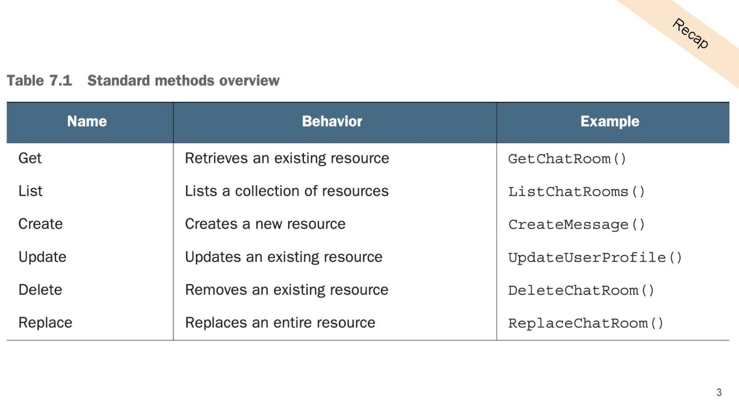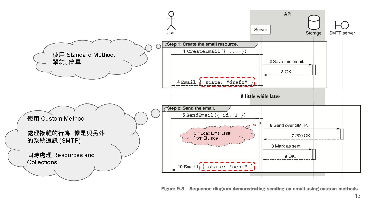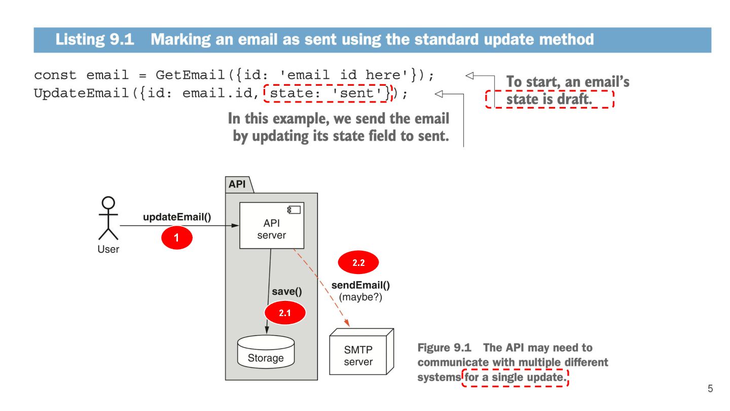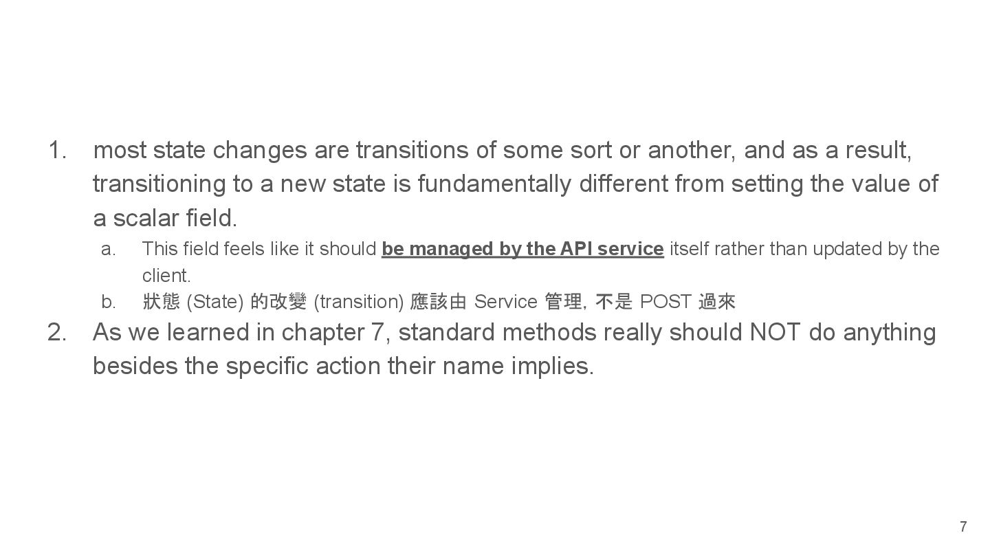 another, and as a result, transitioning to a new state is fundamentally different from setting the value of a scalar field. a. This field feels like it should be managed by the API service itself rather than updated by the client. b. 狀態 (State) 的改變 (transition) 應該由 Service 管理,不是 POST 過來 2. As we learned in chapter 7, standard methods really should NOT do anything besides the specific action their name implies. 7