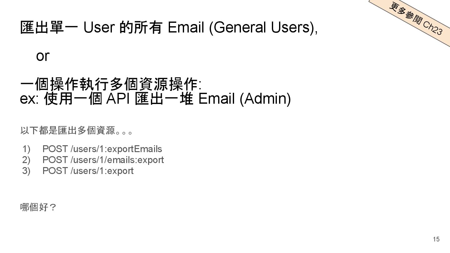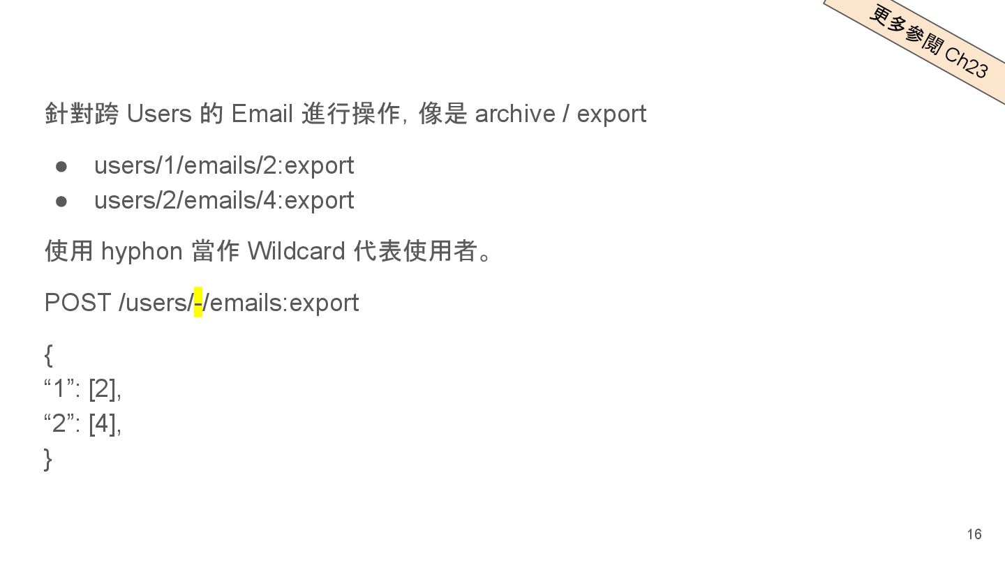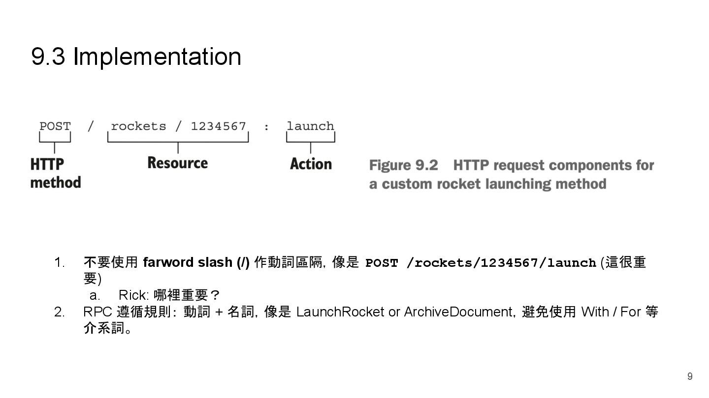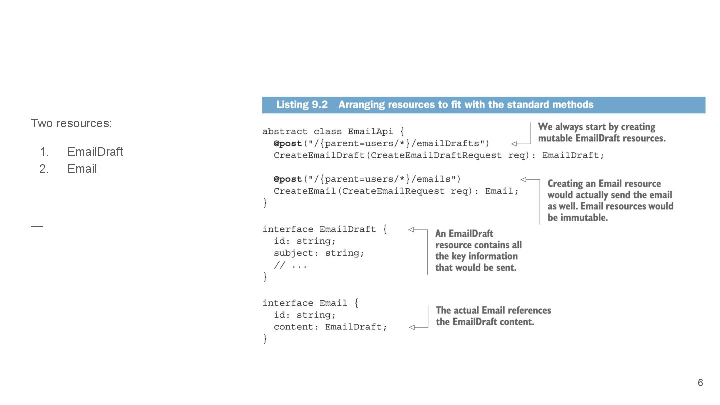 another, and as a result, transitioning to a new state is fundamentally different from setting the value of a scalar field. a. This field feels like it should be managed by the API service itself rather than updated by the client. b. 狀態 (State) 的改變 (transition) 應該由 Service 管理,不是 POST 過來 2. As we learned in chapter 7, standard methods really should NOT do anything besides the specific action their name implies. 7