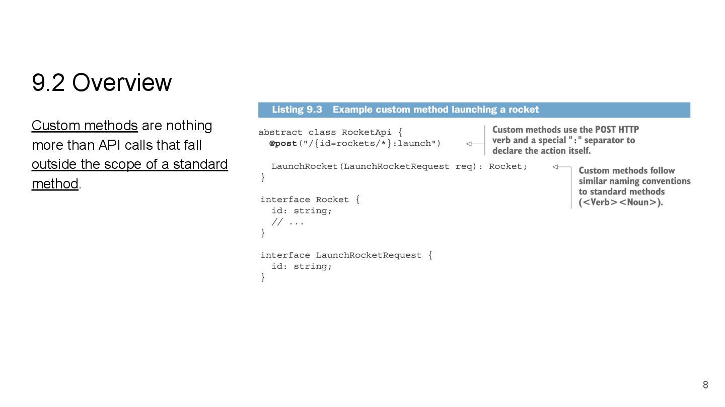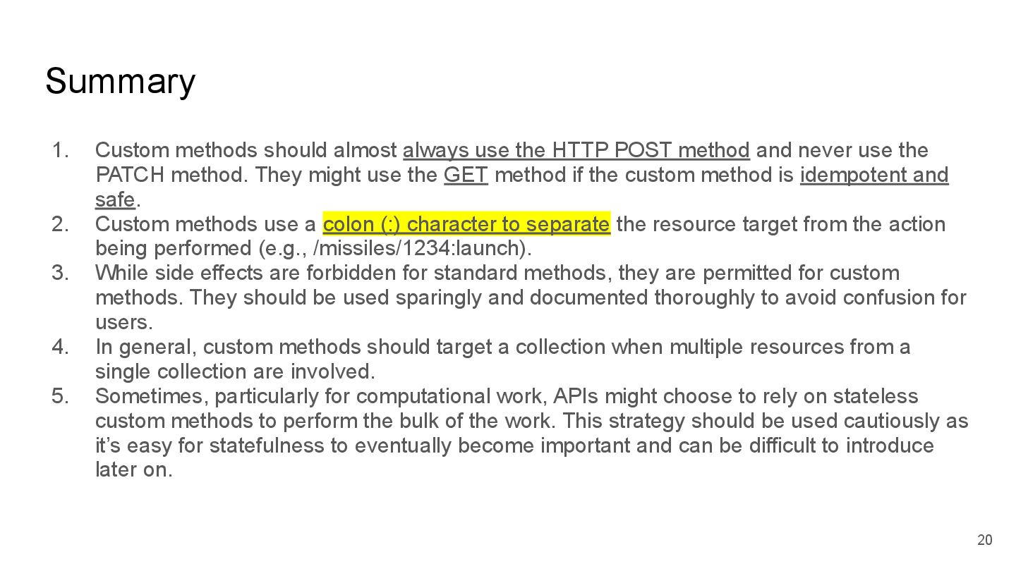 POST method and never use the PATCH method. They might use the GET method if the custom method is idempotent and safe. 2. Custom methods use a colon (:) character to separate the resource target from the action being performed (e.g., /missiles/1234:launch). 3. While side effects are forbidden for standard methods, they are permitted for custom methods. They should be used sparingly and documented thoroughly to avoid confusion for users. 4. In general, custom methods should target a collection when multiple resources from a single collection are involved. 5. Sometimes, particularly for computational work, APIs might choose to rely on stateless custom methods to perform the bulk of the work. This strategy should be used cautiously as it’s easy for statefulness to eventually become important and can be difficult to introduce later on. 20