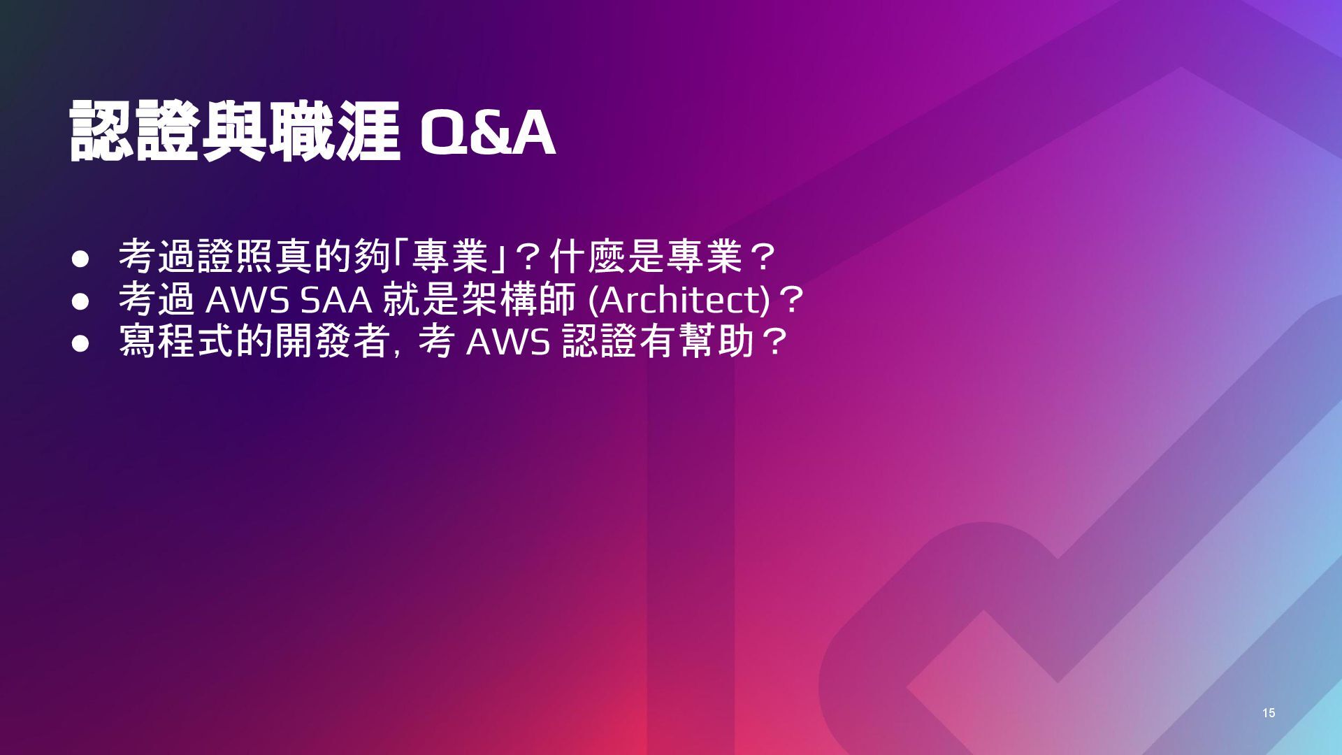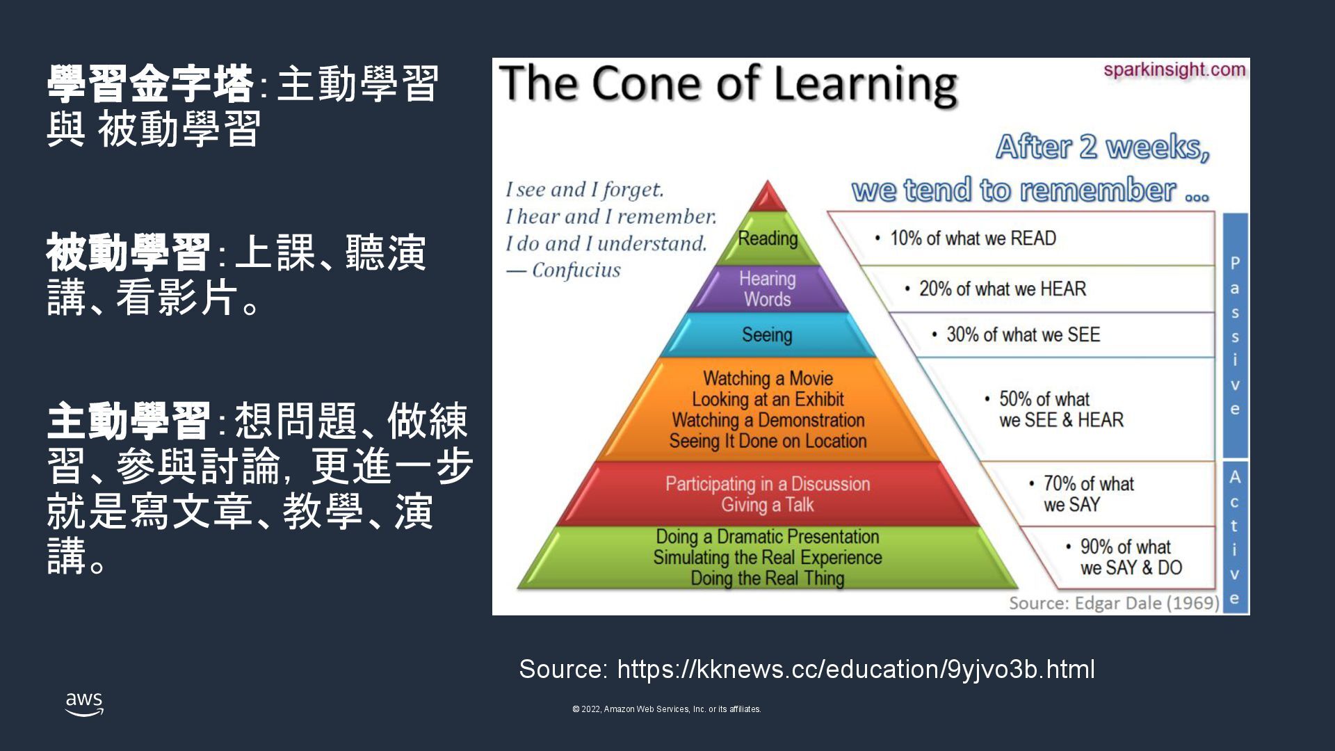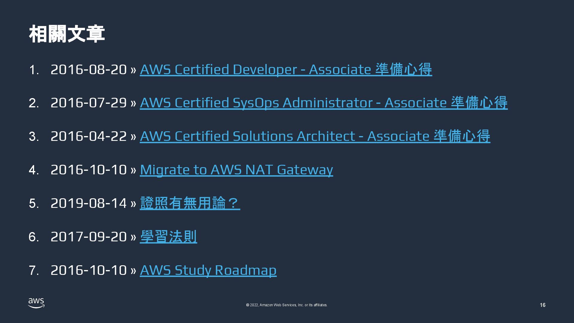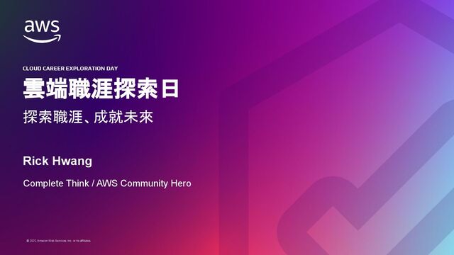 Web Services, Inc. or its affiliates. © 2022, Amazon Web Services, Inc. or its affiliates. Rick Hwang 軟體開發者、音樂愛好者,曾任: • 翔威國際 駐 IBM:資深軟體工程師 • Oplink:SQA Manager、SDET Lead • 91APP: ◦ Operation and Infrastructure Manager ◦ Infra Architect / Tech Architect • AWS Community Hero 專注分散式系統架構設計、系統分析、軟體測試、 AWS、DevOps、SRE、經 營管理 … 等領域,著有技術部落格:《Complete Think》、《譯著:分散式系 統設計》 工作之餘喜歡金庸武俠、科幻小 說、經典文學、哲學、人文藝術。同時也是 音樂愛好者,涉略涵蓋吉他、鍵盤、編曲、教學,著有音樂部落格《 喝咖啡聊 音樂》。