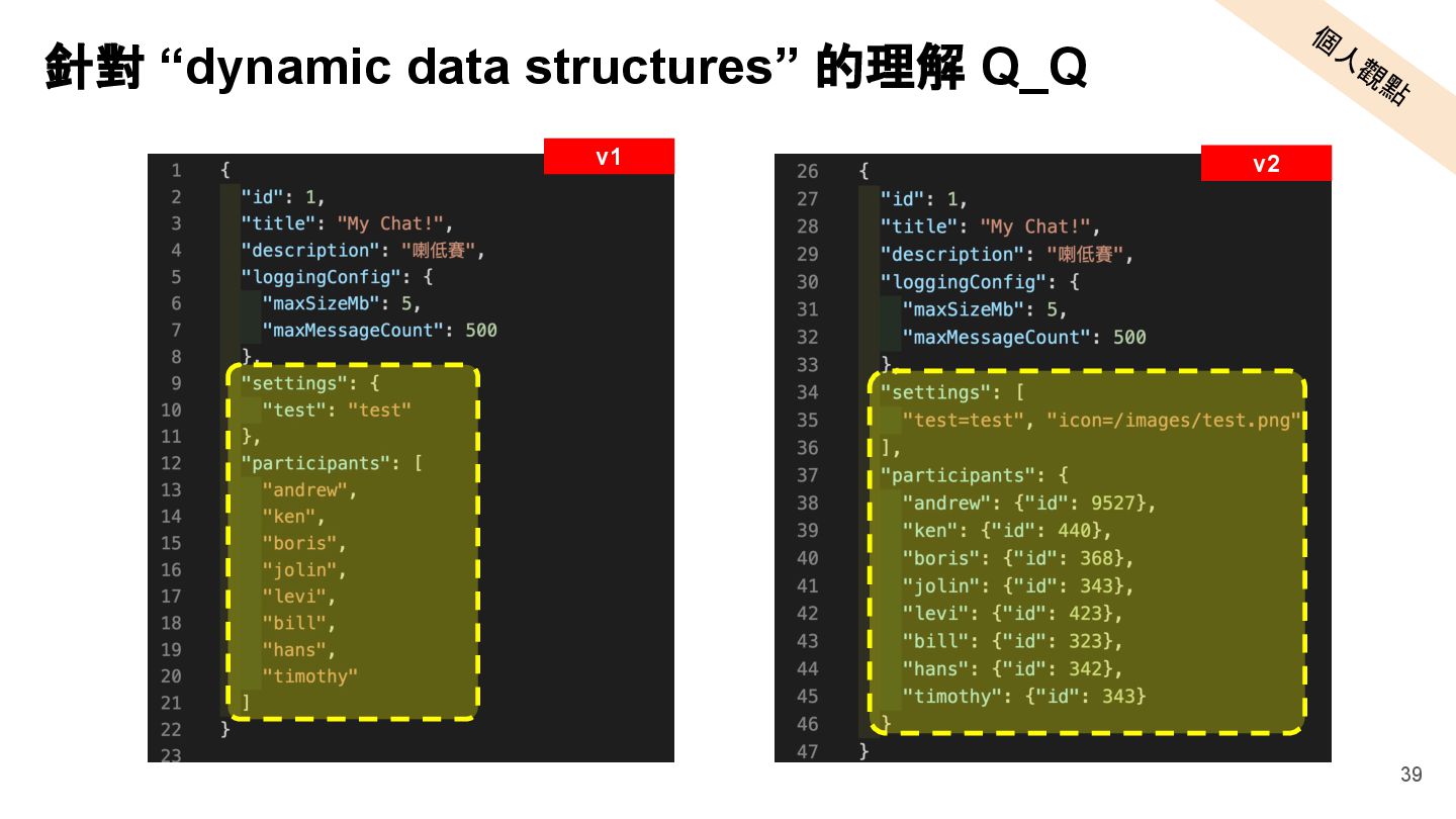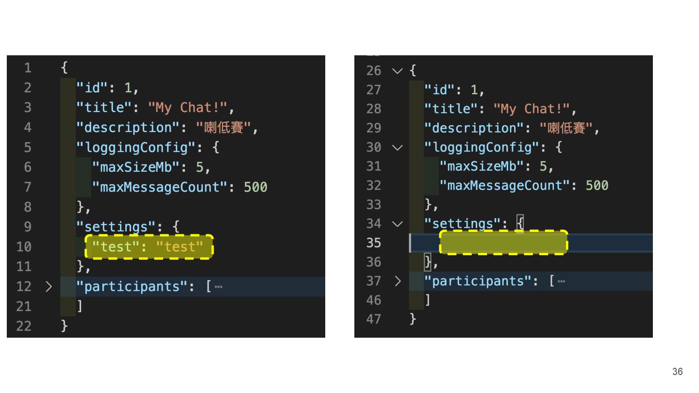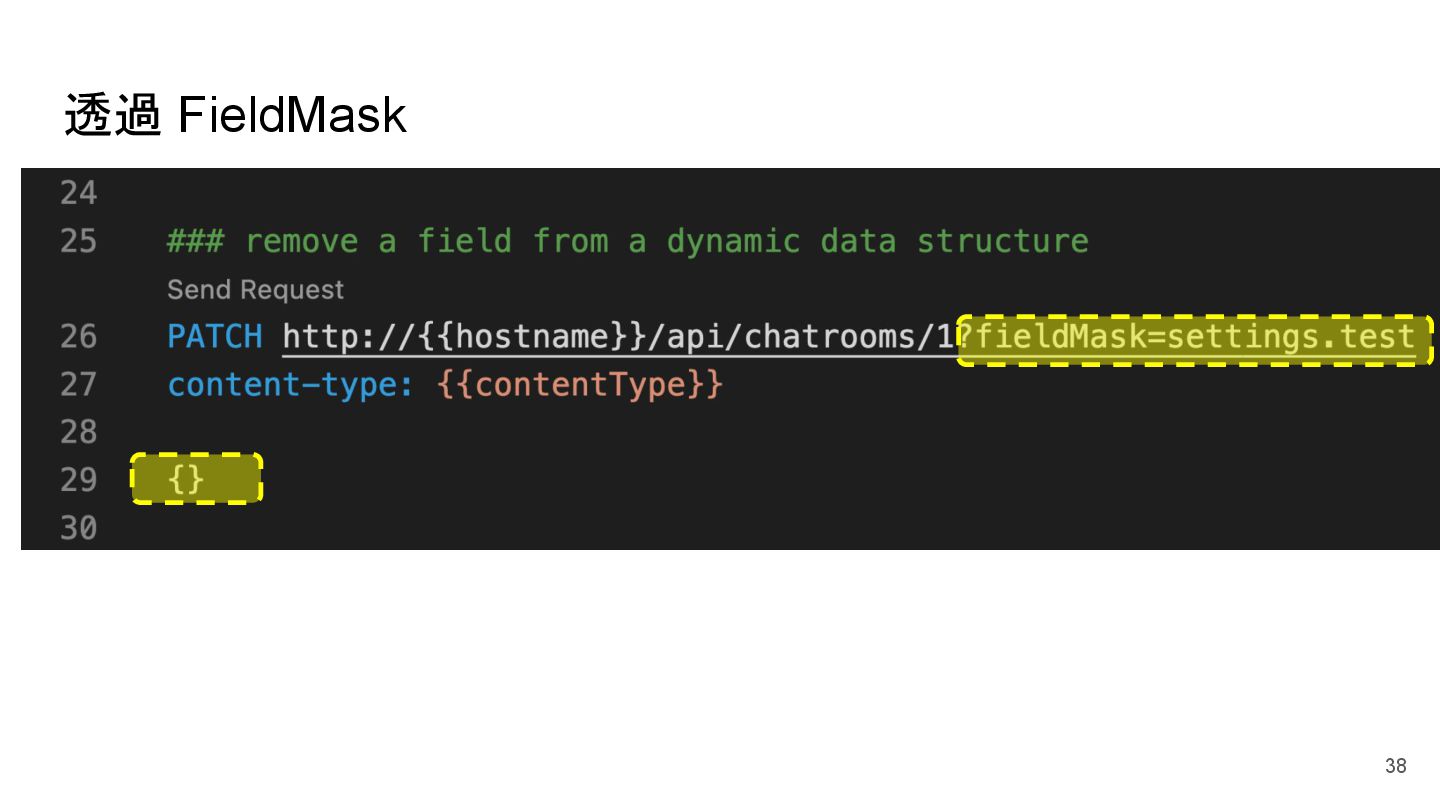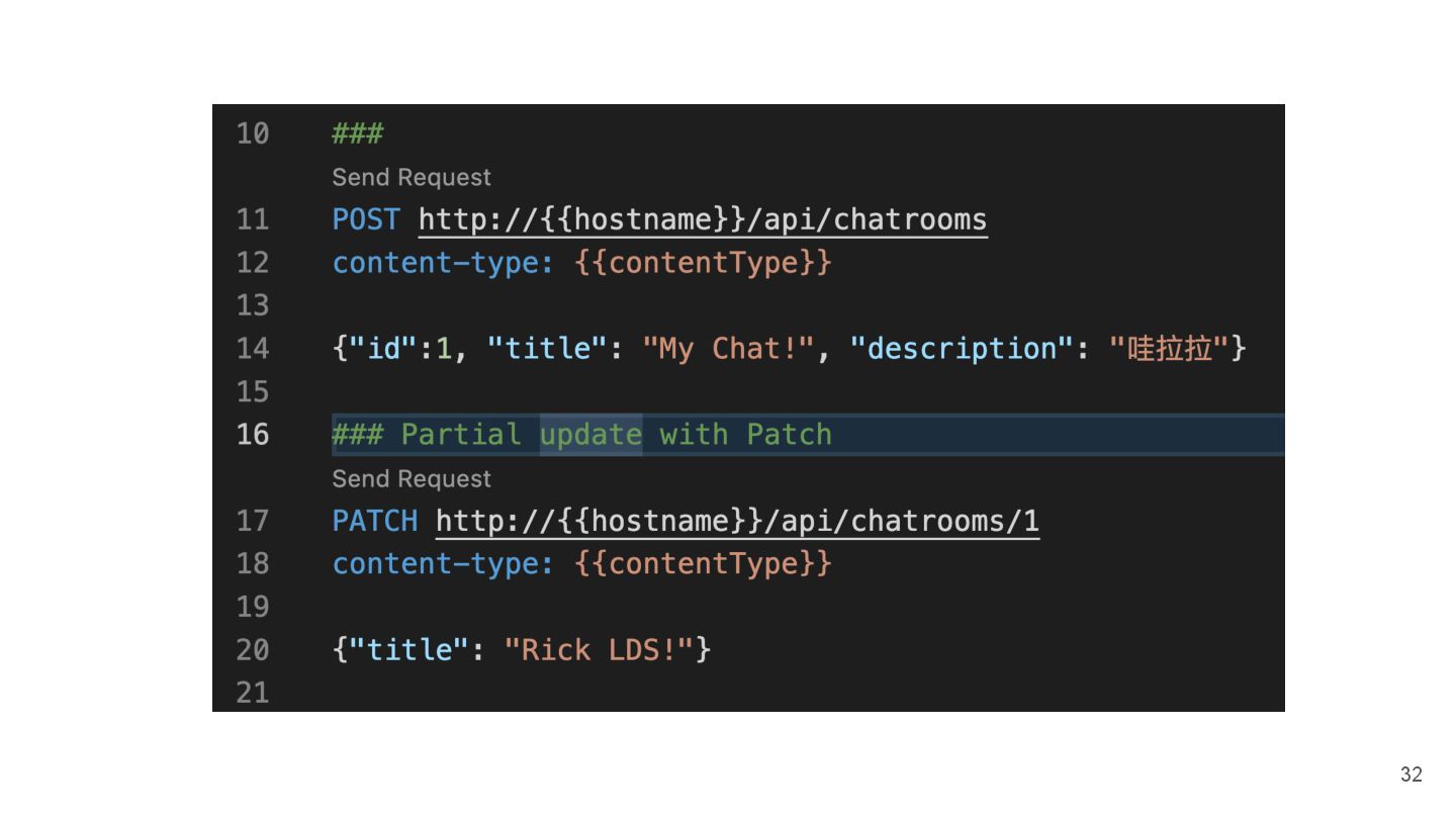 "description": "喇低賽", "participants": [] ⇐ 裡面有 10k 個鄉民,要處理很久 }, "2": { "id": 2, "title": "Your Chat!", "description": "低賽喇", "participants": [] ⇐ 裡面有 100k 個鄉民,要處理很久 } } Design: w/o participants in default GET /api/chatrooms <Default> { "1": { "id": 1, "title": "My Chat!", "description": "喇低賽", }, "2": { "id": 2, "title": "Your Chat!", "description": "低賽喇", } } 26 w/o participants