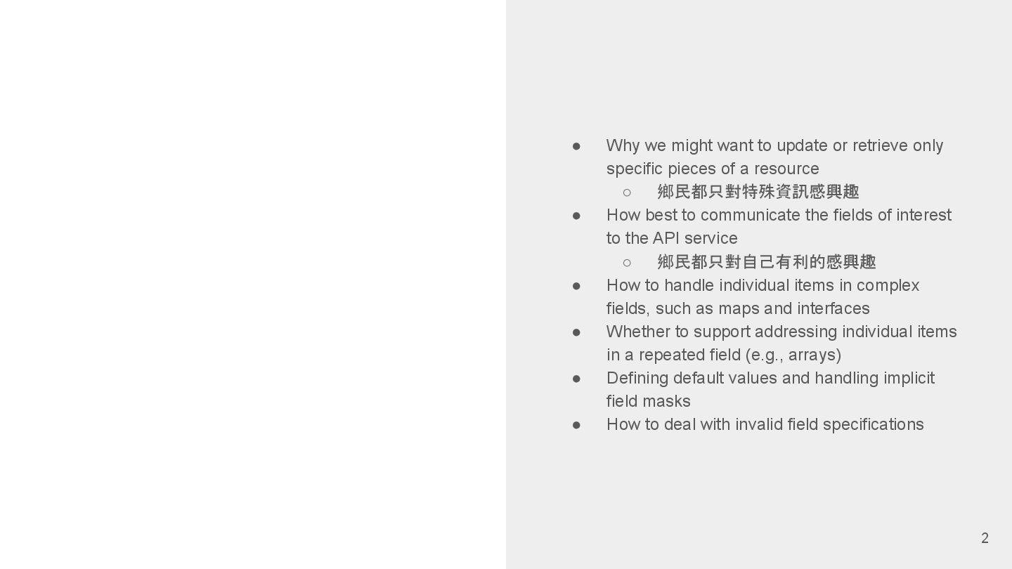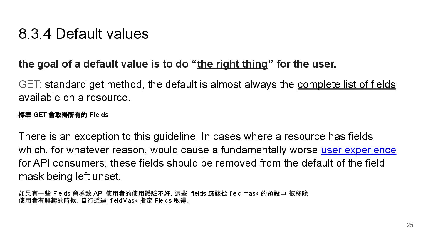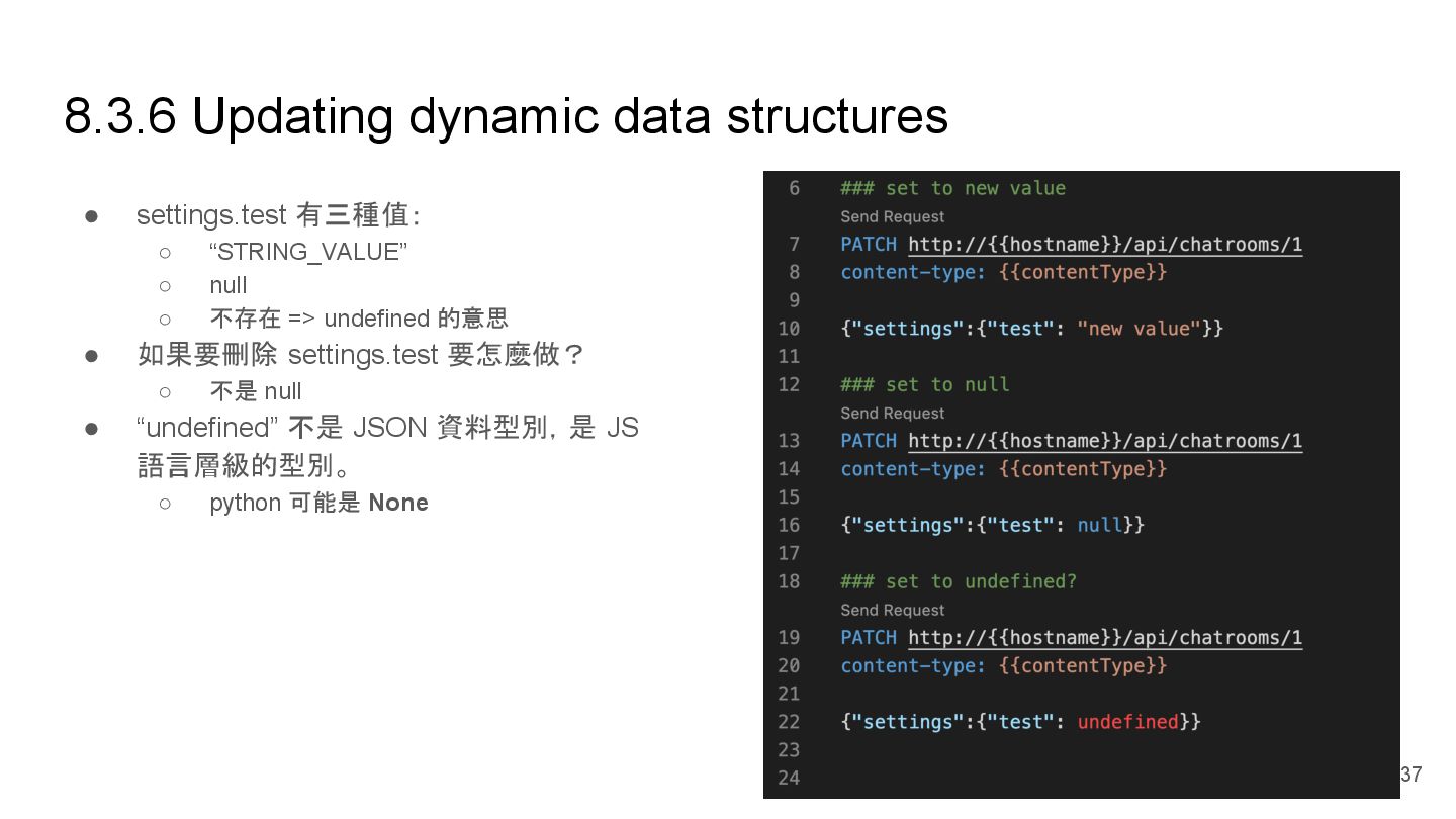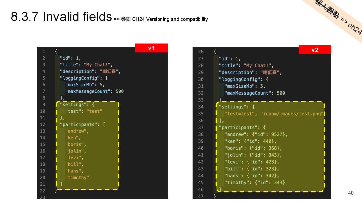 "description": "喇低賽", "participants": [] ⇐ 裡面有 10k 個鄉民,要處理很久 }, "2": { "id": 2, "title": "Your Chat!", "description": "低賽喇", "participants": [] ⇐ 裡面有 100k 個鄉民,要處理很久 } } Design: w/o participants in default GET /api/chatrooms <Default> { "1": { "id": 1, "title": "My Chat!", "description": "喇低賽", }, "2": { "id": 2, "title": "Your Chat!", "description": "低賽喇", } } 26 w/o participants