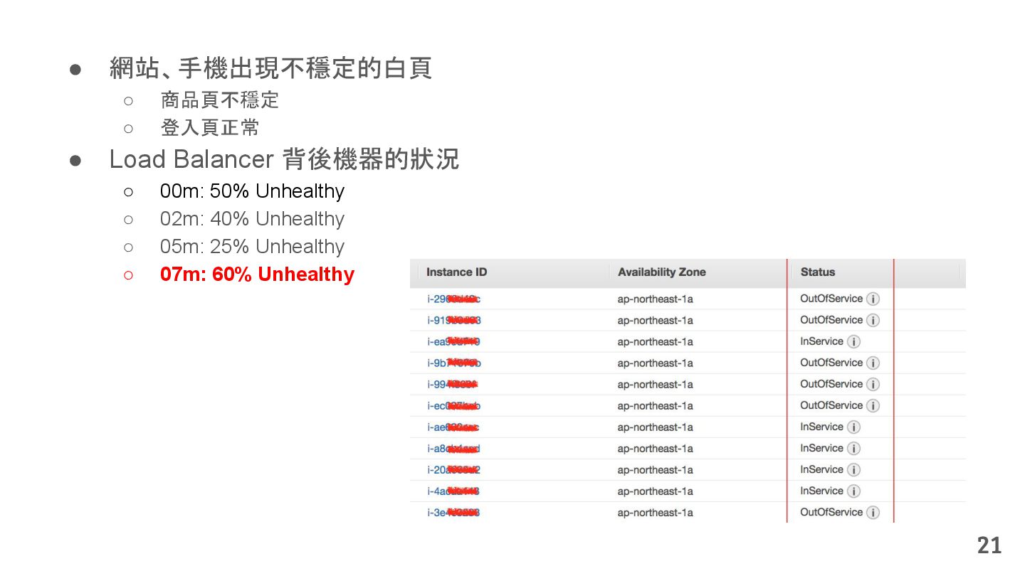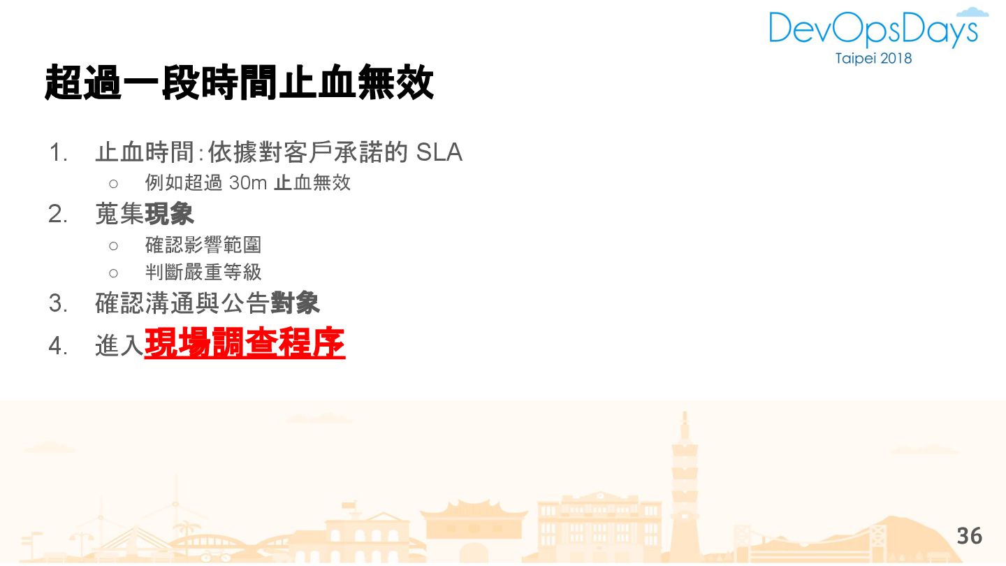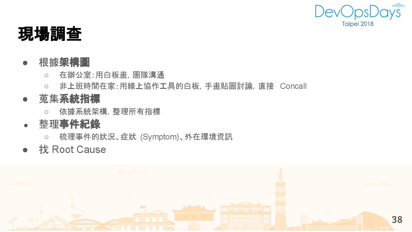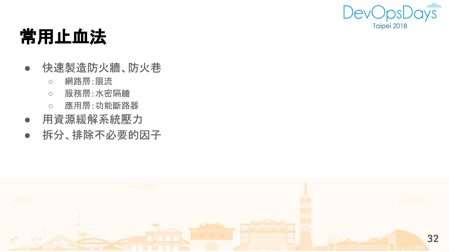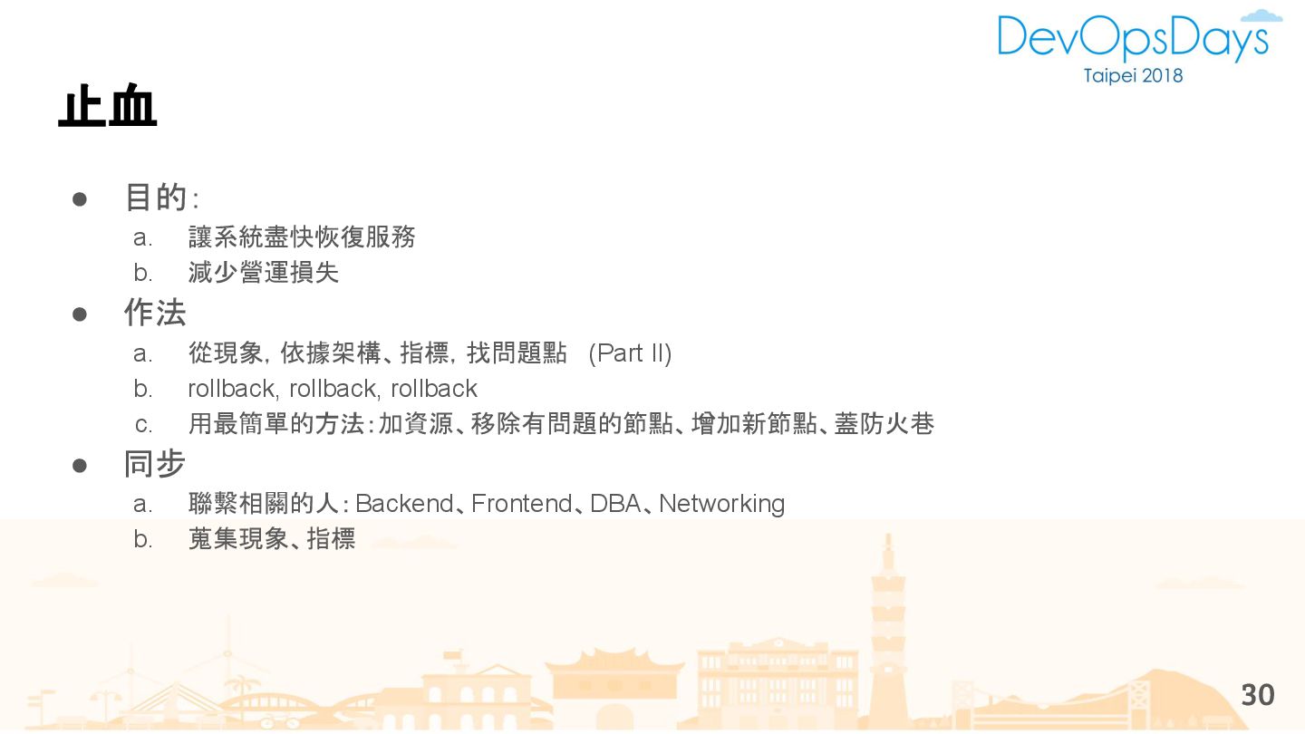 從現象,依據架構、指標,找問題點 (Part II) b. rollback, rollback, rollback c. 用最簡單的方法:加資源、移除有問題的節點、增加新節點、蓋防火巷 • 同步 a. 聯繫相關的人:Backend、Frontend、DBA、Networking b. 蒐集現象、指標 30