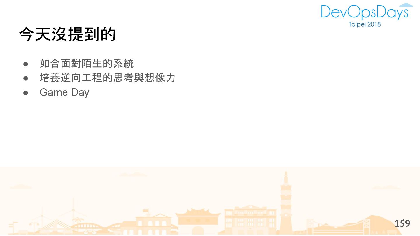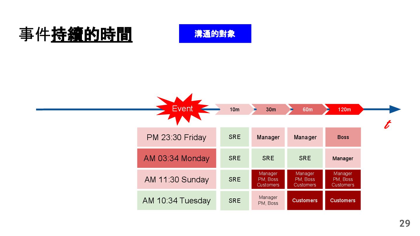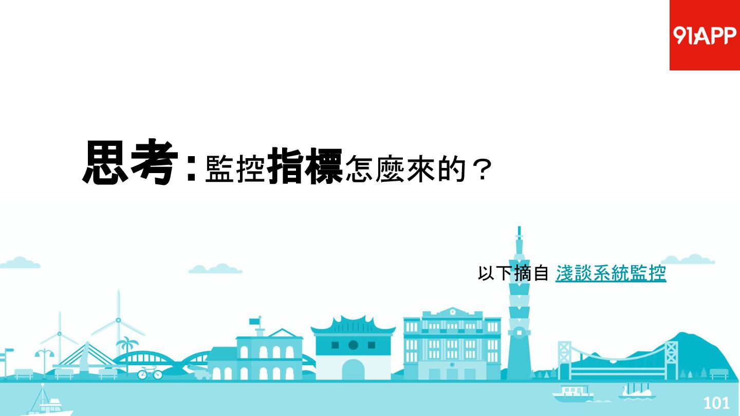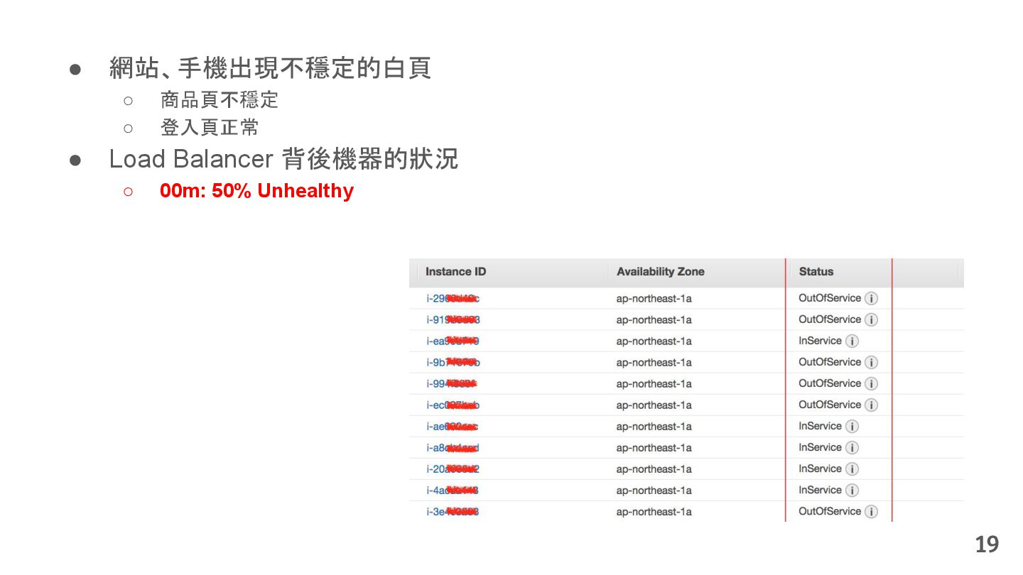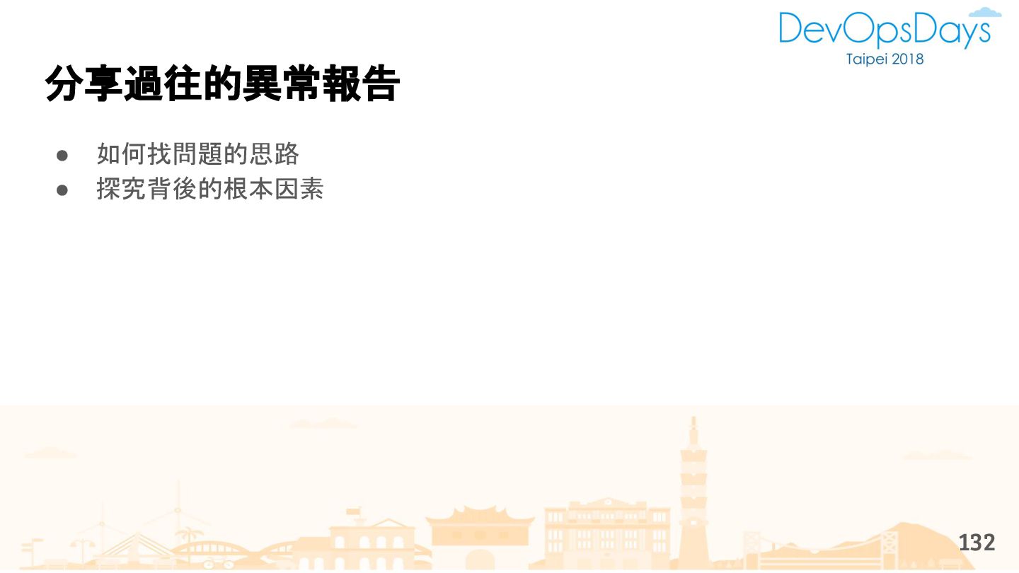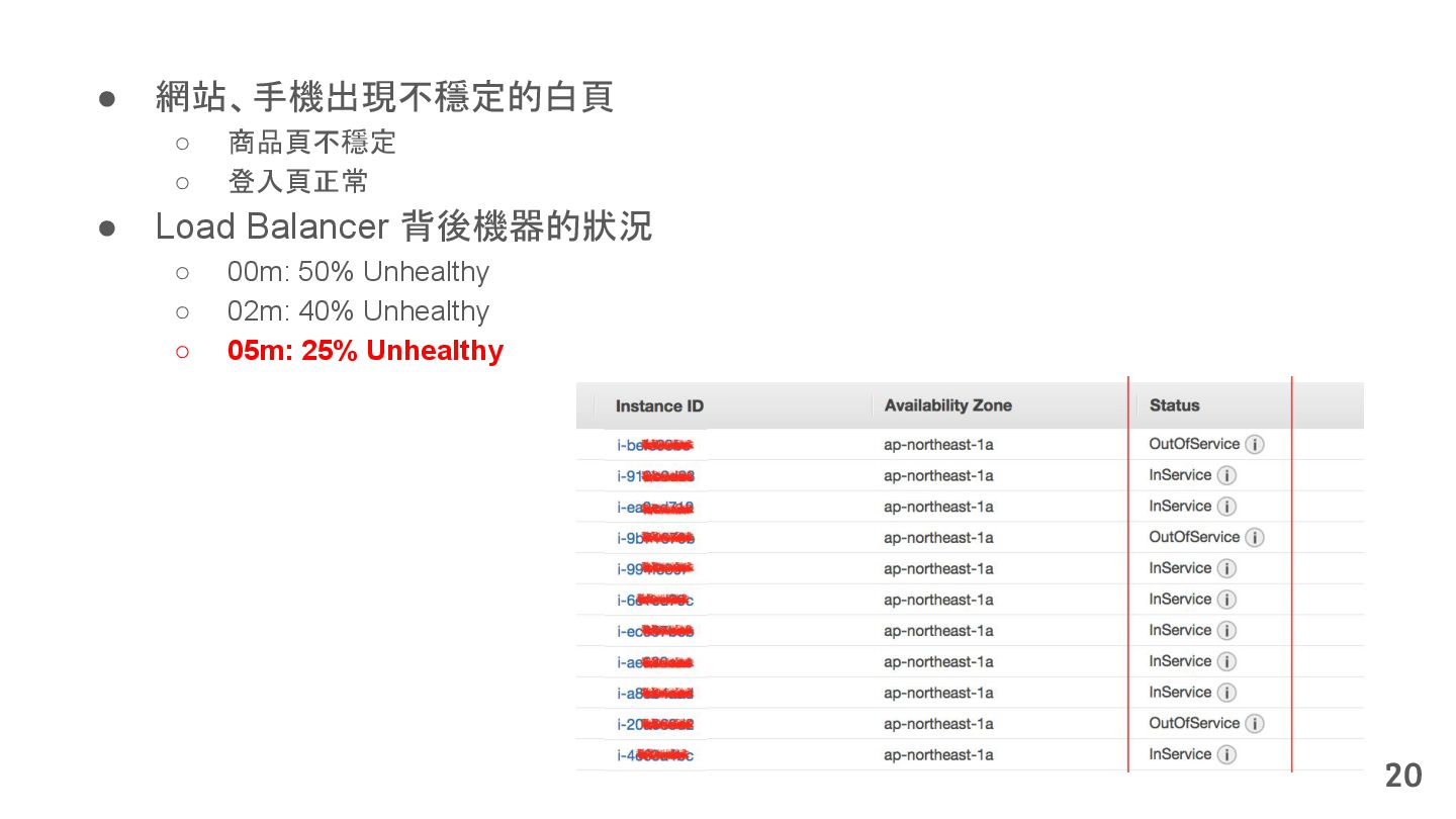 從現象,依據架構、指標,找問題點 (Part II) b. rollback, rollback, rollback c. 用最簡單的方法:加資源、移除有問題的節點、增加新節點、蓋防火巷 • 同步 a. 聯繫相關的人:Backend、Frontend、DBA、Networking b. 蒐集現象、指標 30