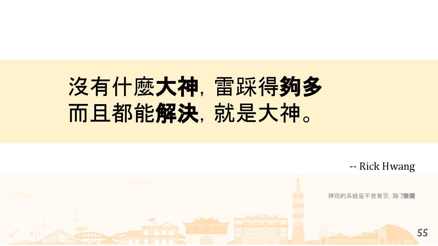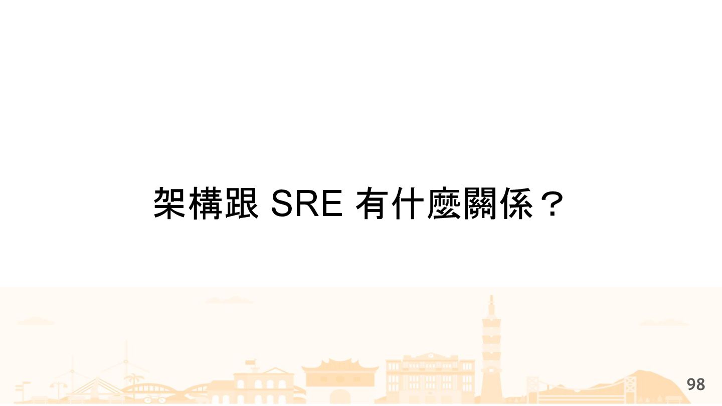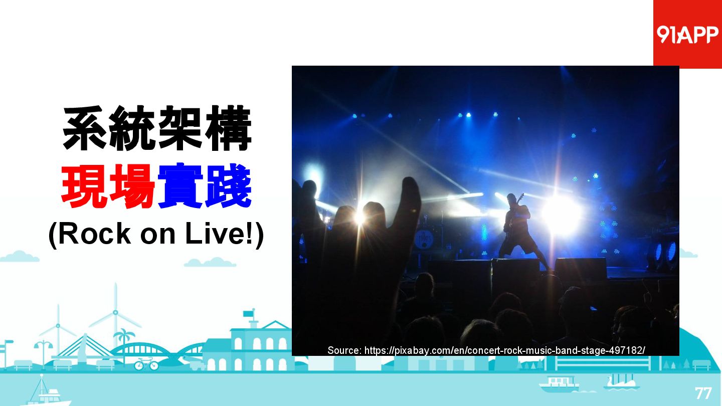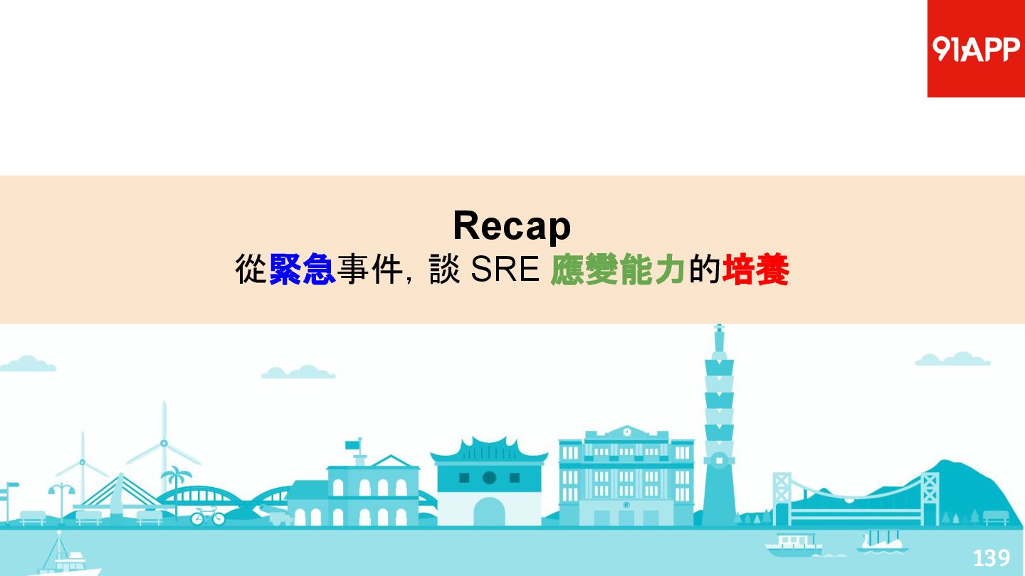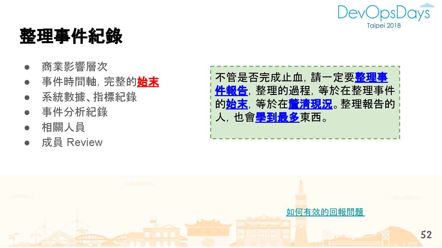 從現象,依據架構、指標,找問題點 (Part II) b. rollback, rollback, rollback c. 用最簡單的方法:加資源、移除有問題的節點、增加新節點、蓋防火巷 • 同步 a. 聯繫相關的人:Backend、Frontend、DBA、Networking b. 蒐集現象、指標 30