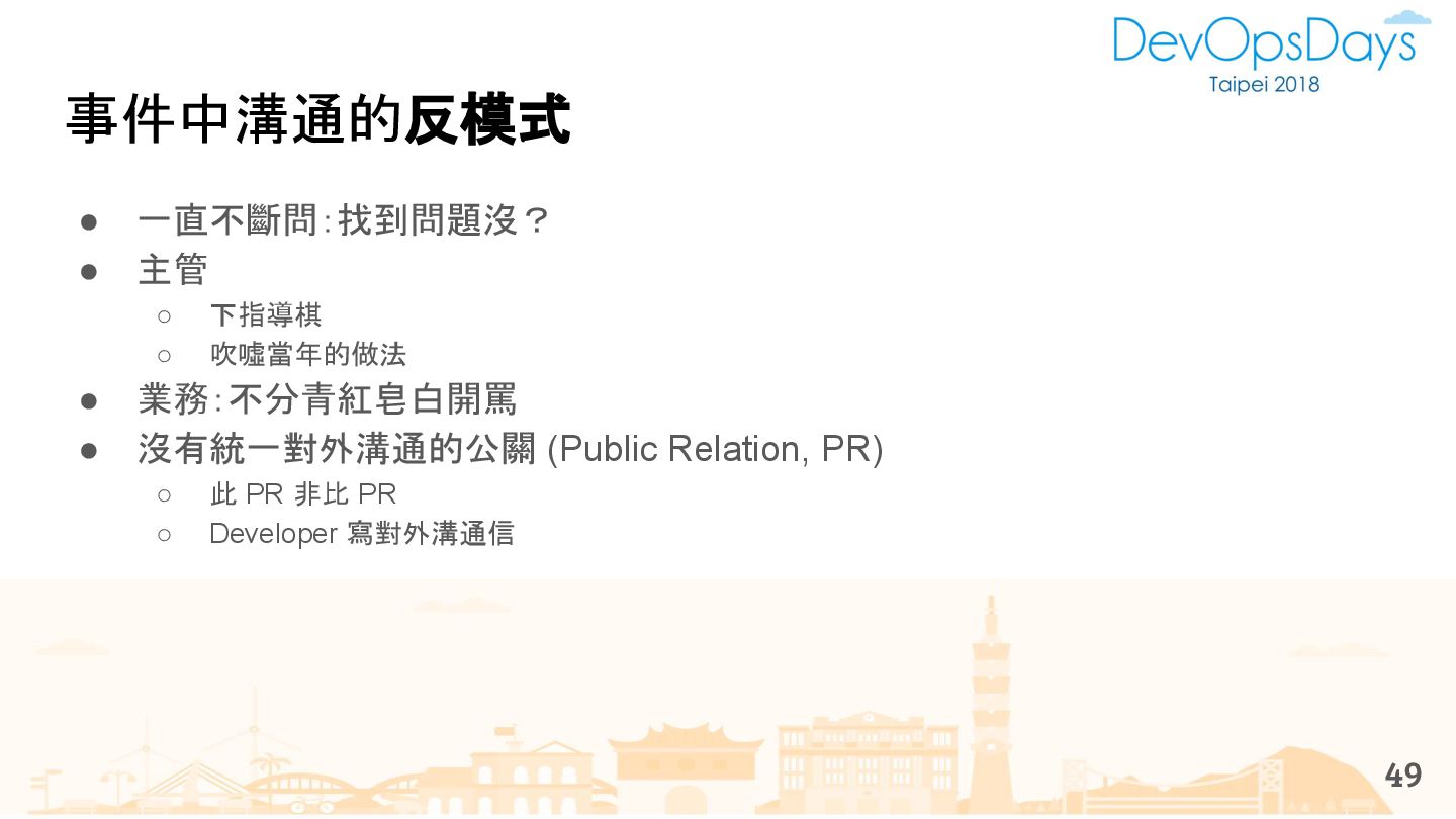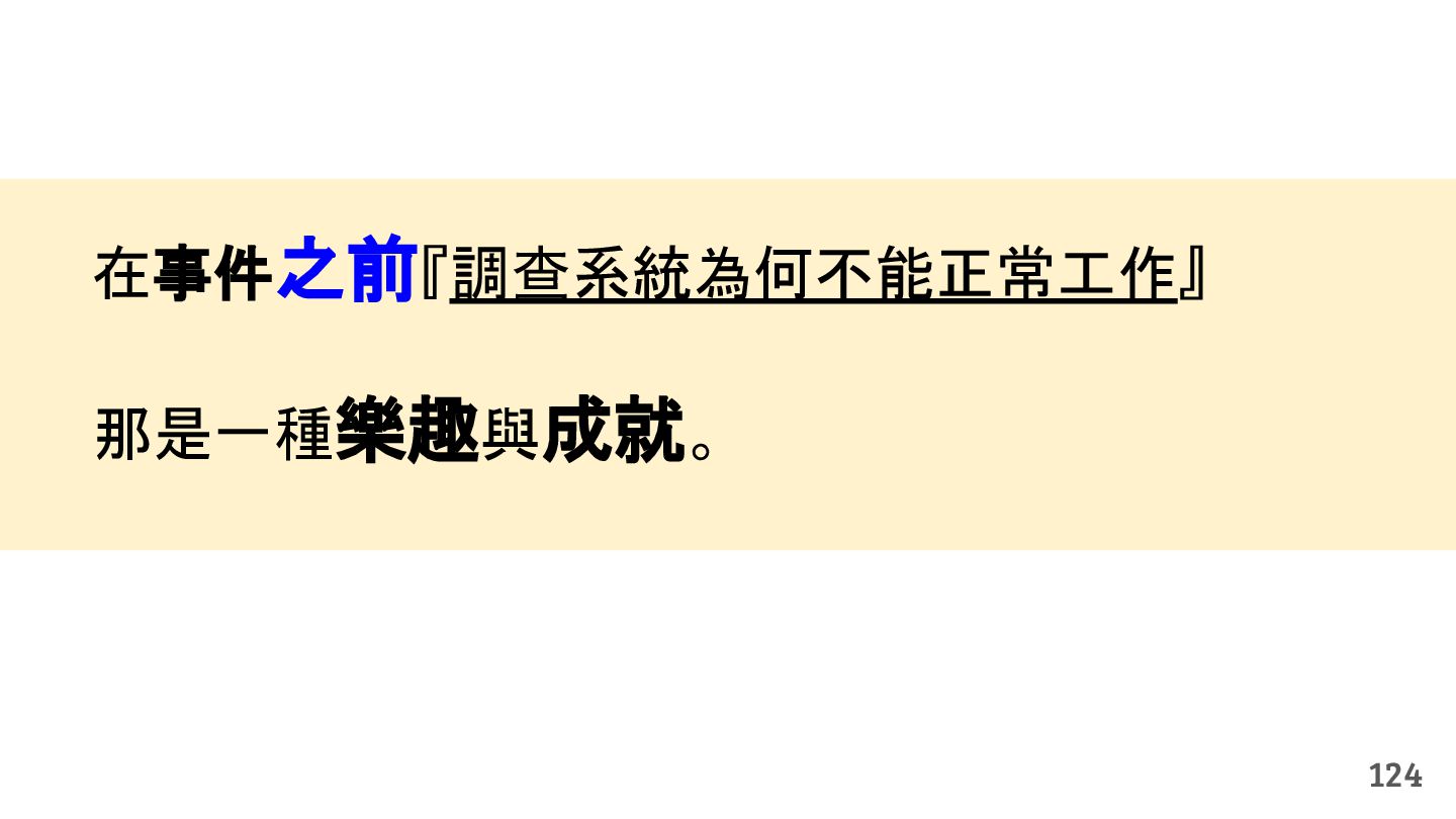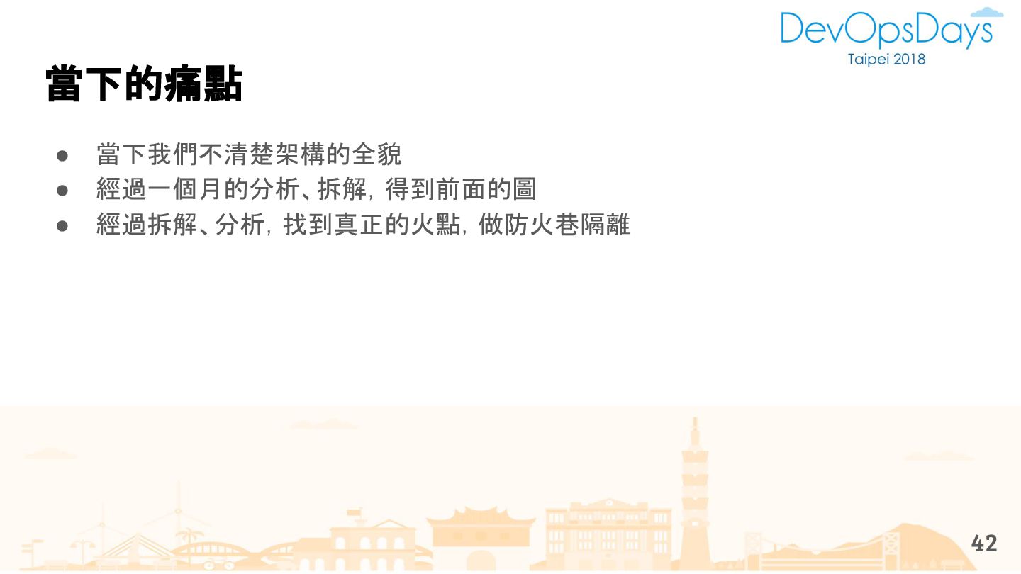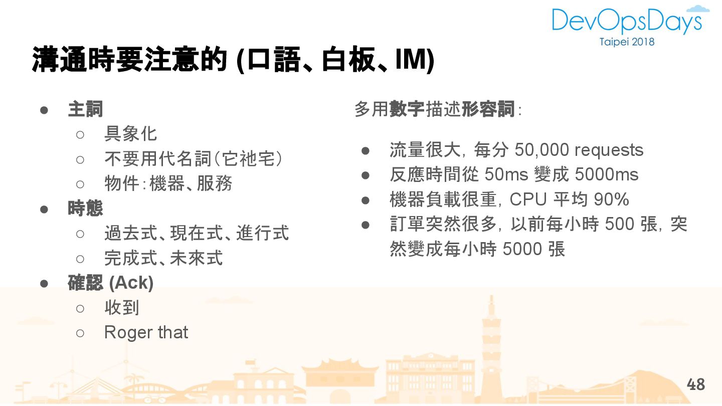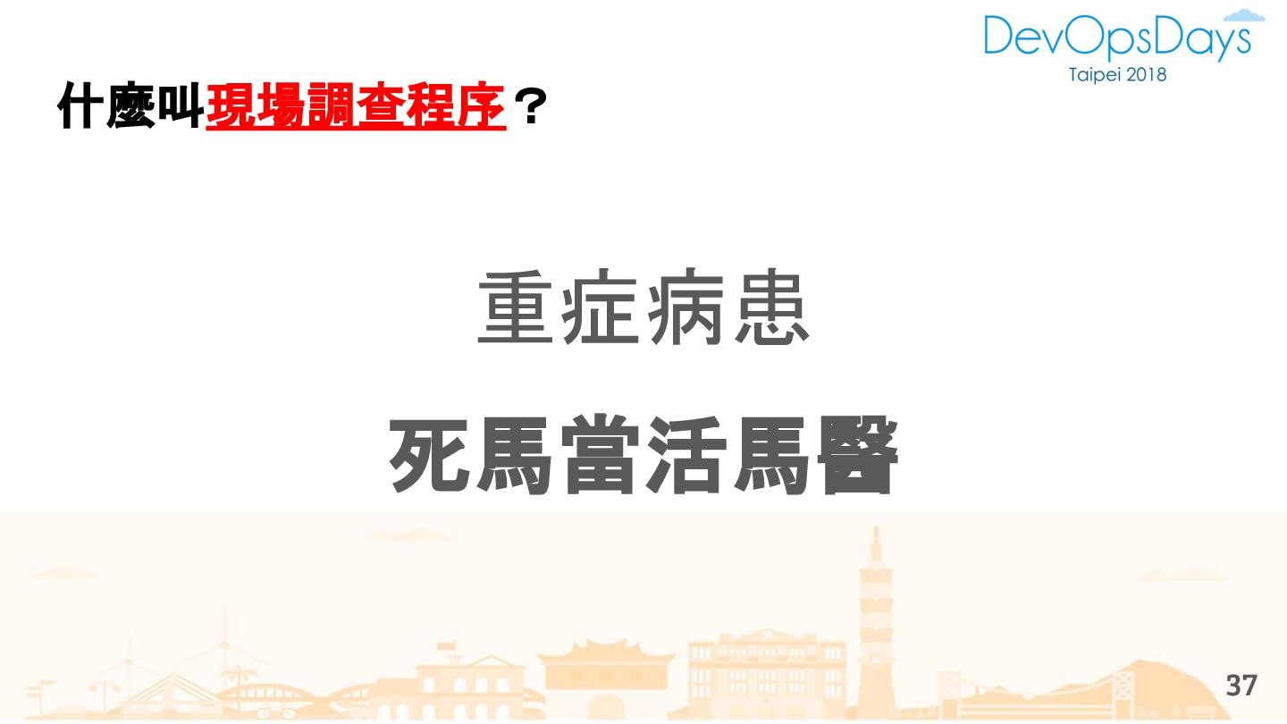 從現象,依據架構、指標,找問題點 (Part II) b. rollback, rollback, rollback c. 用最簡單的方法:加資源、移除有問題的節點、增加新節點、蓋防火巷 • 同步 a. 聯繫相關的人:Backend、Frontend、DBA、Networking b. 蒐集現象、指標 30
