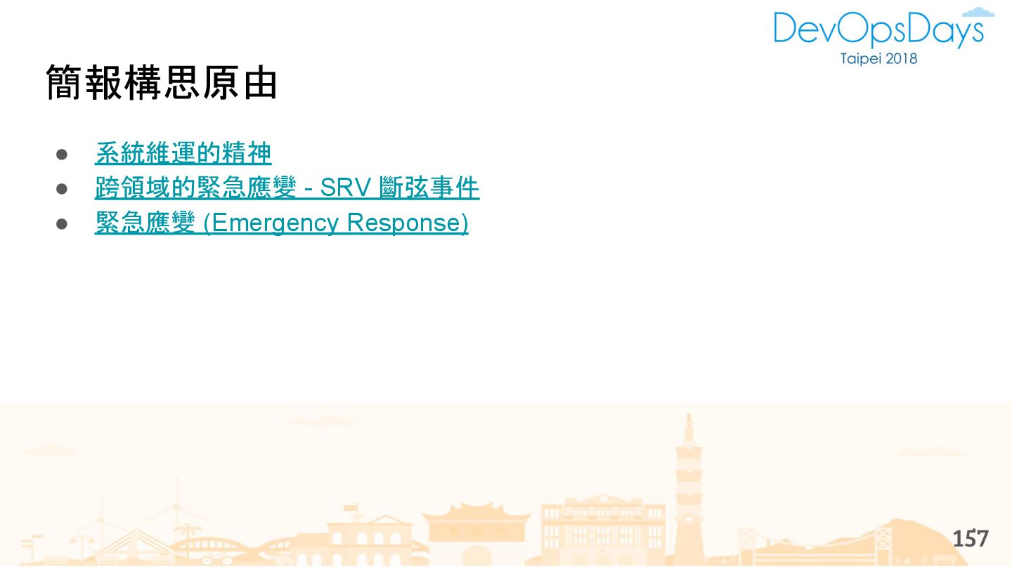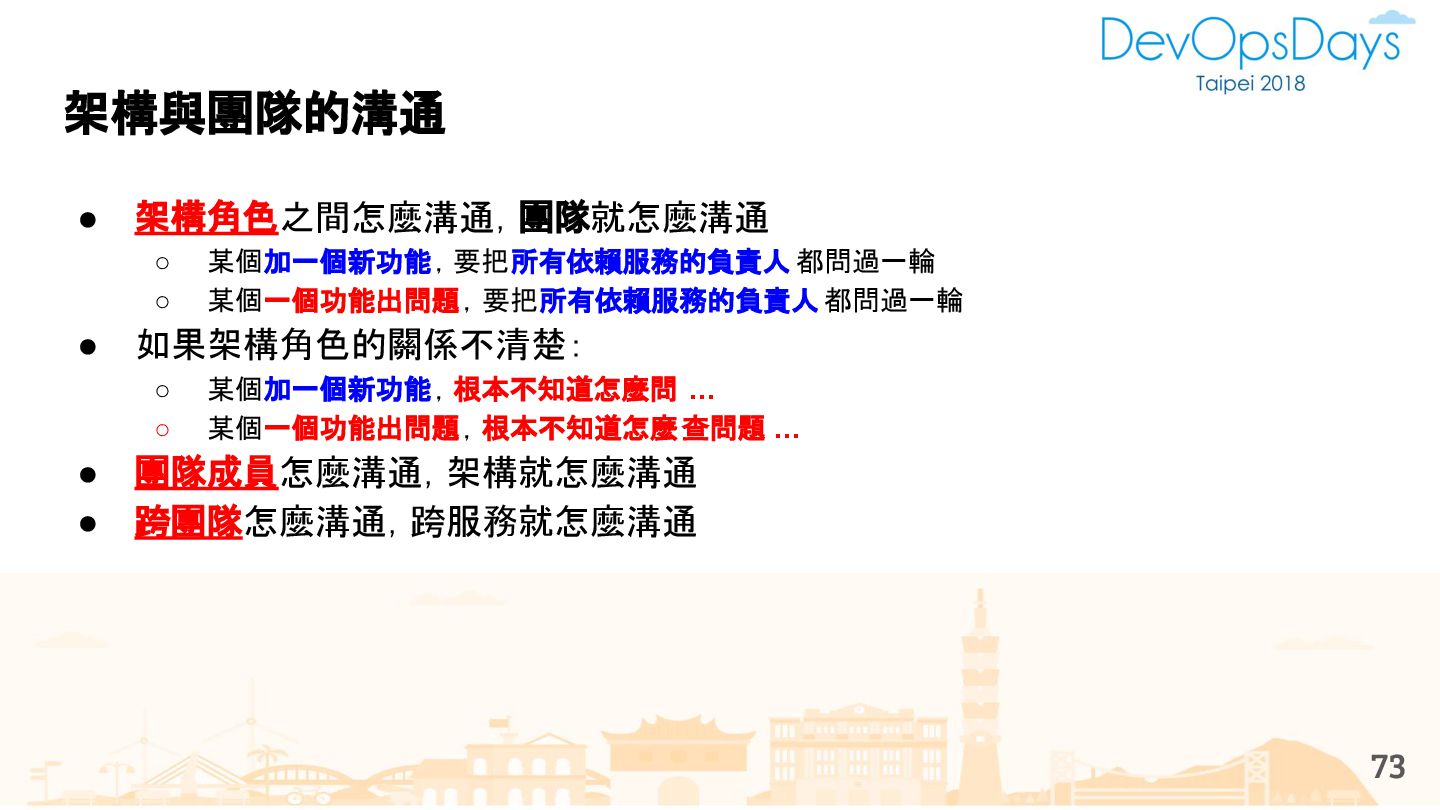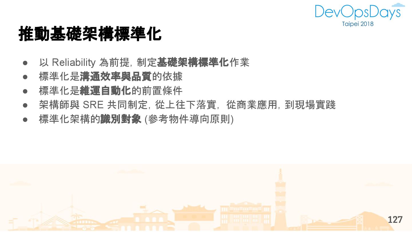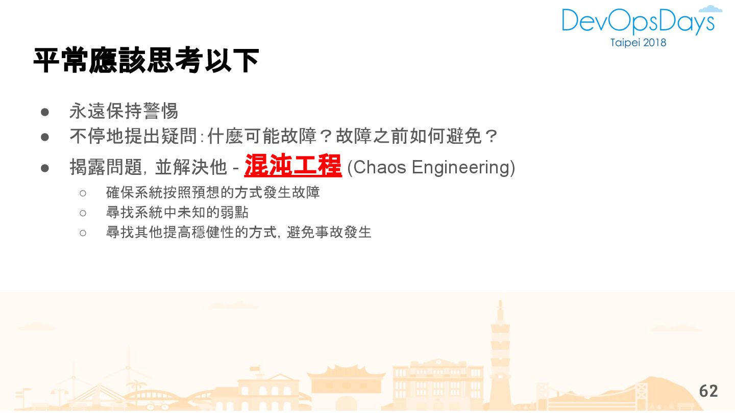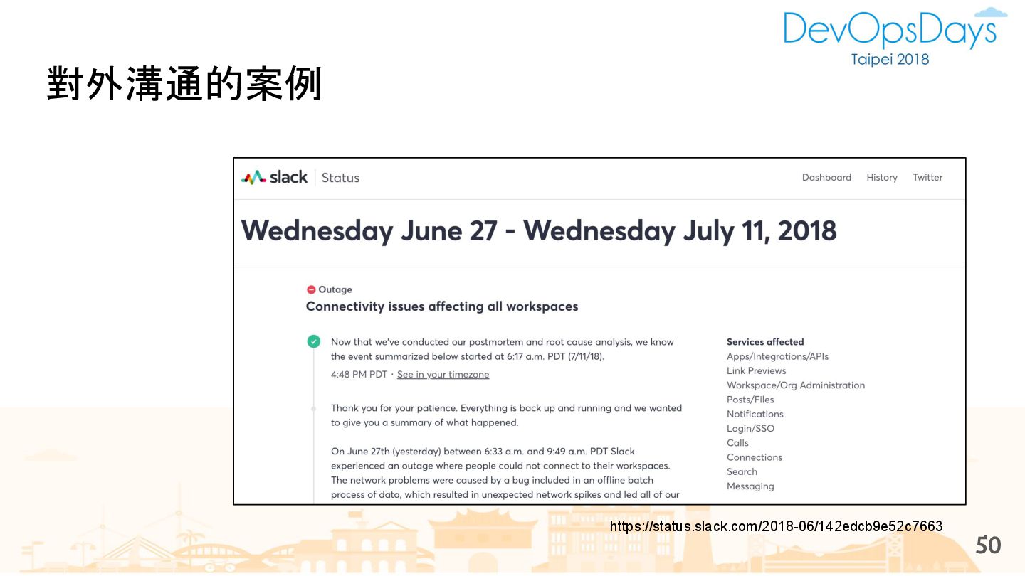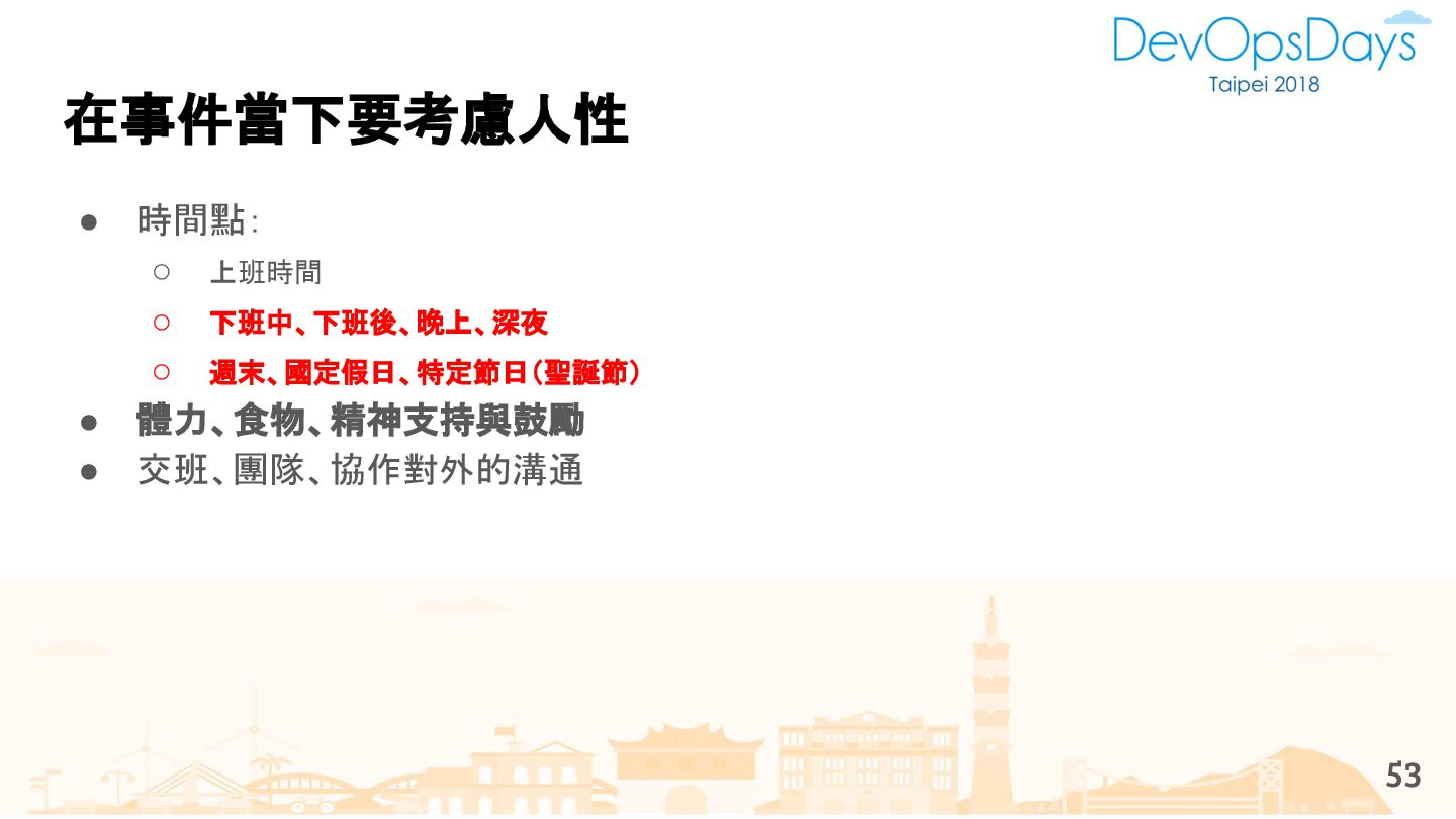 從現象,依據架構、指標,找問題點 (Part II) b. rollback, rollback, rollback c. 用最簡單的方法:加資源、移除有問題的節點、增加新節點、蓋防火巷 • 同步 a. 聯繫相關的人:Backend、Frontend、DBA、Networking b. 蒐集現象、指標 30