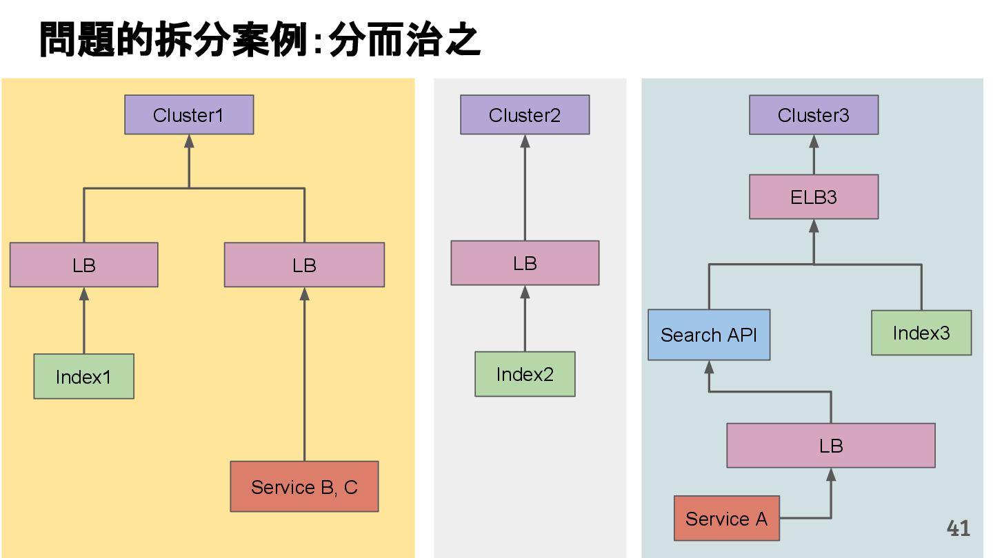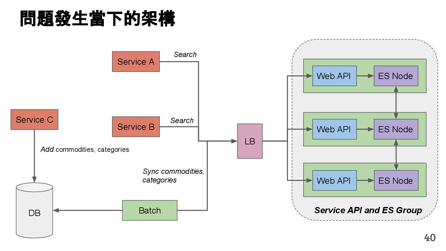 Batch DB Sync commodities, categories Service A Search Service C Add commodities, categories Web API ES Node Web API ES Node Service B Search 40 問題發生當下的架構