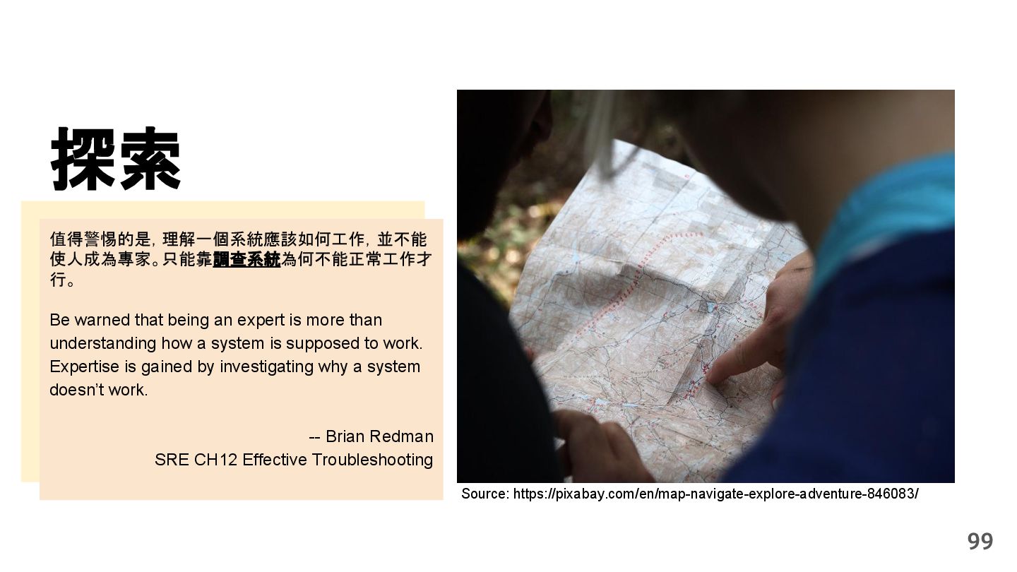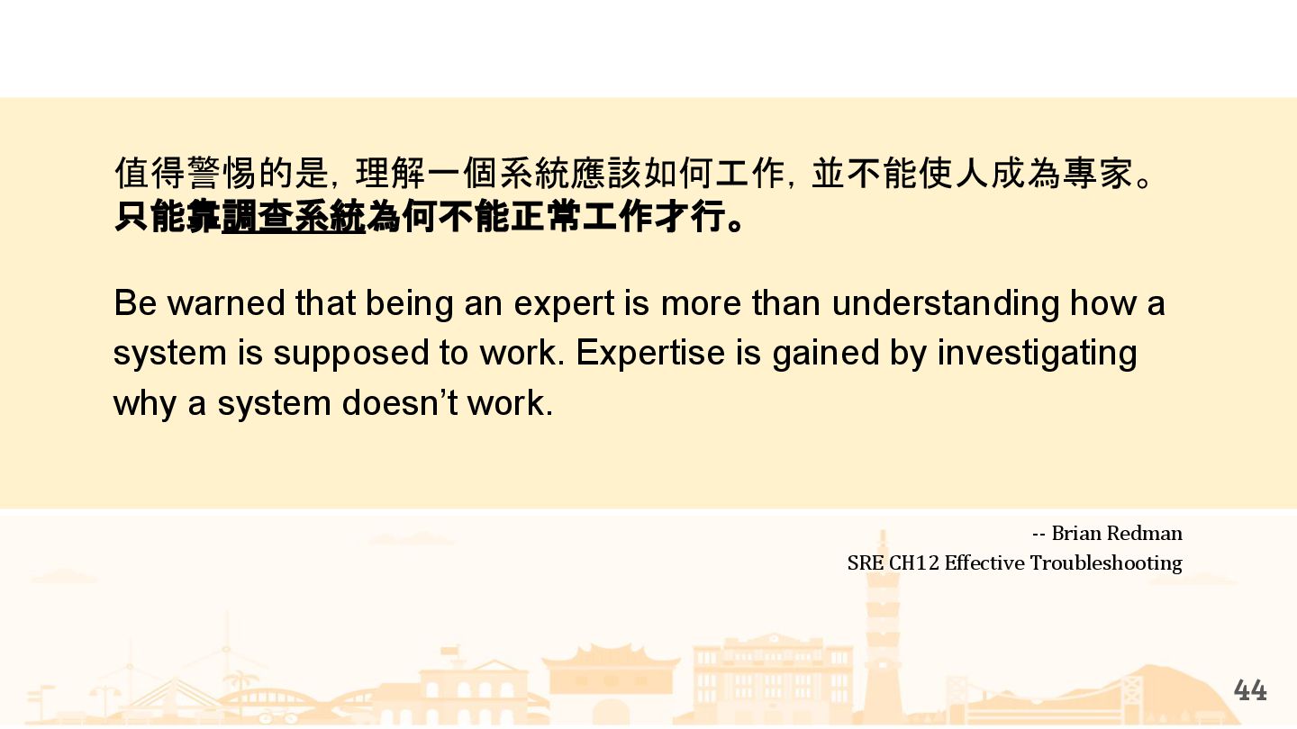 being an expert is more than understanding how a system is supposed to work. Expertise is gained by investigating why a system doesn’t work. -- Brian Redman SRE CH12 Effective Troubleshooting