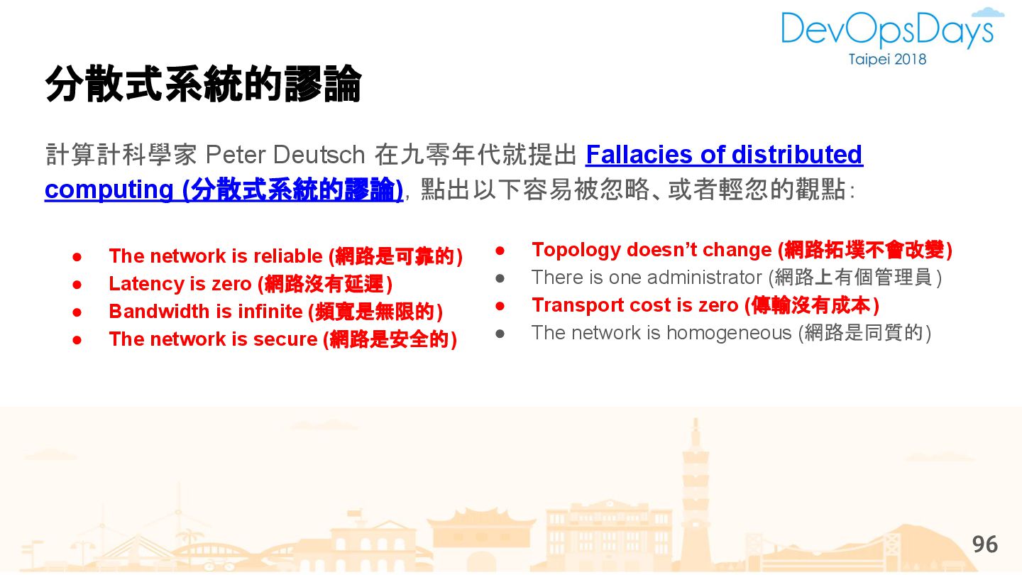 (網路沒有延遲) • Bandwidth is infinite (頻寬是無限的) • The network is secure (網路是安全的) 計算計科學家 Peter Deutsch 在九零年代就提出 Fallacies of distributed computing (分散式系統的謬論),點出以下容易被忽略、或者輕忽的觀點: 分散式系統的謬論 96 • Topology doesn’t change (網路拓墣不會改變) • There is one administrator (網路上有個管理員) • Transport cost is zero (傳輸沒有成本) • The network is homogeneous (網路是同質的)
