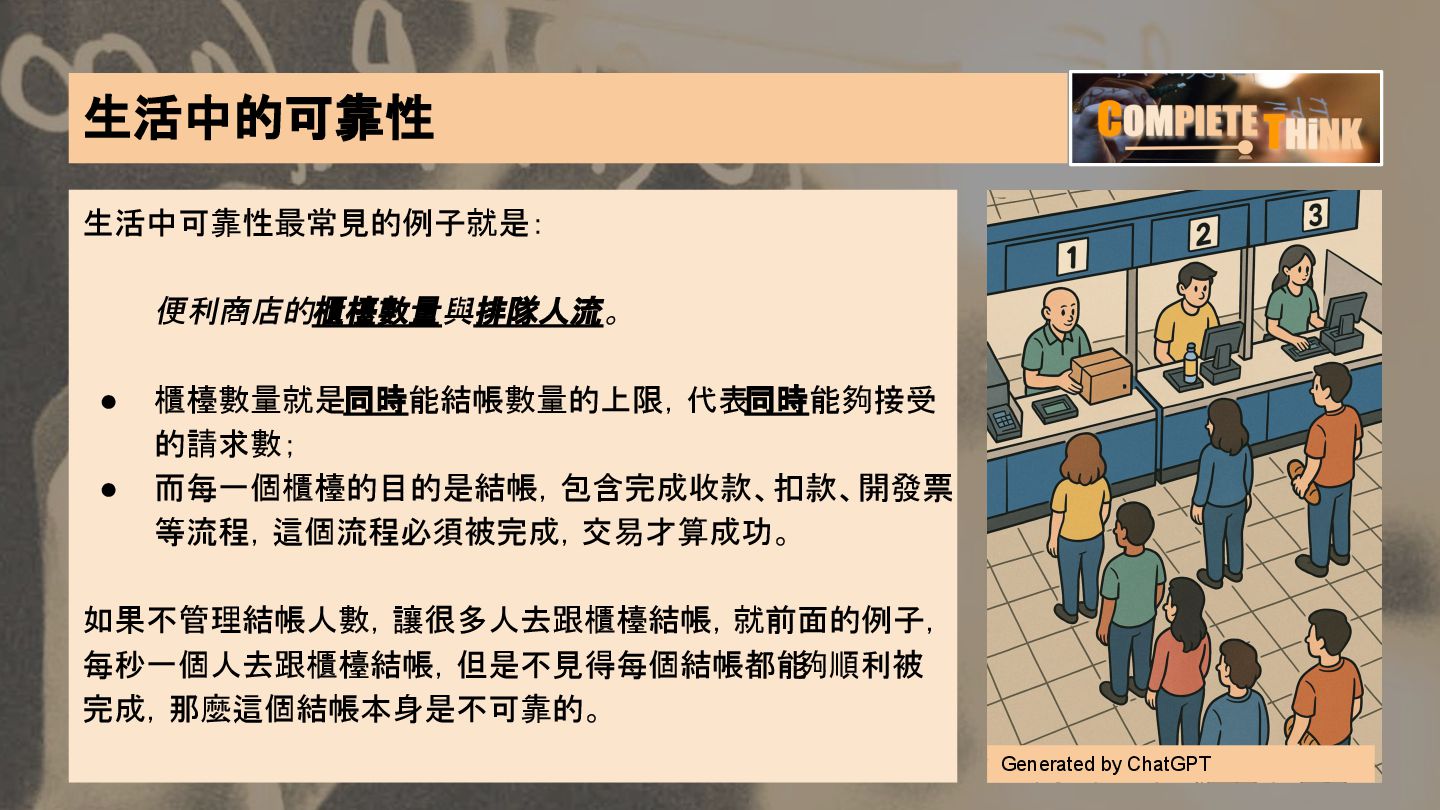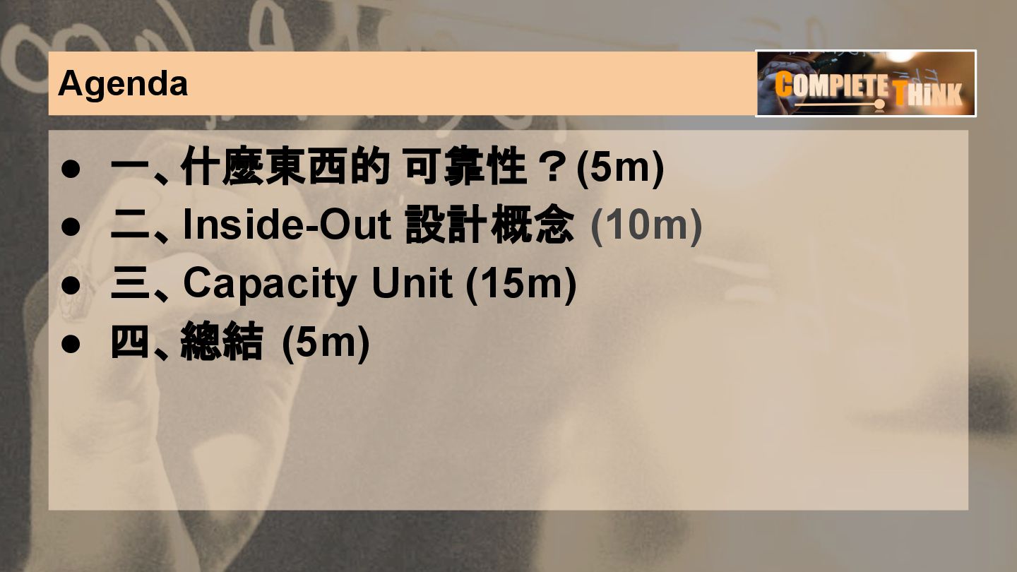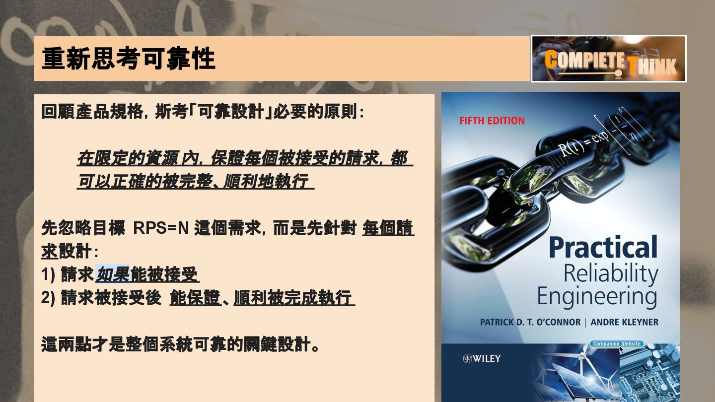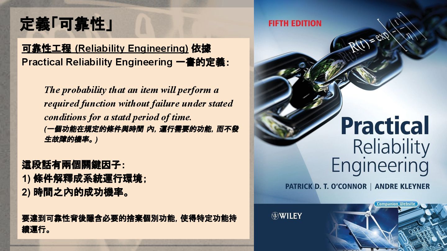 that an item will perform a required function without failure under stated conditions for a statd period of time. (一個功能在規定的條件與時間 內,運行需要的功能,而不發 生故障的機率。 ) 這段話有兩個關鍵因子: 1) 條件解釋成系統運行環境; 2) 時間之內的成功機率。 要達到可靠性背後隱含必要的捨棄個別功能,使得特定功能持 續運行。 定義「可靠性」