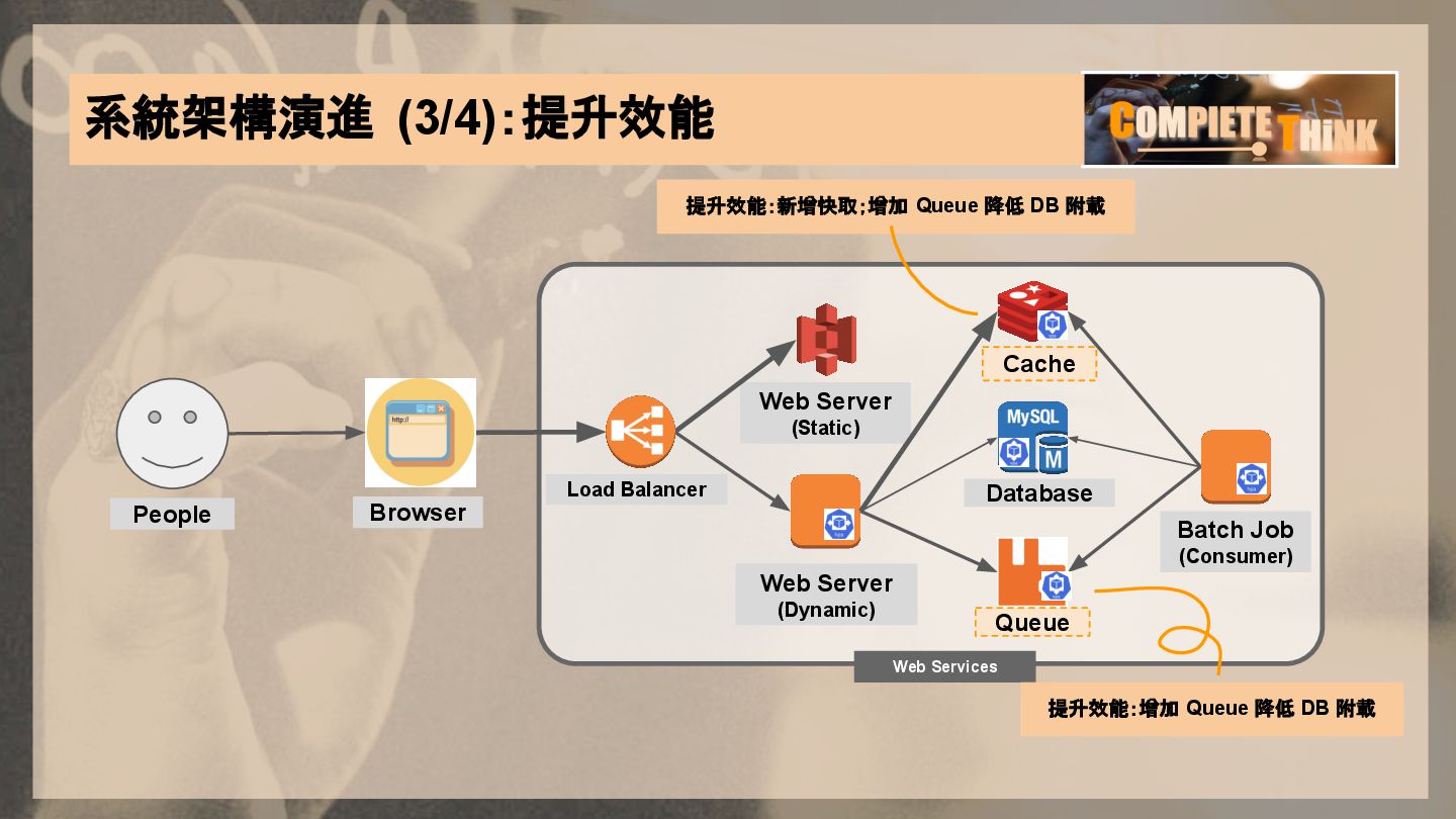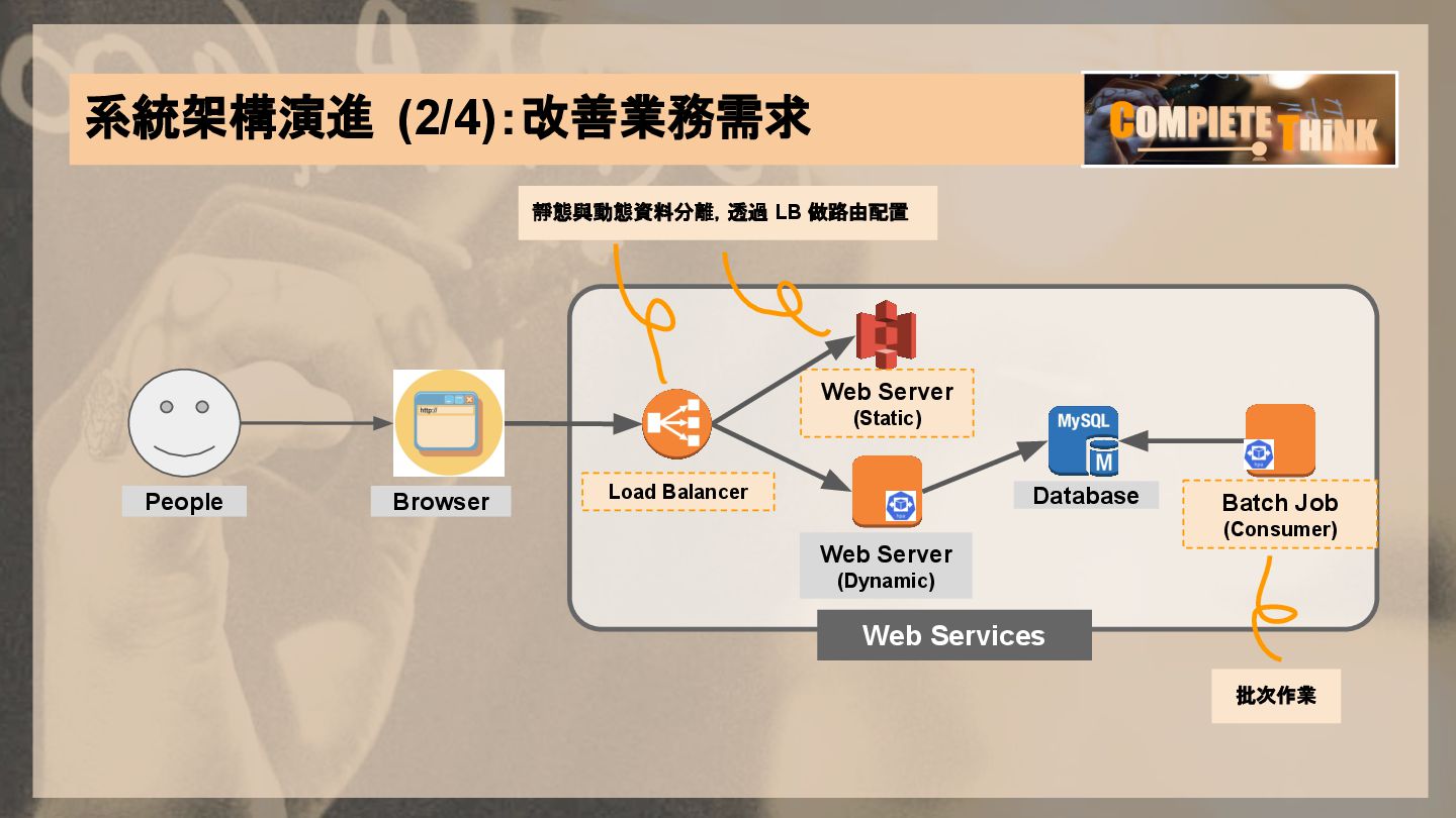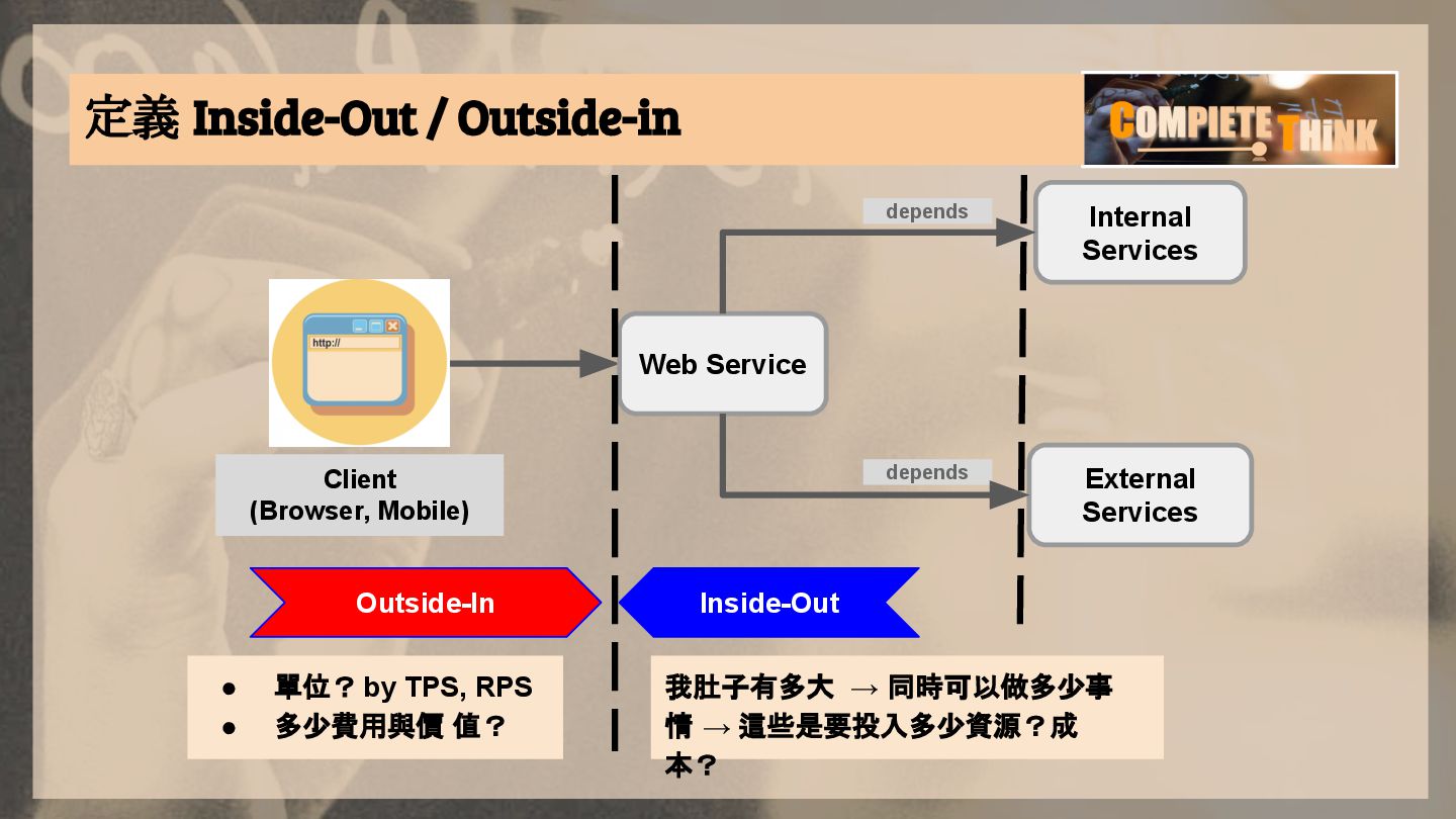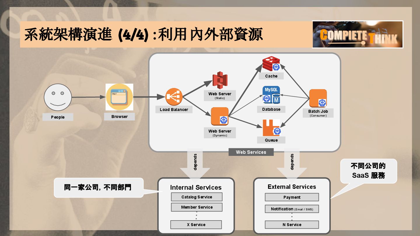 Server (Static) Batch Job (Consumer) Cache Queue Browser People Load Balancer Internal Services Member Service Catalog Service External Services Notification (Email / SMS) Payment depends X Service N Service depends 同一家公司,不同部門 不同公司的 SaaS 服務