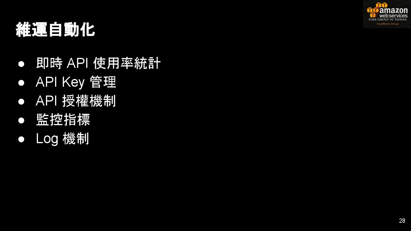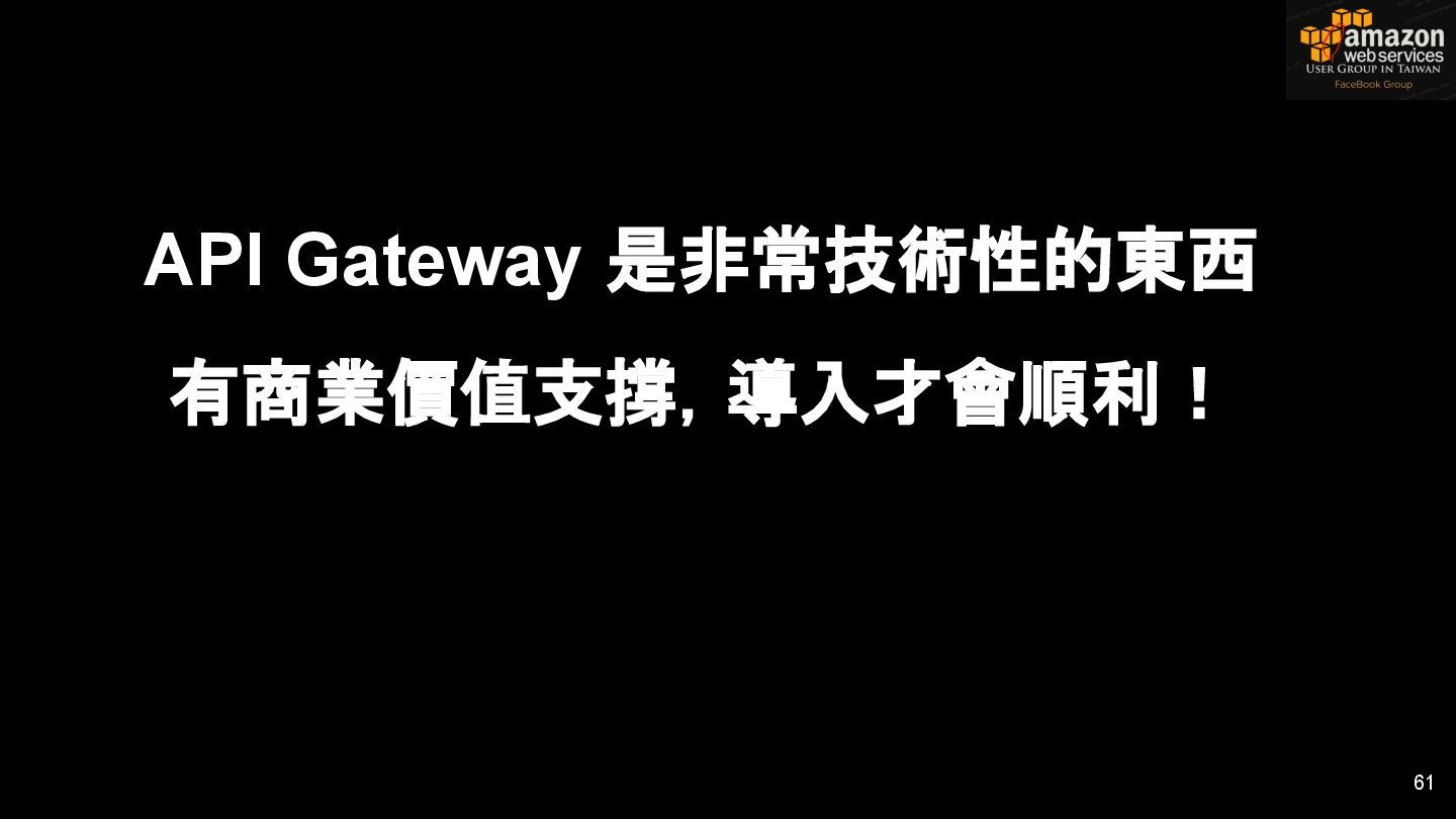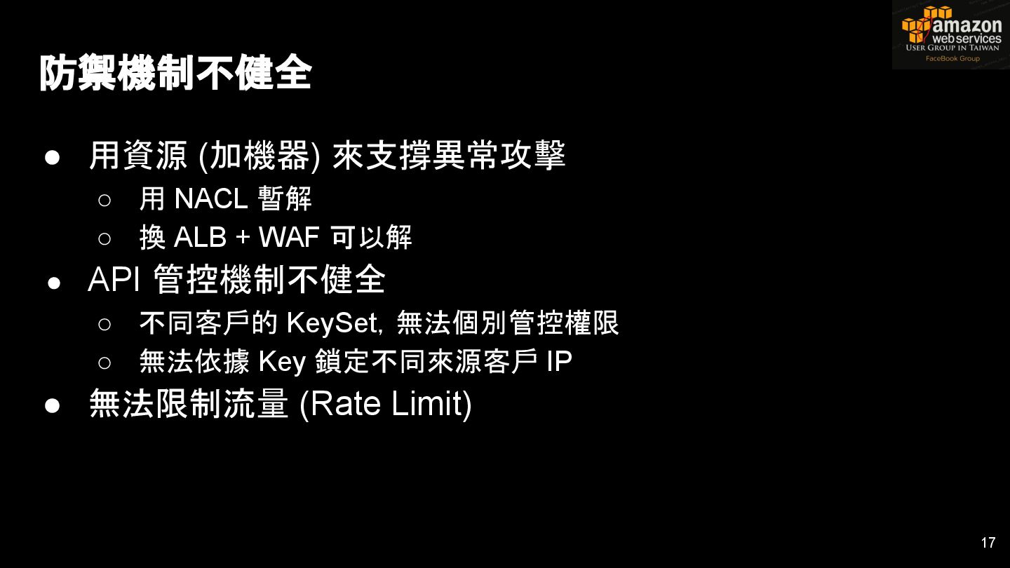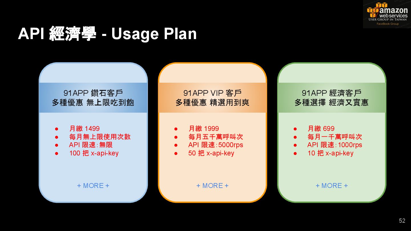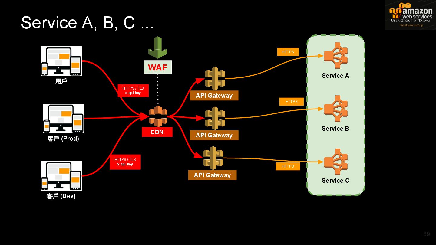 HTTPS HTTPS API Gateway Service B HTTPS CDN 用戶 WAF API Endpoint /ServiceName /Version/RestAPI 客戶 (Dev) HTTPS / TLS x-api-key 1. Rate Limit 2. Access Control 3. Monitoring 4. Usage Plan API Gateway API Gateway 46 Service A, B, C ...