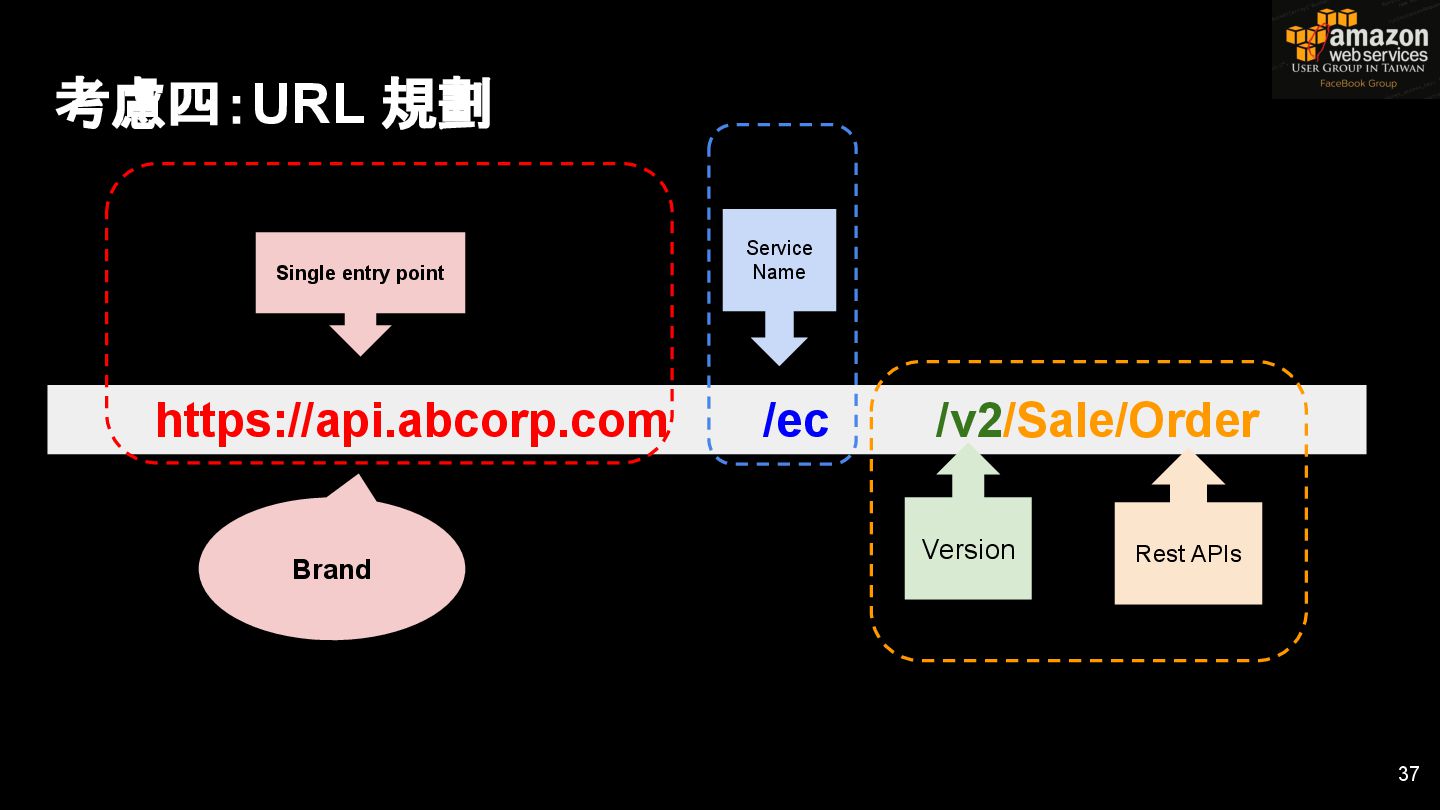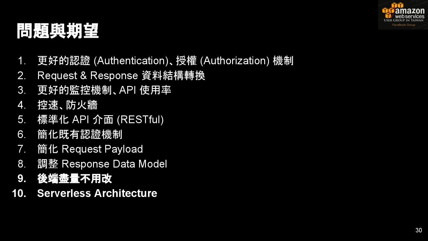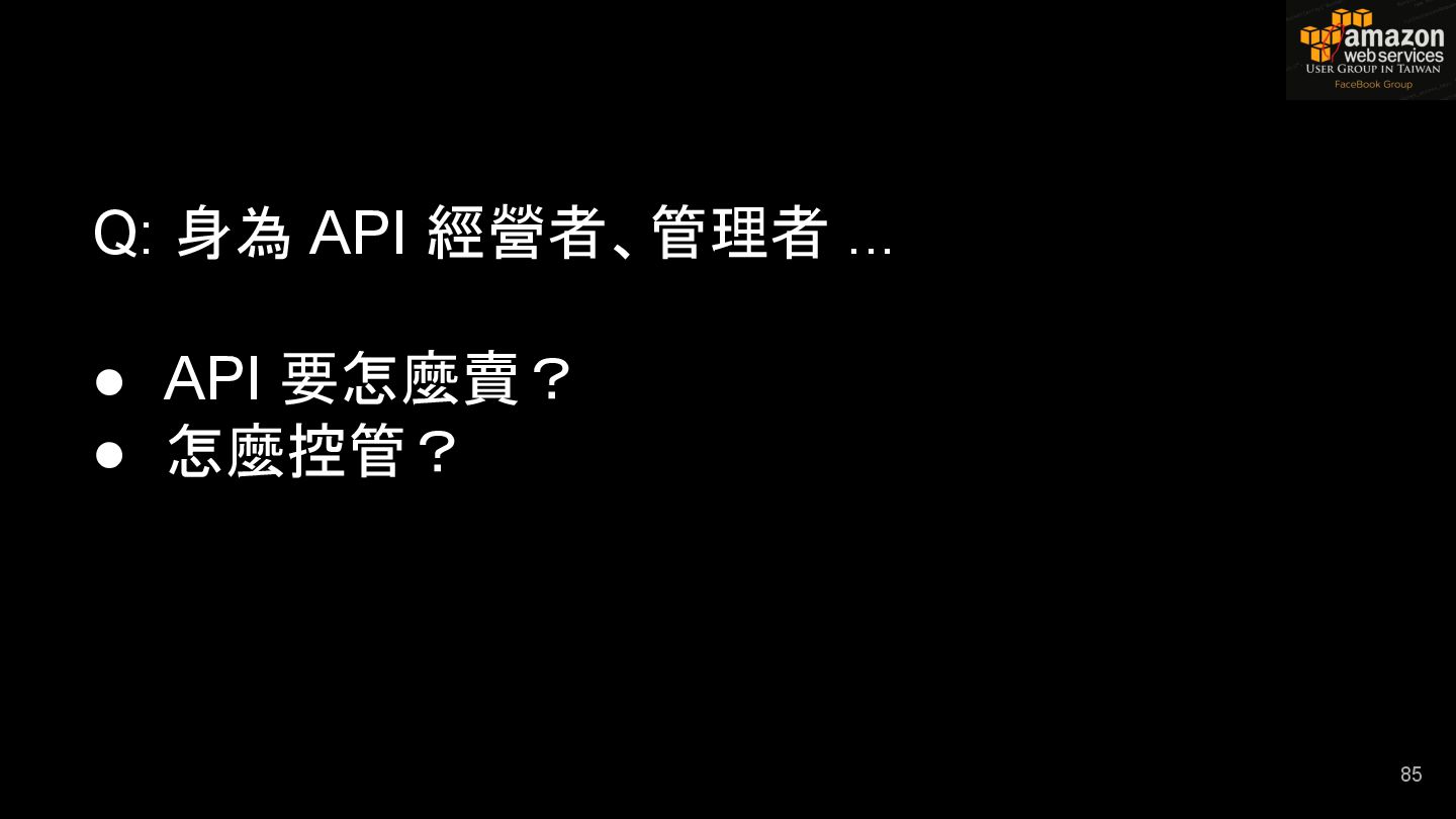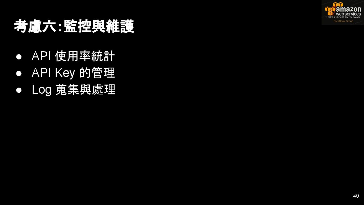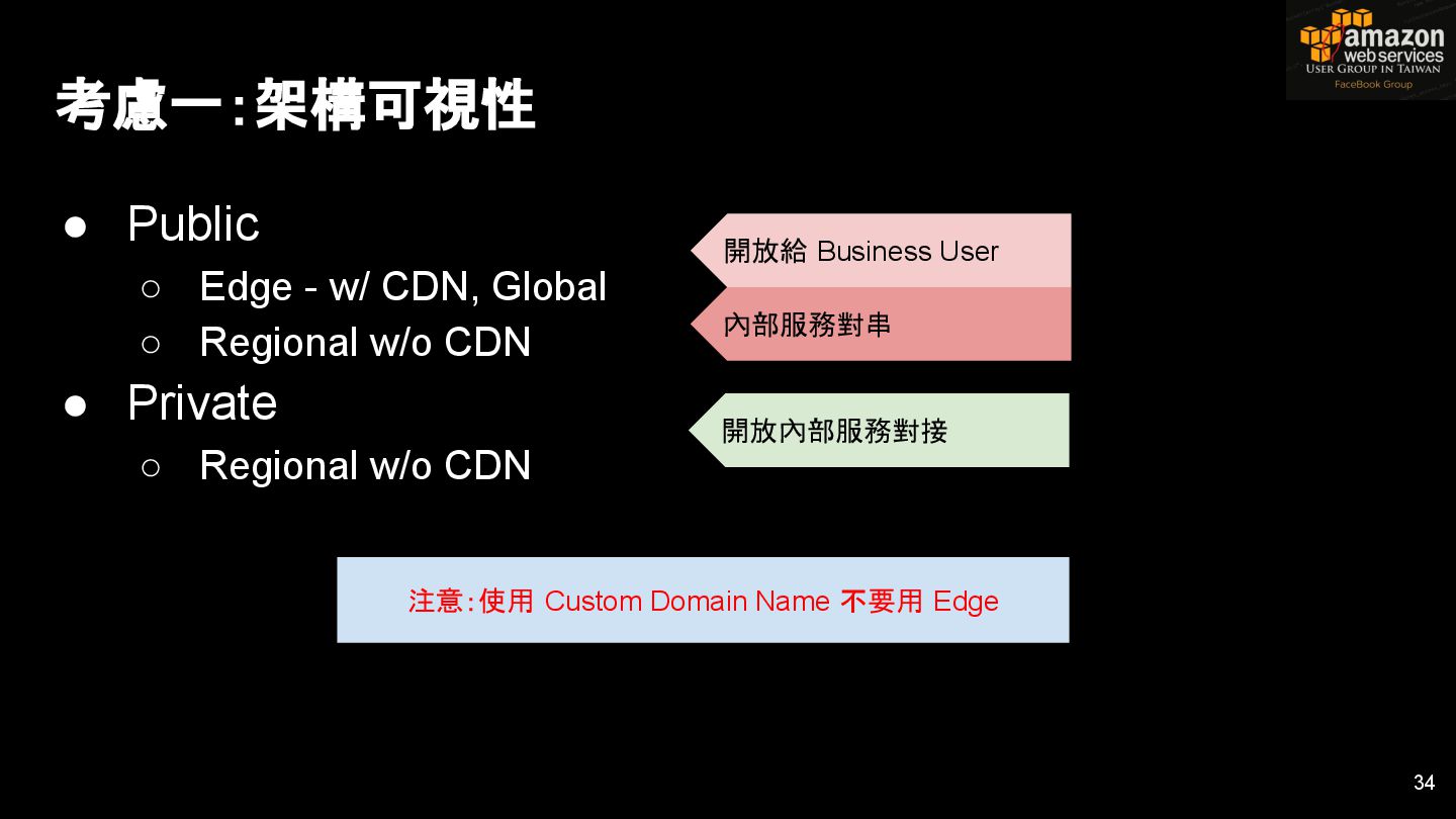 HTTPS HTTPS API Gateway Service B HTTPS CDN 用戶 WAF API Endpoint /ServiceName /Version/RestAPI 客戶 (Dev) HTTPS / TLS x-api-key 1. Rate Limit 2. Access Control 3. Monitoring 4. Usage Plan API Gateway API Gateway 46 Service A, B, C ...