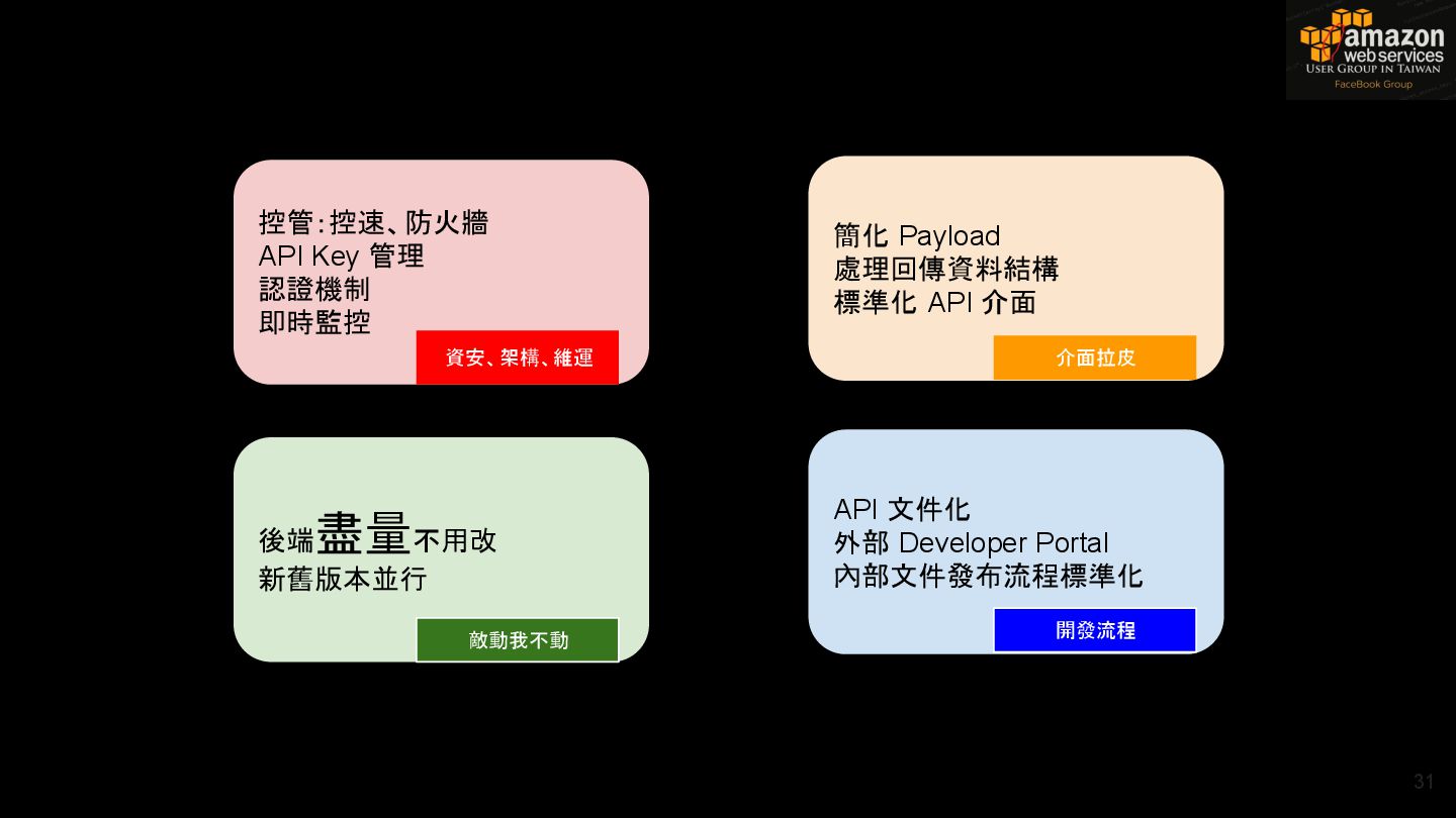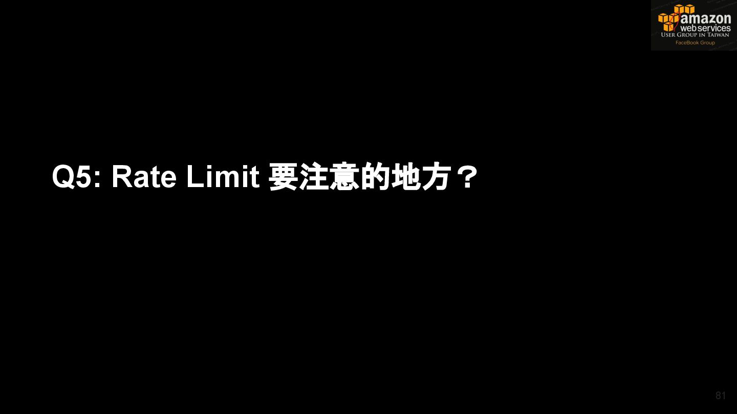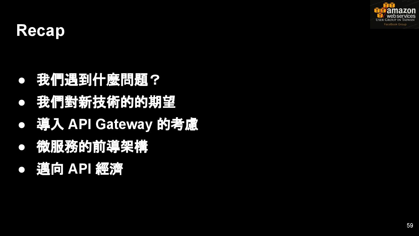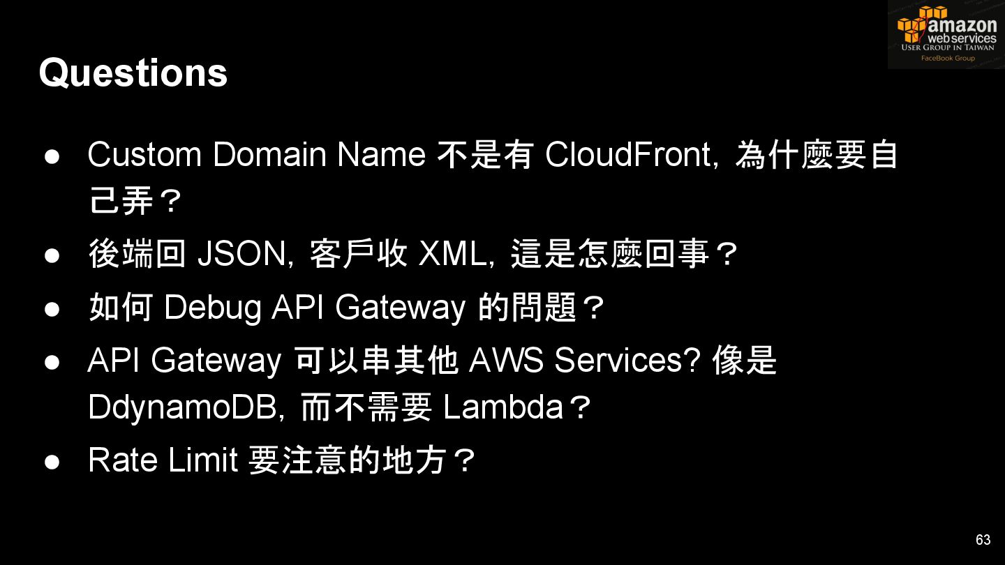 HTTPS HTTPS API Gateway Service B HTTPS CDN 用戶 WAF API Endpoint /ServiceName /Version/RestAPI 客戶 (Dev) HTTPS / TLS x-api-key 1. Rate Limit 2. Access Control 3. Monitoring 4. Usage Plan API Gateway API Gateway 46 Service A, B, C ...