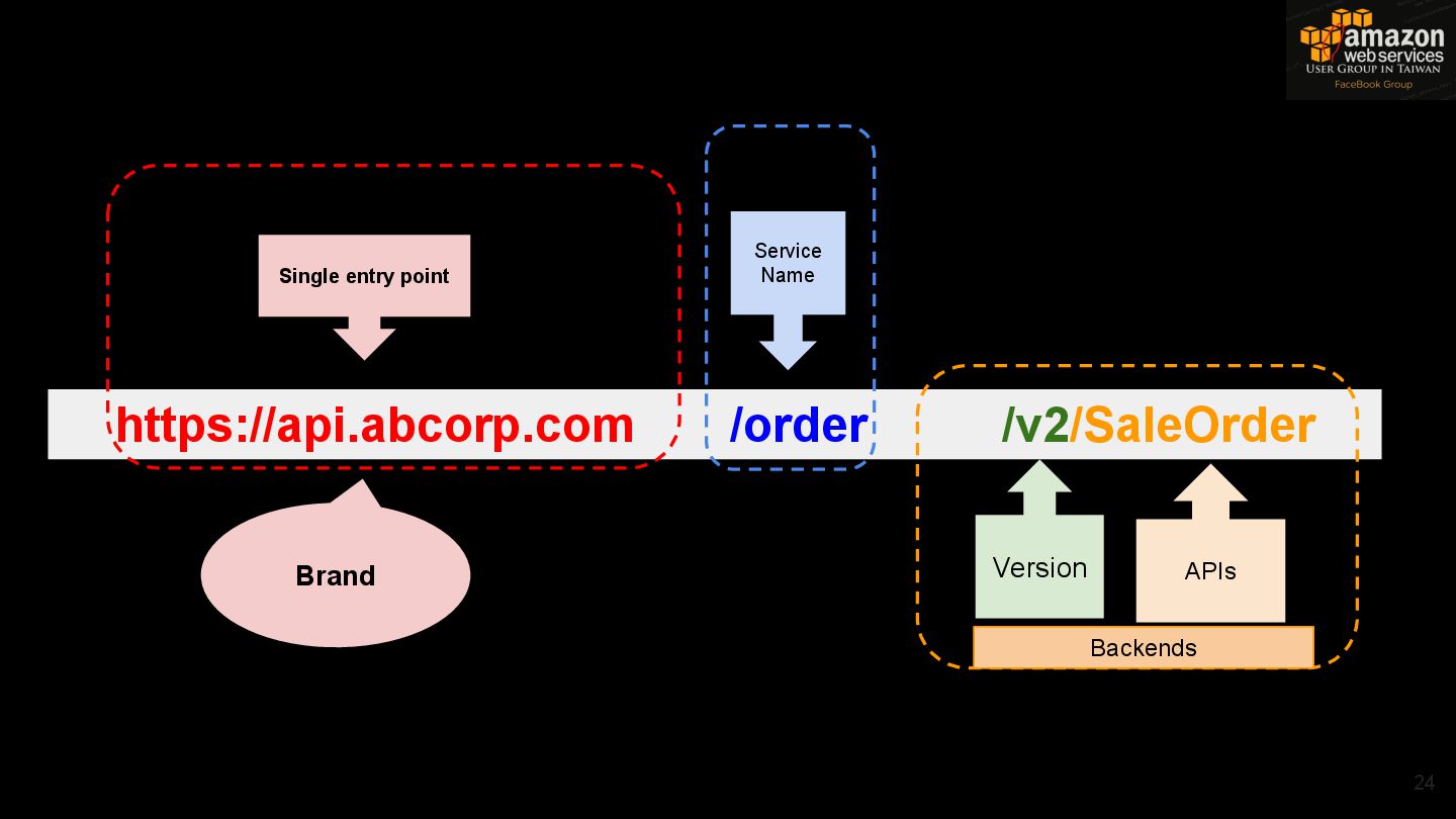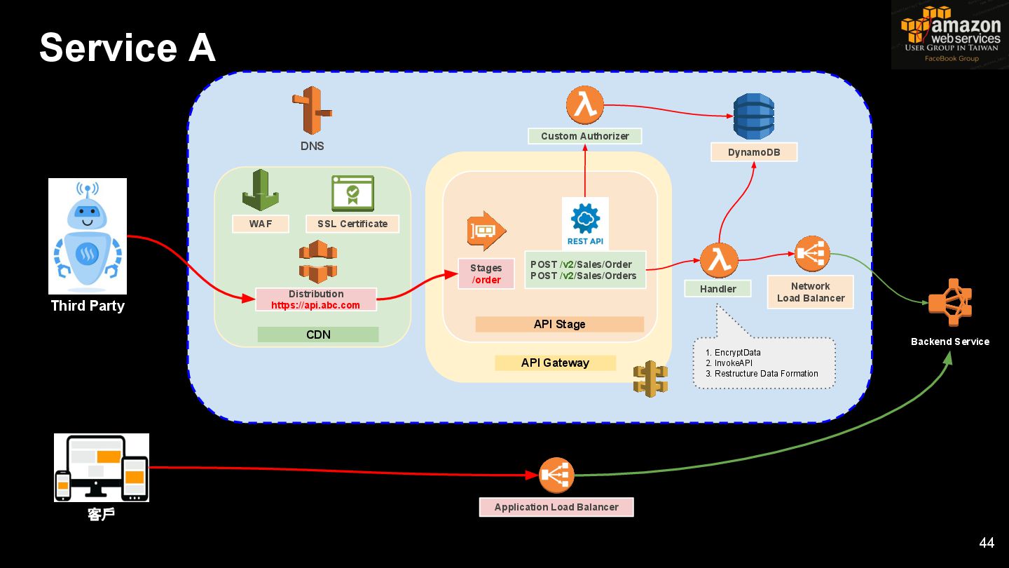 Stages /order API Stage POST /v2/Sales/Order POST /v2/Sales/Orders Custom Authorizer DynamoDB Handler Backend Service Network Load Balancer 1. EncryptData 2. InvokeAPI 3. Restructure Data Formation Third Party Application Load Balancer 客戶 Service A