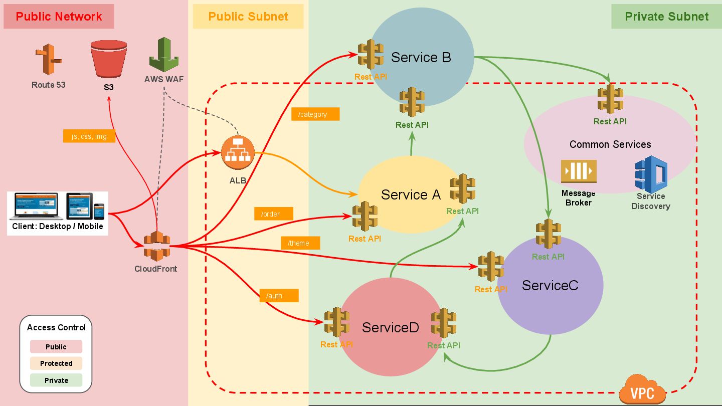 API Rest API ServiceD Rest API Rest API ServiceC Rest API Rest API CloudFront AWS WAF Route 53 ALB Client: Desktop / Mobile S3 Private Public Protected Access Control Public Subnet Private Subnet Public Network /category /order /auth /theme js, css, img Message Broker Common Services Rest API Service Discovery