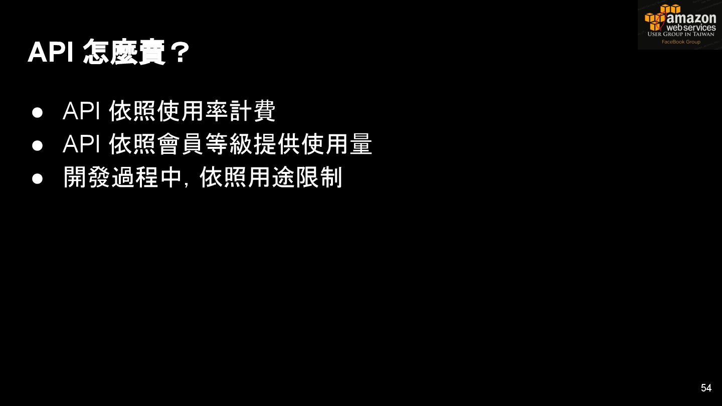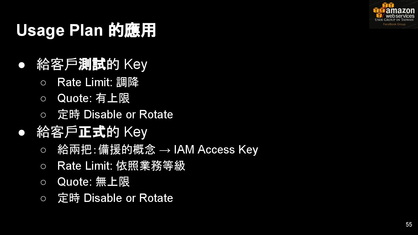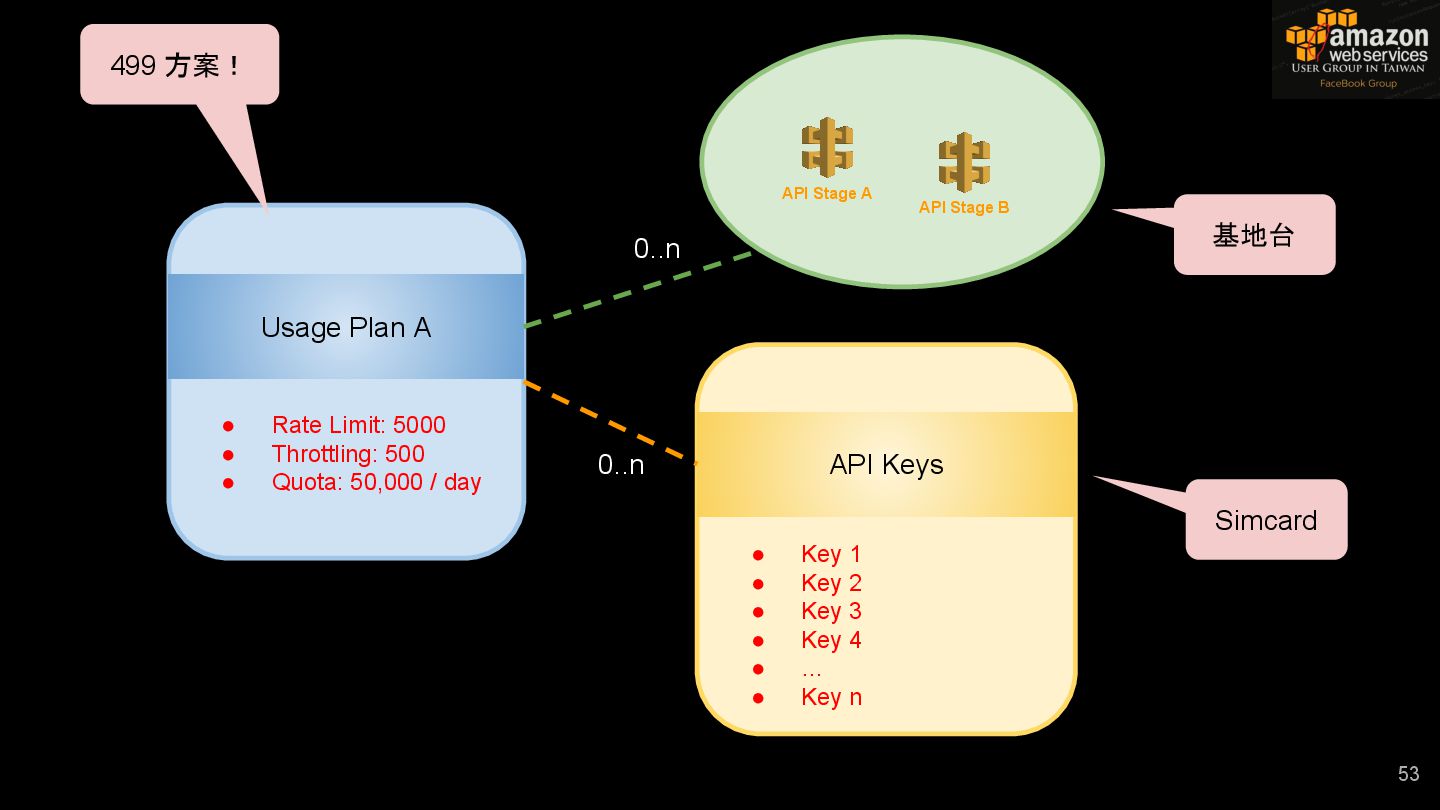 Key 4 • … • Key n • Rate Limit: 5000 • Throttling: 500 • Quota: 50,000 / day 53 Usage Plan A API Keys API Stage A API Stage B 0..n 0..n 499 方案! Simcard 基地台