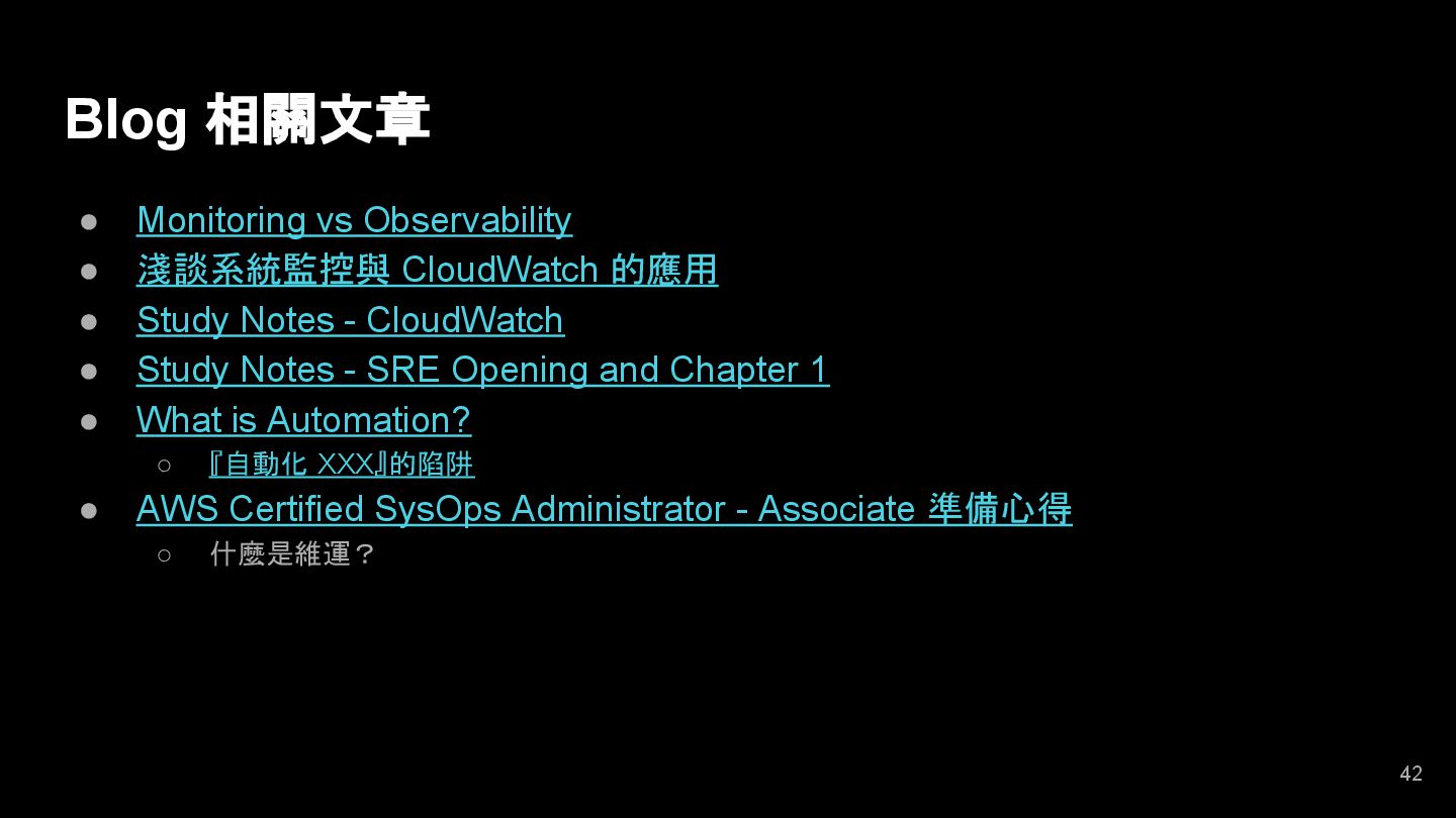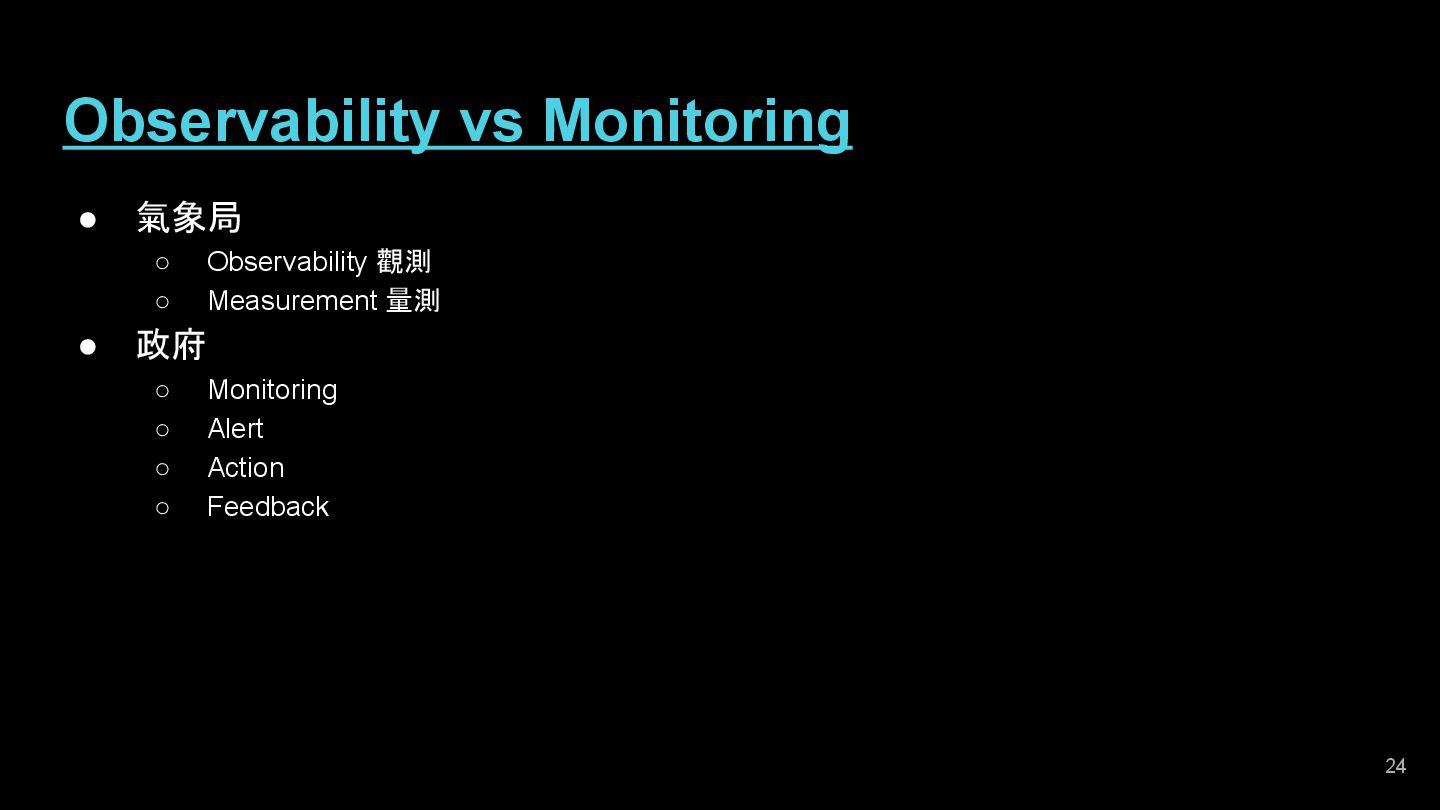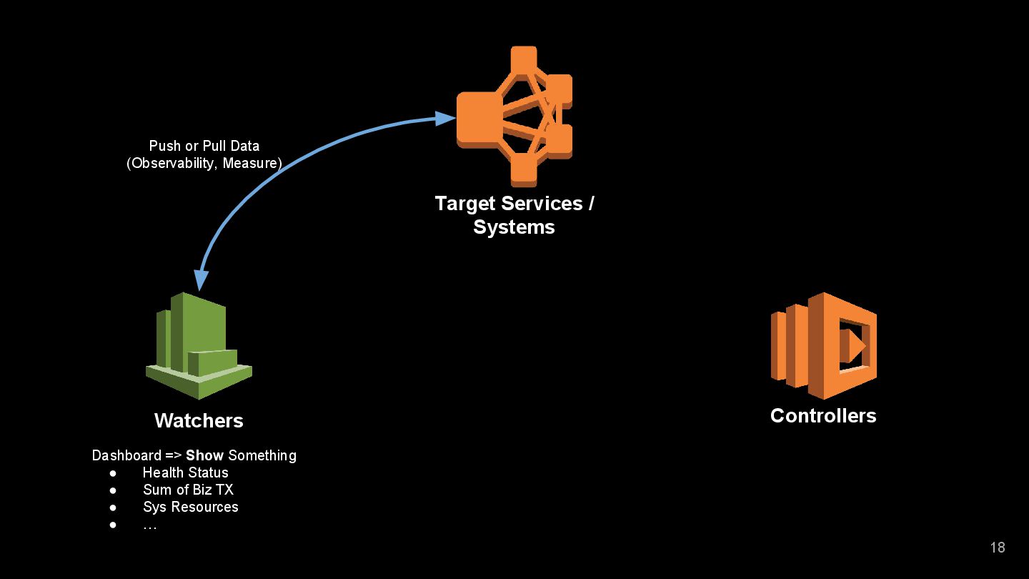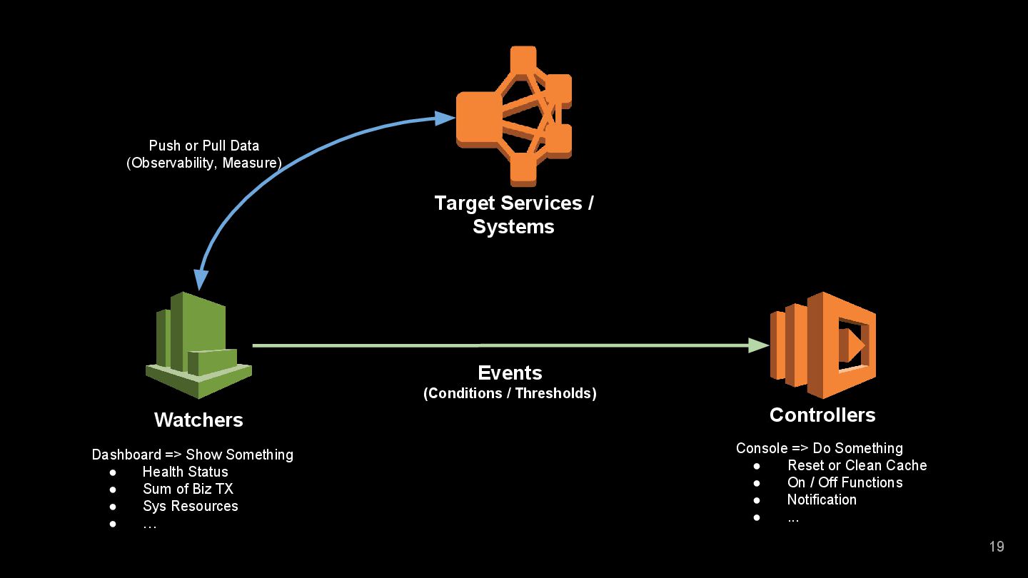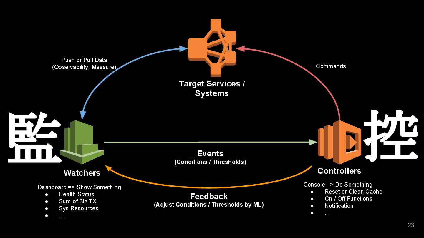 of Biz TX • Sys Resources • … 21 Target Services / Systems Watchers Controllers Events (Conditions / Thresholds) Console => Do Something • Reset or Clean Cache • On / Off Functions • Notification • ... Feedback (Adjust Conditions / Thresholds by ML) Push or Pull Data (Observability, Measure)