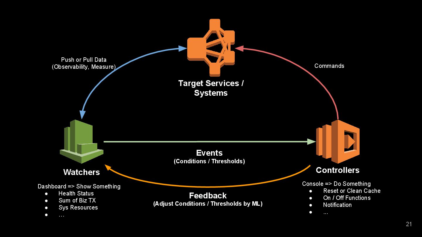 of Biz TX • Sys Resources • … 20 Target Services / Systems Watchers Controllers Events (Conditions / Thresholds) Console => Do Something • Reset or Clean Cache • On / Off Functions • Notification • ... Push or Pull Data (Observability, Measure)
