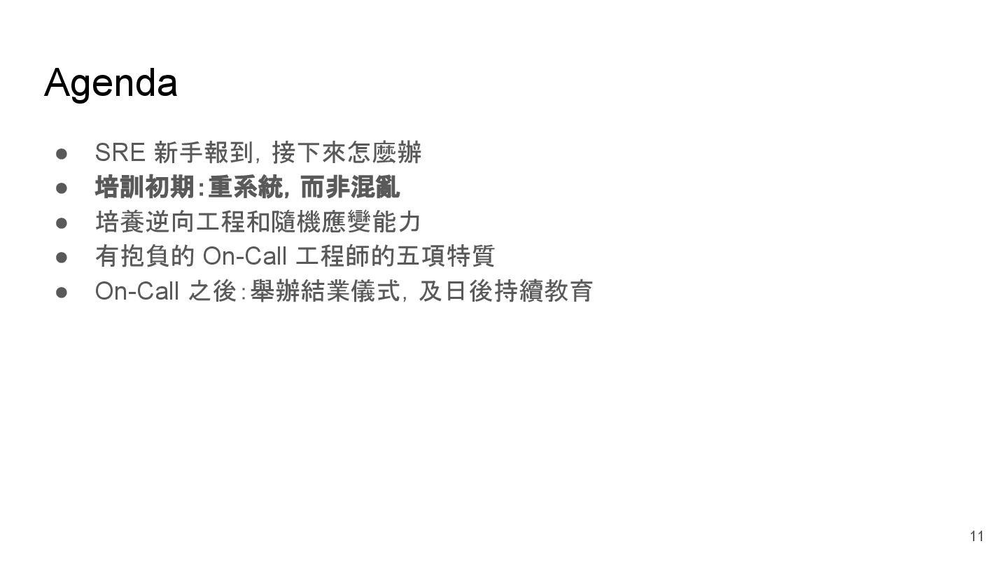 Agenda • SRE 新手報到,接下來怎麼辦 • 培訓初期:重系統,而非混亂 • 培養逆向工程和隨機應變能力 • 有抱負的