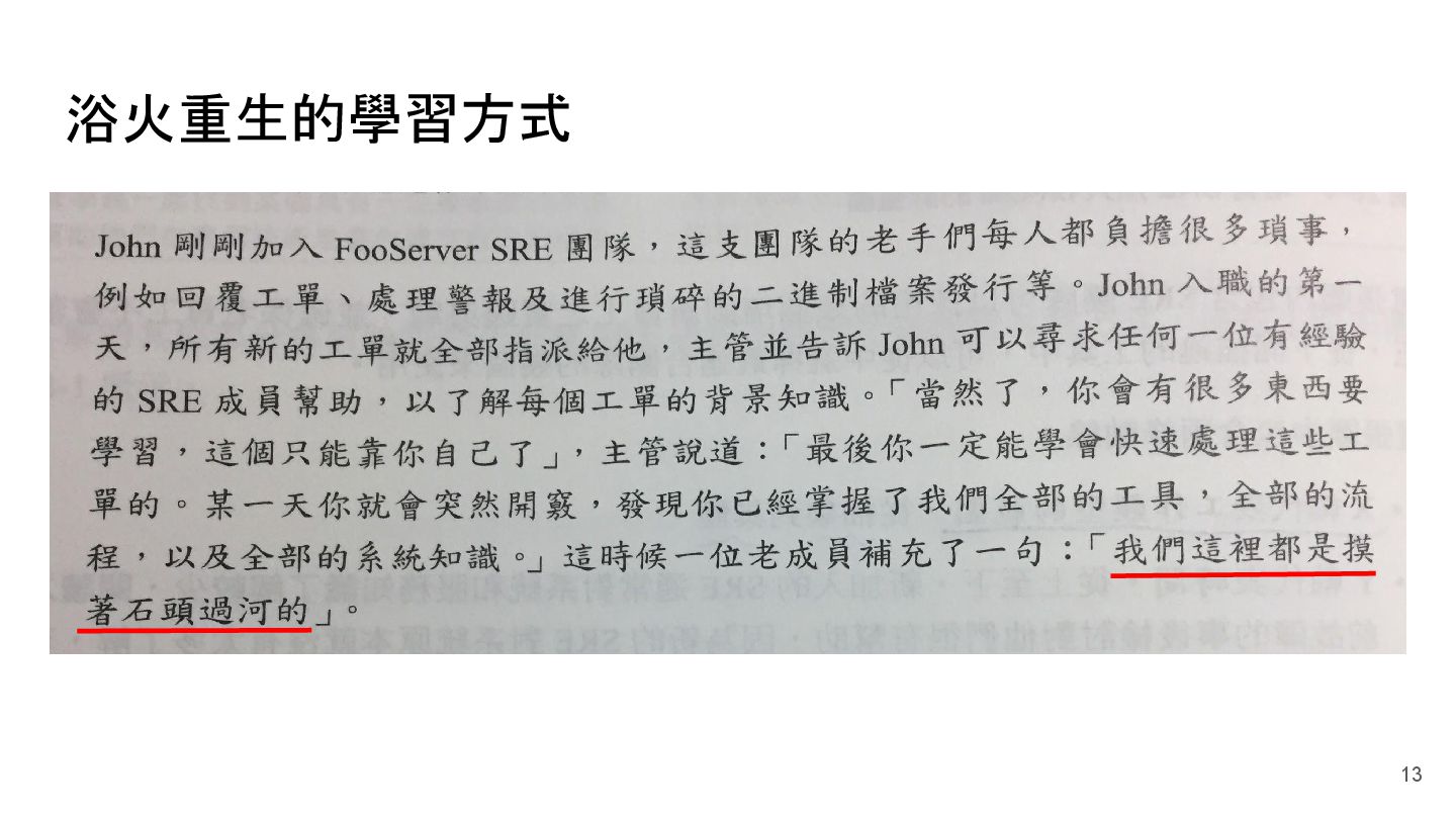 要有完整且真實的 QA 環境,作為訓練使用 ◦ 練習活動:『一起來摧毀一組搜尋叢集』 • 文件維護是學徒任務的一部分 ◦ 學員:了解維運的範圍、運作原理 ◦ 教練、管理者:透過檢核表反應學員學習進度、不了解的地方 ◦ 其他團隊:文件是社交契約 • 儘早、盡快見習 On-Call ◦ 見習 (Shadow) 是培養學員進度的好機會 ◦ 促進團隊相互了解、信任 ◦ 重大異常時,事後檢討應該由全部 On-Call 一起完成,讓新手參與