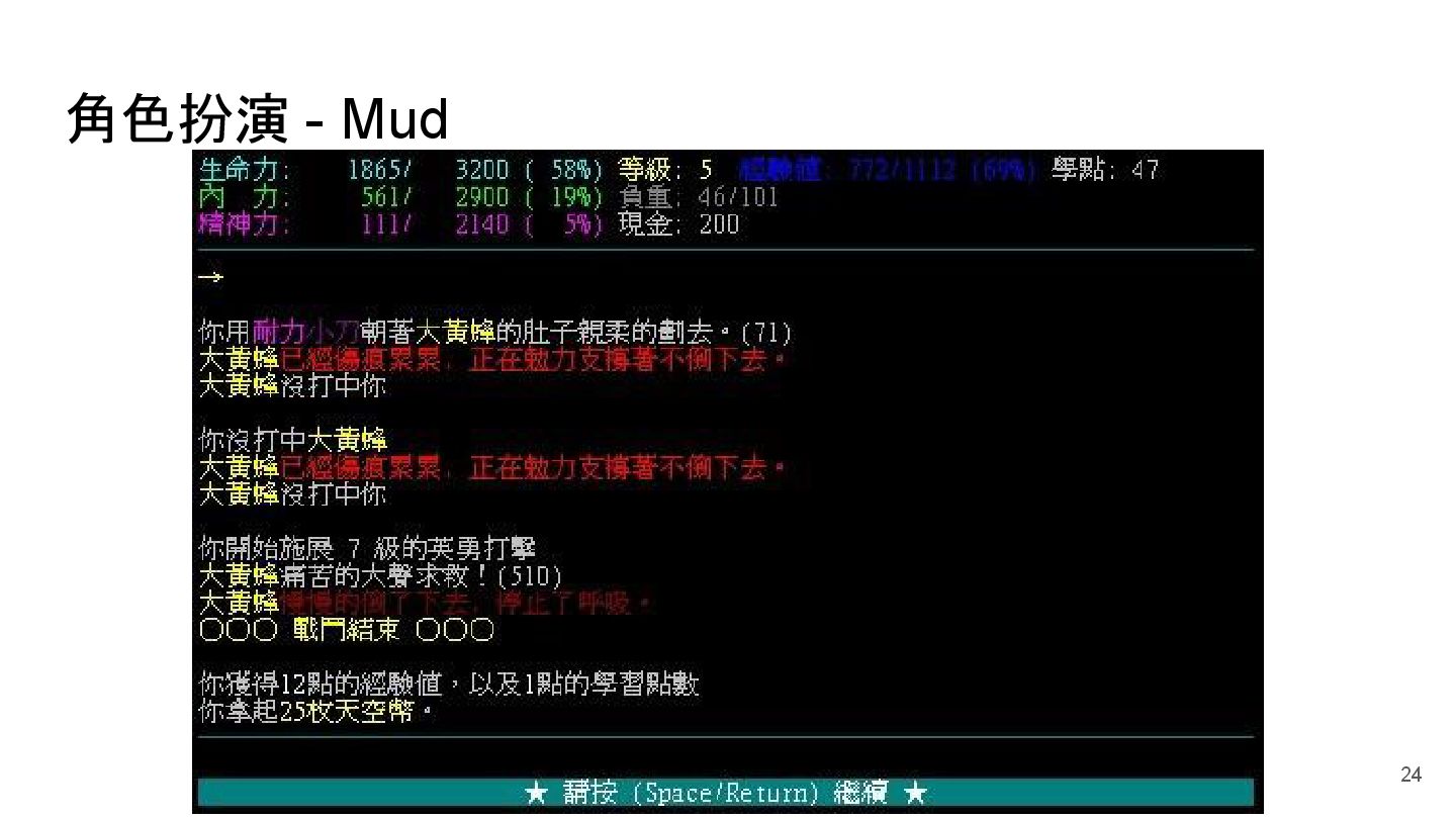 ◦ 每週會議上,指定某個成員 A 來現場處理某個故障情境 ◦ 就像參加電視娛樂節目,A 要跟主持人提出問題,主持人告訴行動結果 ◦ 給予活動命型:厄運之輪 (Wheel of Misfortune)、走條木 (Walk the Plank) 五項特質 23