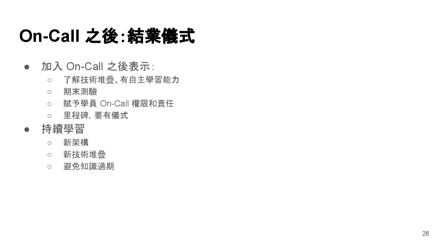 • 加入 On-Call 之後表示: ◦ 了解技術堆疊、有自主學習能力 ◦ 期末測驗 ◦ 賦予學員