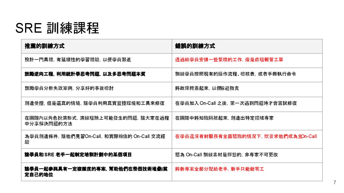 推薦的訓練方式 錯誤的訓練方式 設計一門具體,有延續性的學習體驗,以便學員跟進 透過給學員安排一些繁瑣的工作,像是處理報警工單 鼓勵逆向工程,利用統計學思考問題,以及多思考問題本質 訓練學員按照現有的操作流程、檢核表,或者手冊執行命令 鼓勵學員分析失敗案例,分享好的事後檢討 將故障掩蓋起來,以便 躲避指責 創造受控,但是逼真的情境,讓學員利用真實監控環境和工具來修復